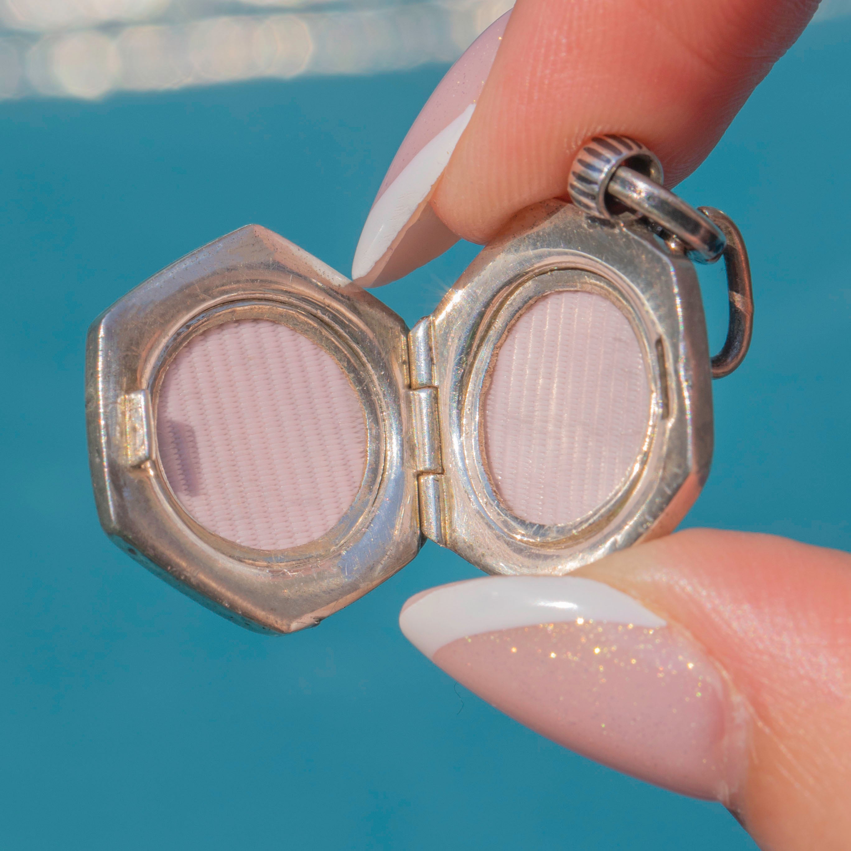 VERY GOOD-EXCELLENT: This antique Niello hexagonal locket is in wonderful condition. The locket has kept its form well, with no dings or dents, and the Niello is pristine which is impressive considering the locket's grand age! There is some wear inside the locket, but this is minimal and does not impact the integrity of the piece. Closing securely with a "click" you can use and wear this outstanding piece of Gustav Hauber jewellery with absolute confidence!