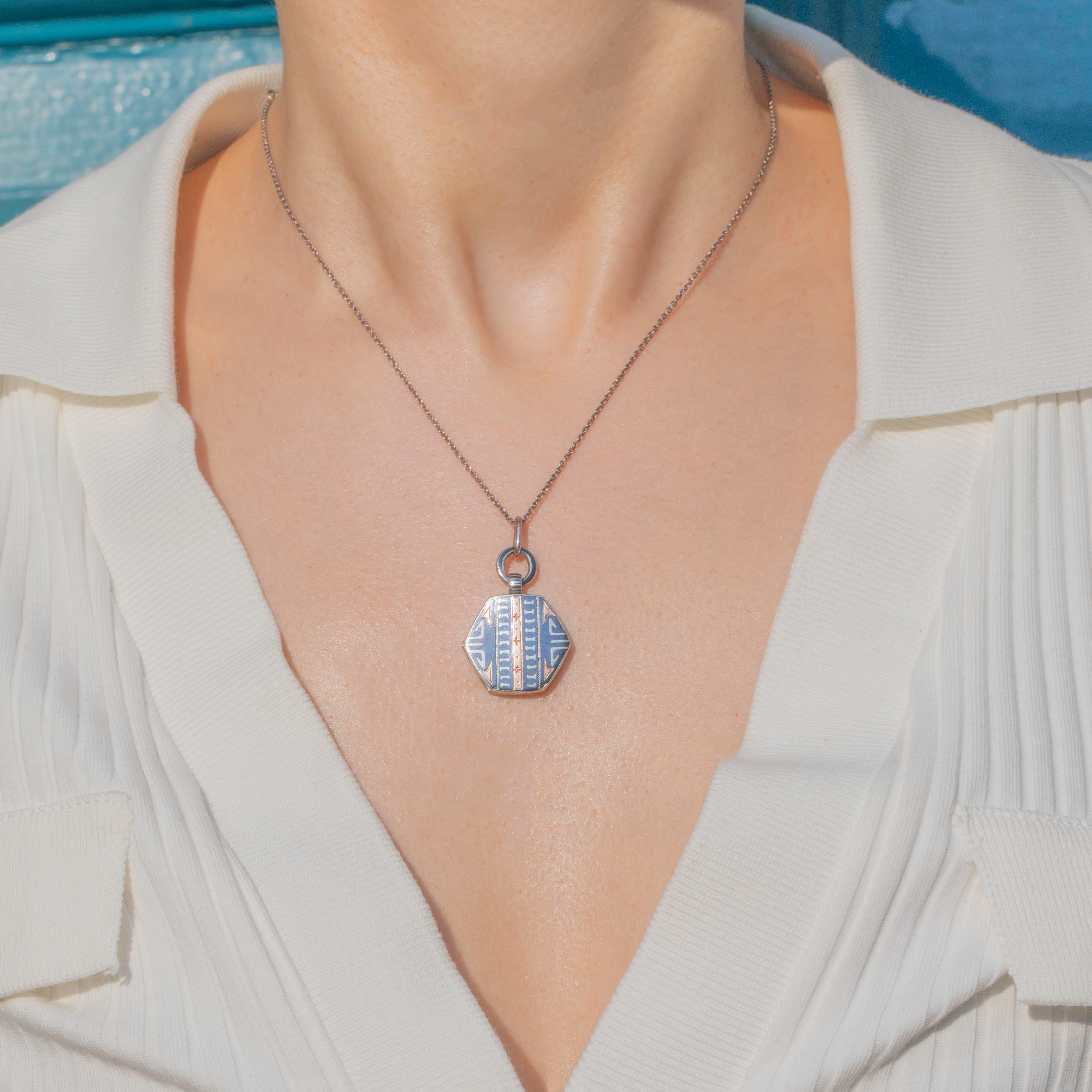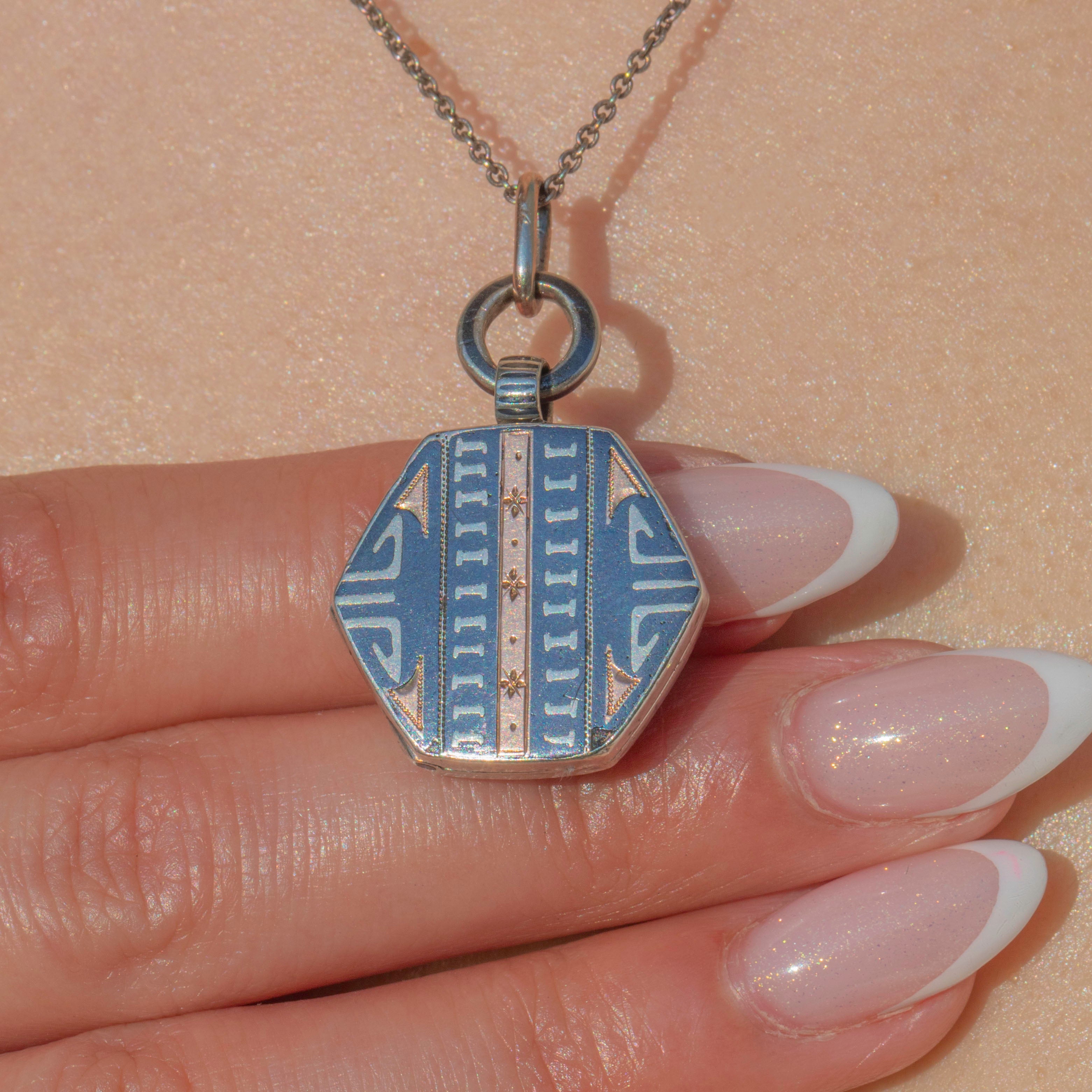Crafted from 800 Silver with 9ct Gold accents and inlaid with Niello in a stylistic geometric design, this bold antique locket will make an impact suspended from a fine chain across your décolletage. Opening to reveal two frames, this Victorian Niello locket will make the perfect abode for your most cherished memories!