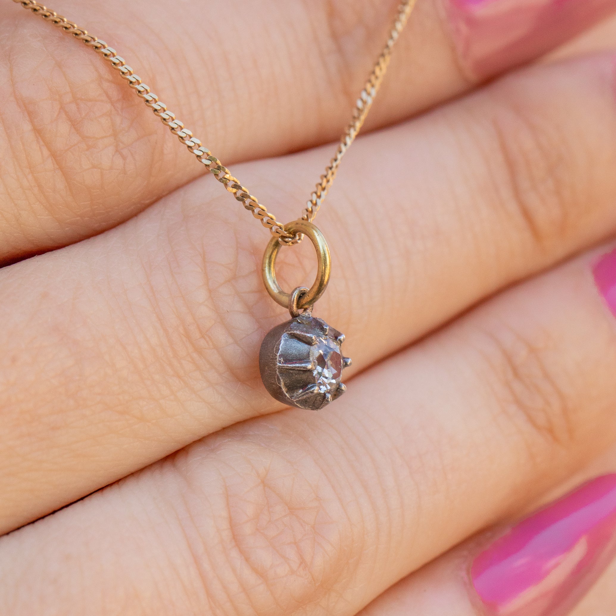 VERY GOOD-EXCELLENT. This Victorian old-mine cut Diamond charm is in lovely condition! Although the Diamond has one small fleabite, only notable under a jeweller's loupe, her sparkle is sensational and she is securely set, guaranteed to last a lifetime. The Diamond is radiant as ever, which is incredible considering her age. Need we say more?!