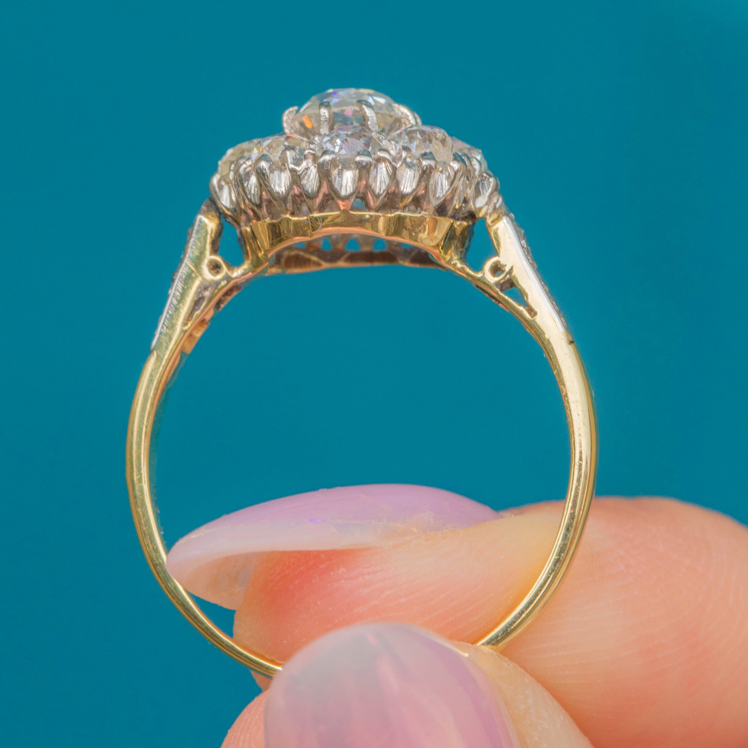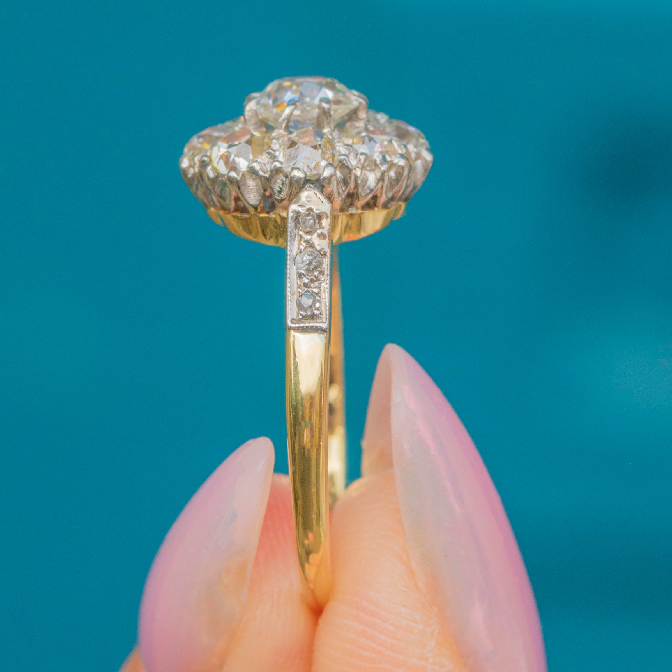 Victorian Diamond rings are quintessentially glamorous, and this piece is no exception. Each Diamond is set within lustrous Platinum settings and rests on a buttery warm 18ct Gold band, ensuring decadence in abundance. She is complete with three petite Diamonds flanking either shoulder for a sparkly finishing touch!
