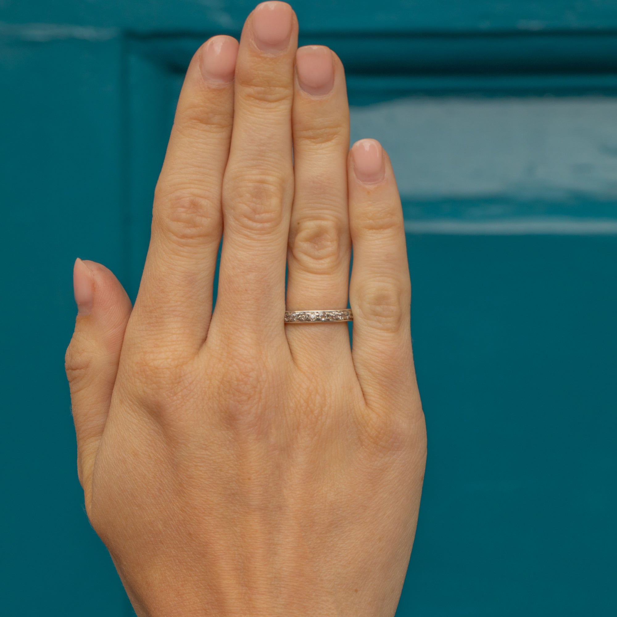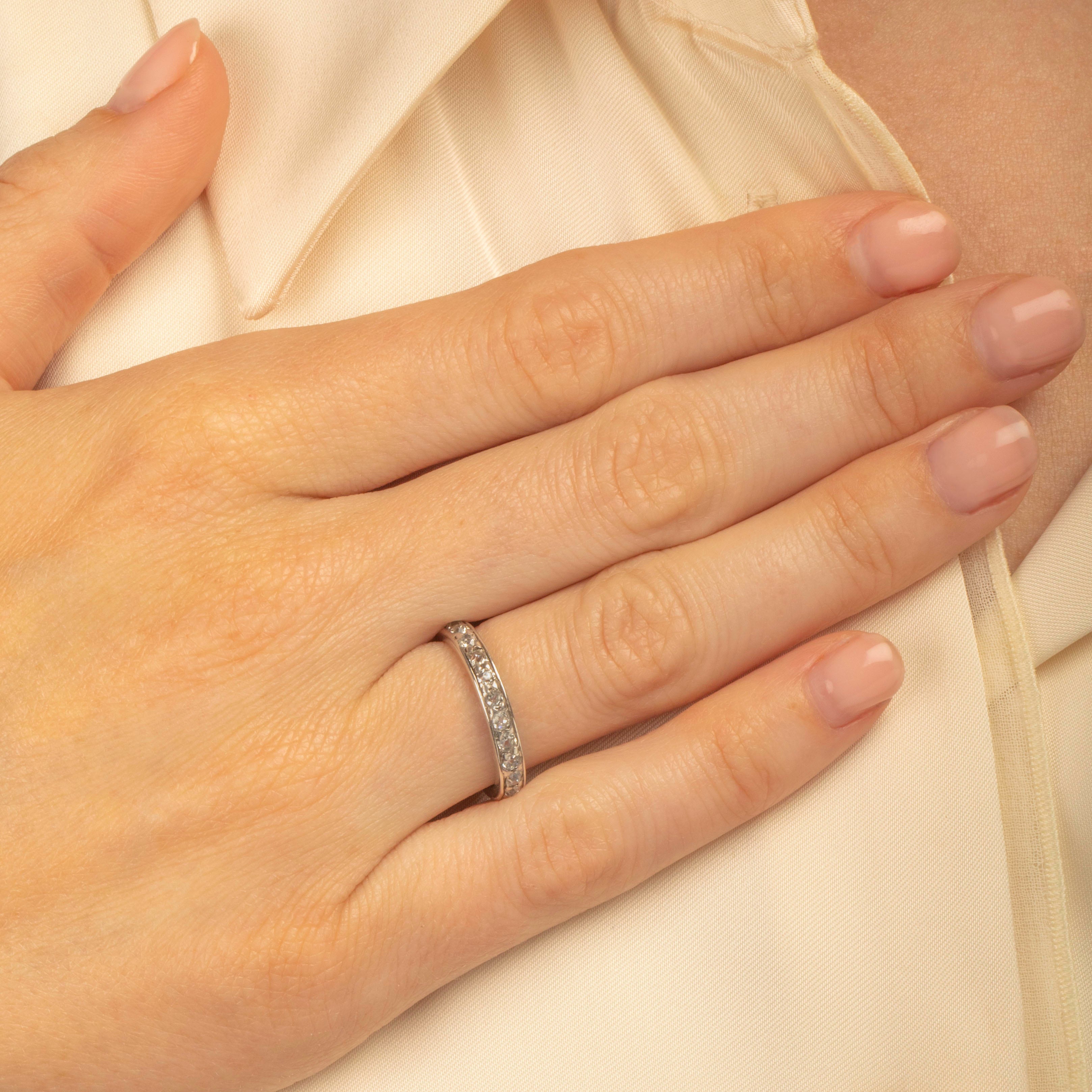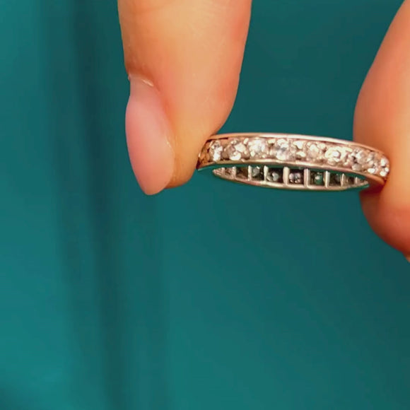 EXCELLENT. This antique Old-Mine-Cut Diamond eternity ring is in excellent condition. The Silver is lustrous and the Diamonds are all secure within their settings; she will make a fine addition to your collection!