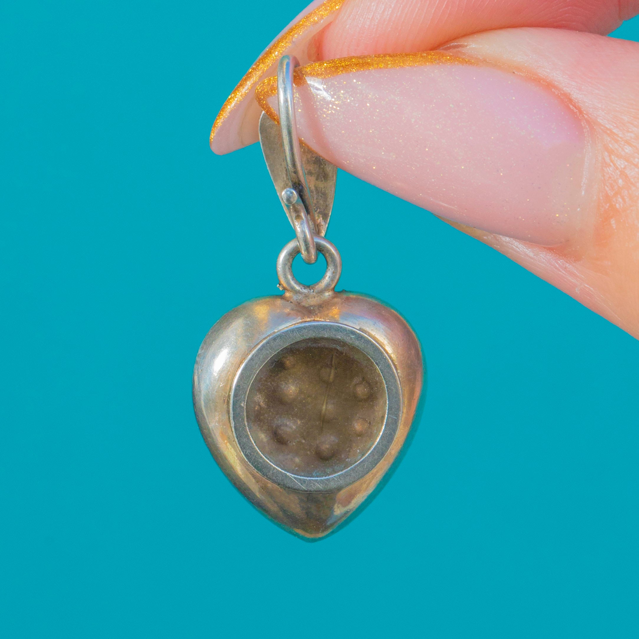 The charm is fitted with a generously sized, Turquoise-set bale and opens at the back to reveal a locket compartment, perfect for a cherished keepsake. Crafted in Silver and beautifully proportioned, it wears gracefully on any chain and brings a delightful pop of antique colour to your daily styling.