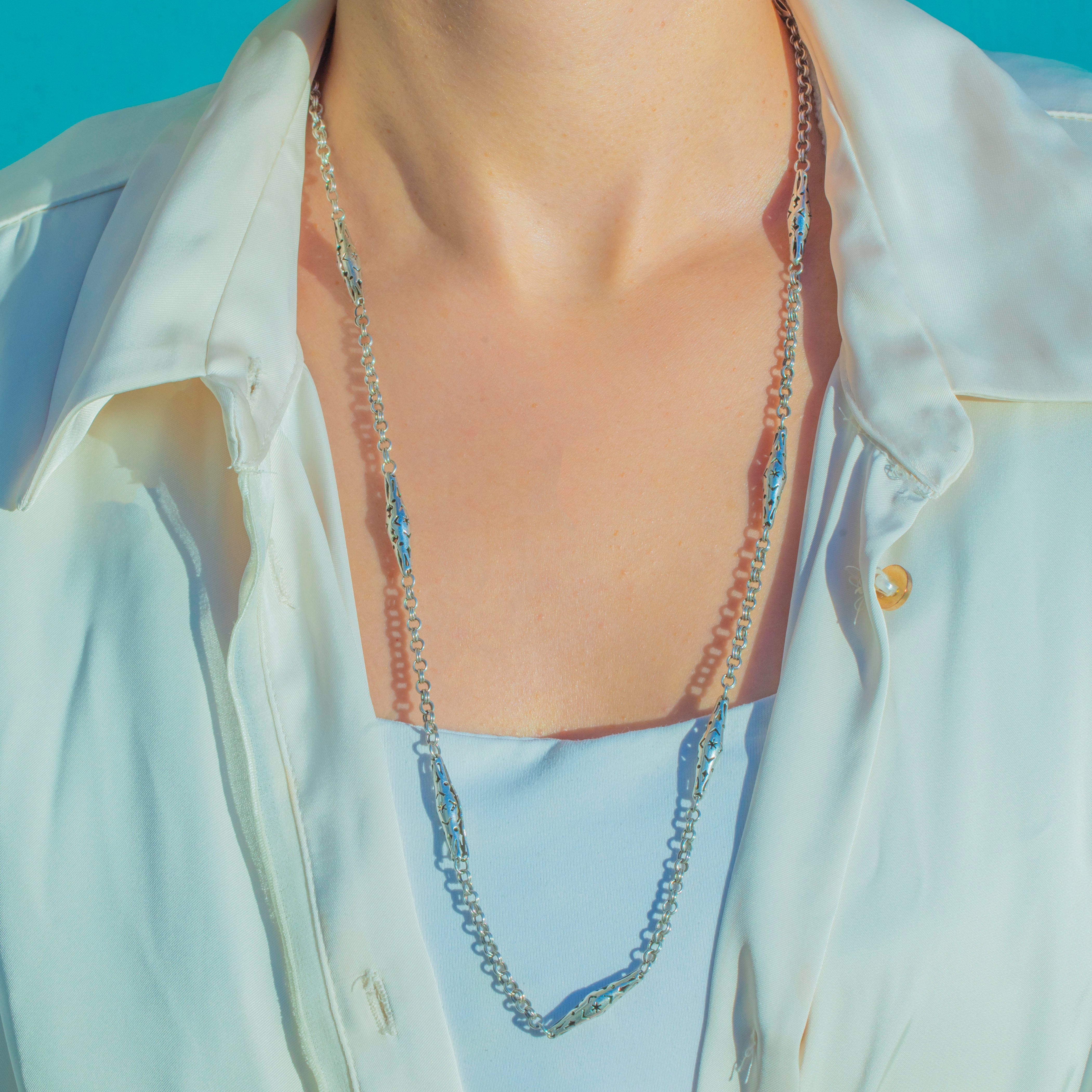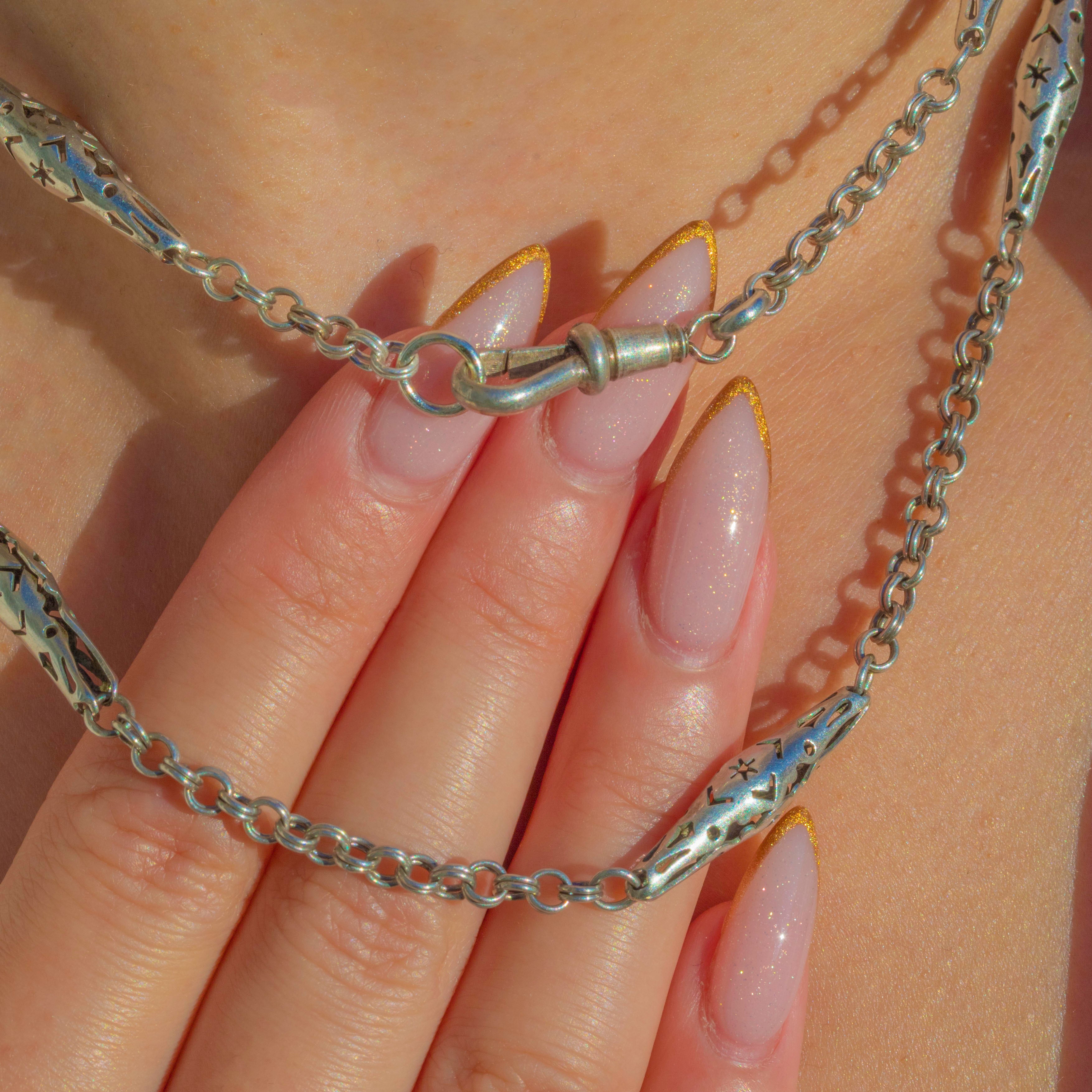 This Victorian Silver chain necklace is full of character, showcasing beautifully formed lozenge links with striking pierced star motifs. The star-cut panels bring a soft, celestial elegance, while the cool glow of the Silver gives the piece an effortlessly wearable, timeless feel.