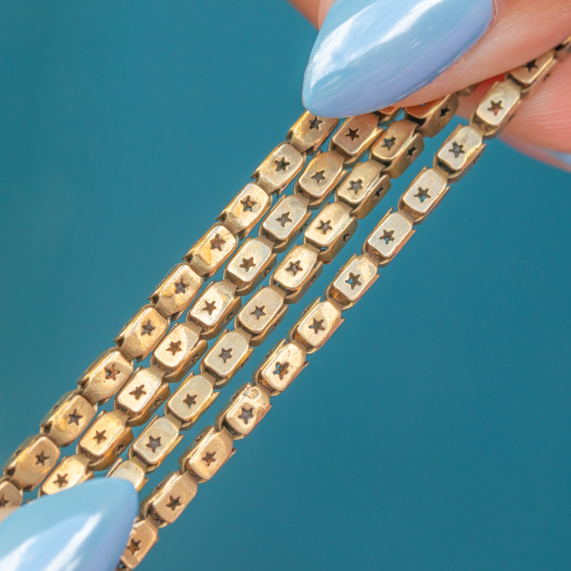 Measuring 28" in length and radiating warmth throughout, this antique longuard chain showcases beautifully pierced star links that add texture and a celestial allure. Finished with a highly coveted dog-clip, this antique chain exemplifies the fine craftsmanship of the Victorian era.