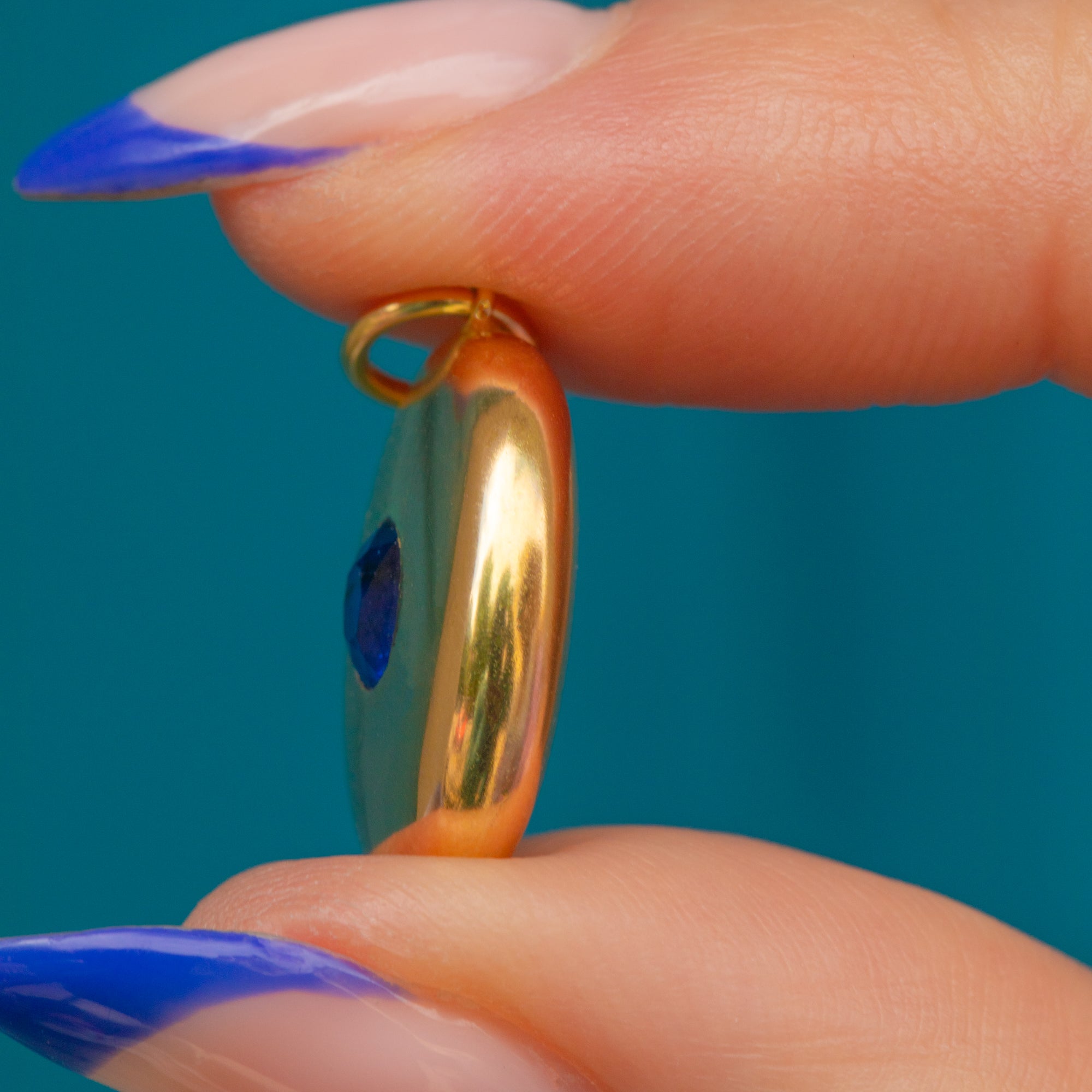 We can't get enough of this antique puffy 18ct Gold Sapphire charm! Mined in Sri Lanka and formally known as 'Ceylon', their Sapphires are renowned for having exquisitely vibrant colour and clarity, and that's exactly what this 0.45ct Sapphire nestled snuggly at the centre offers.