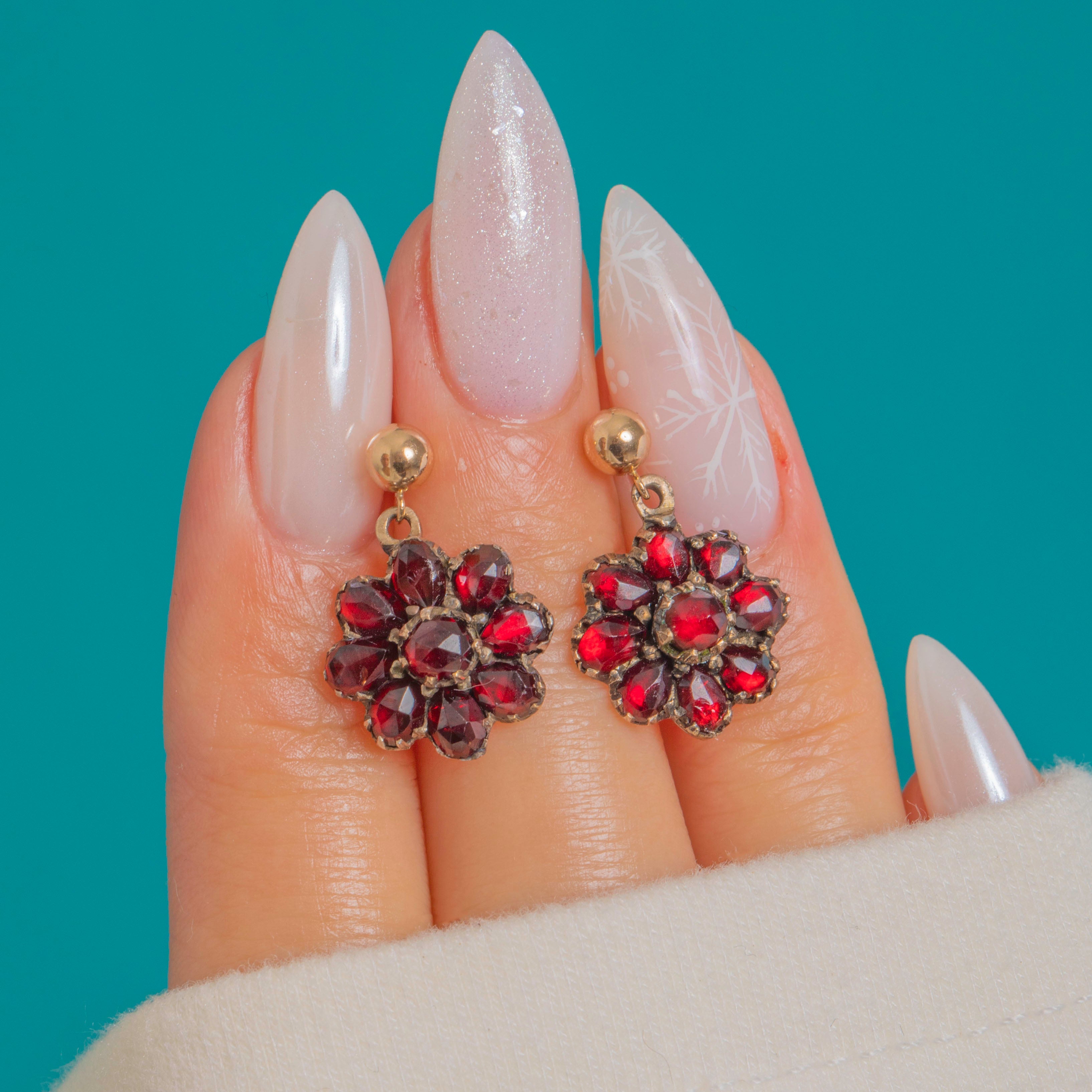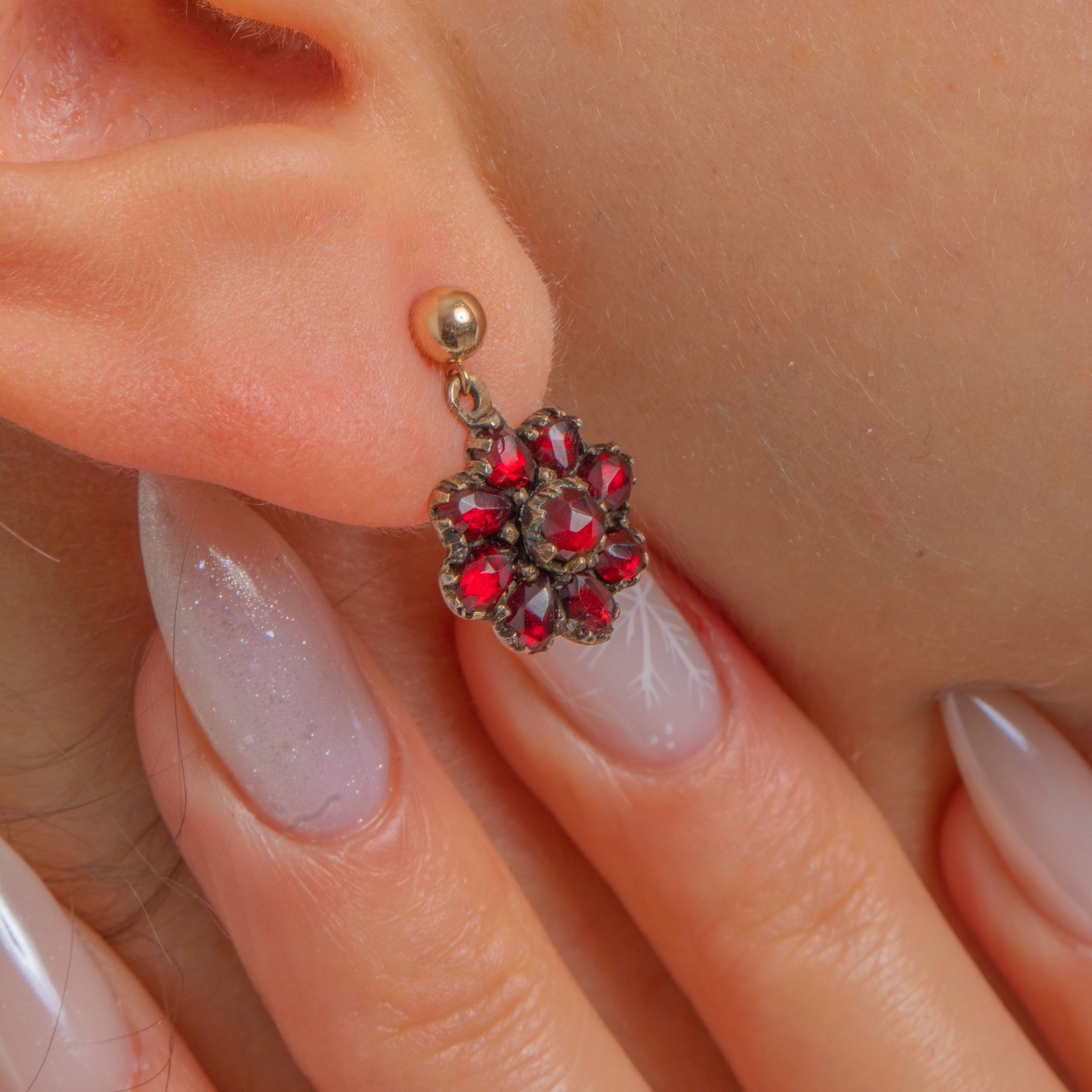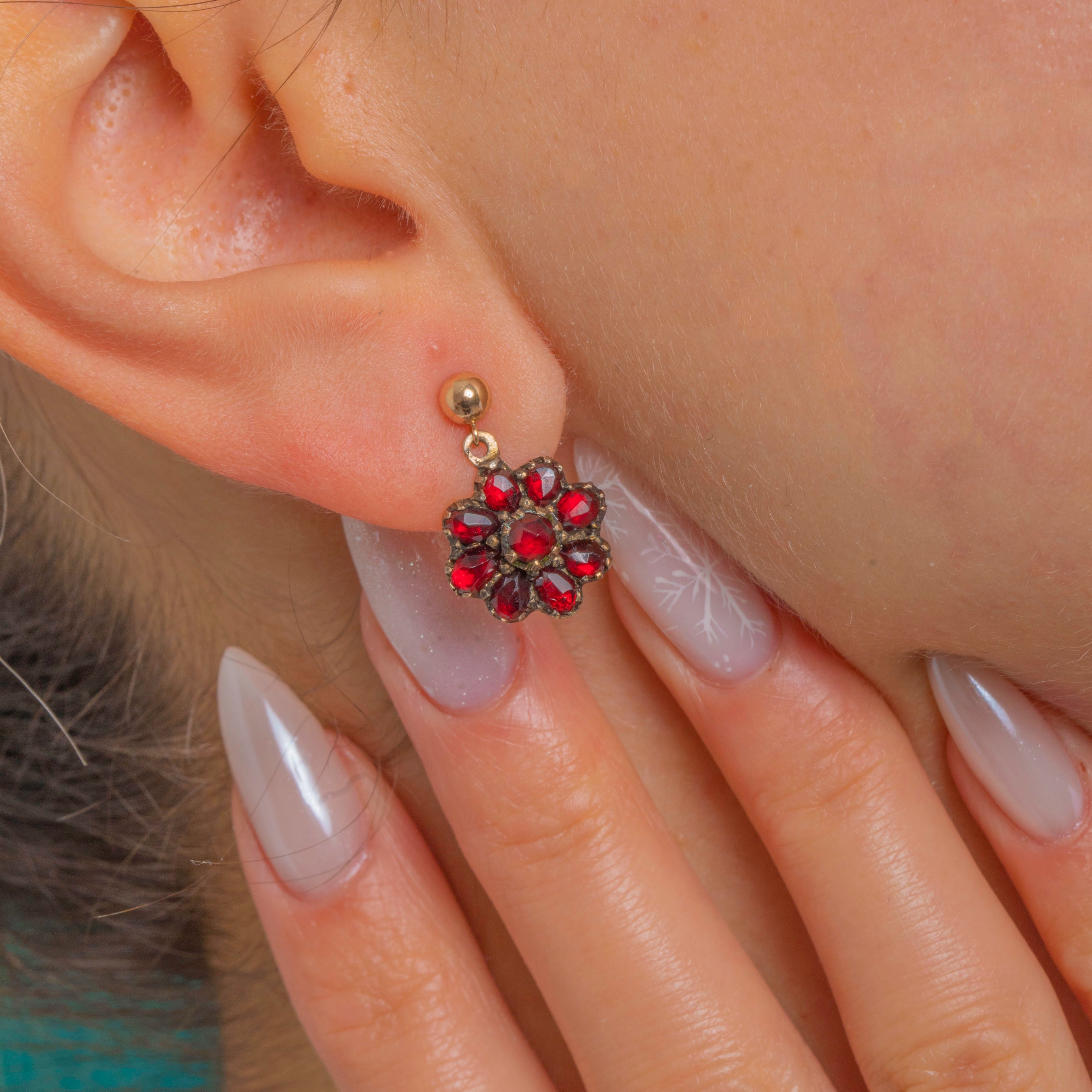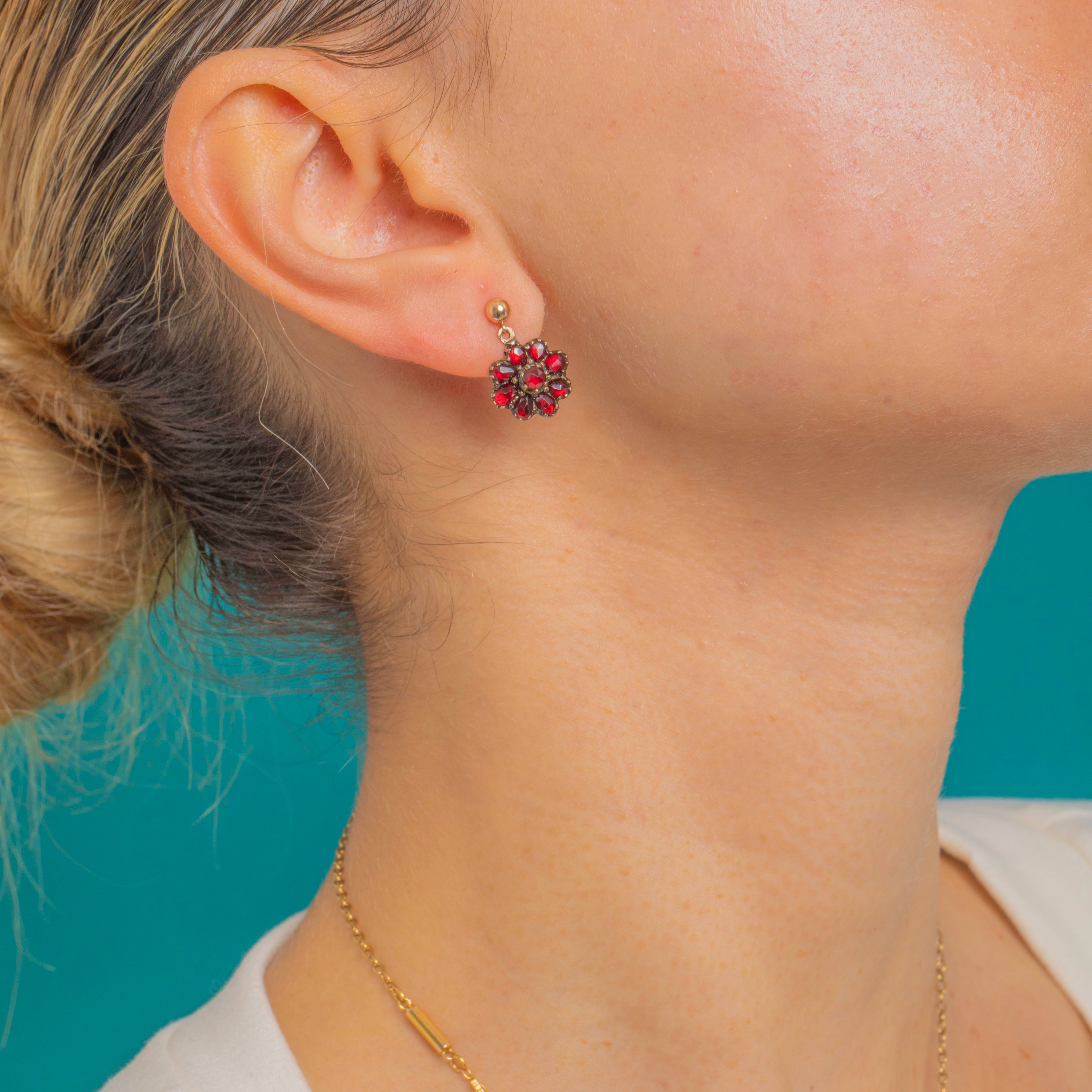 Petite and romantic, these Victorian Garnet cluster drops glow with deep crimson allure. Each domed rosette is formed from tightly set, rose-style faceted Garnets in dark, crimped collet settings, creating a charming floral silhouette with antique character.