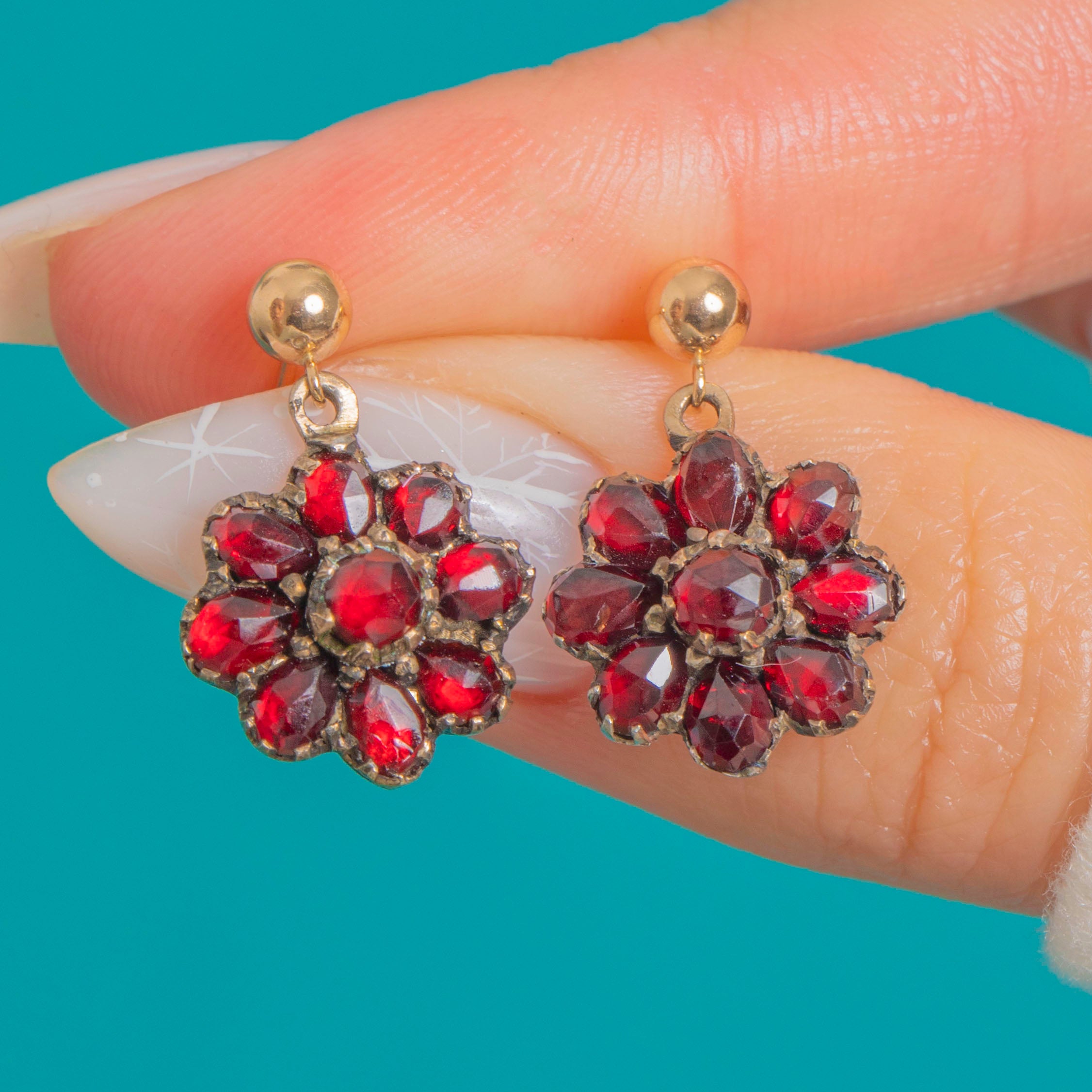 VERY GOOD: Garnets show small nicks and light facet abrasions under close inspection, with all stones present and secure. The antique settings display pleasing patina and darkening commensurate with age; solder is visible at the loop. Later 9ct Gold studs and butterfly backs are in good order, offering secure and comfortable wear.