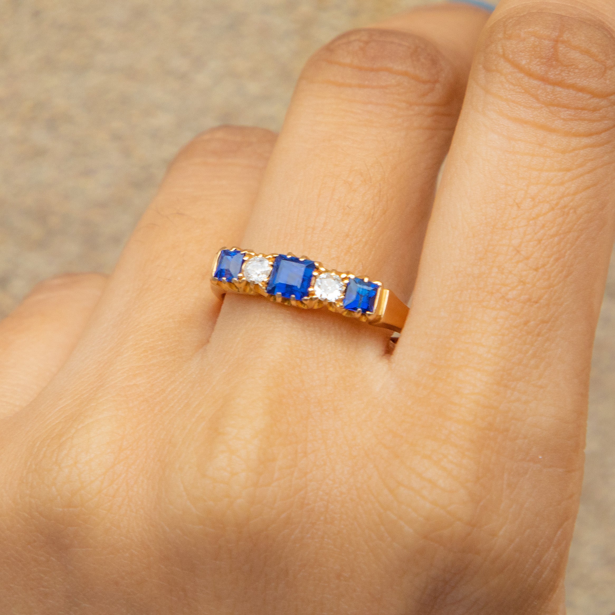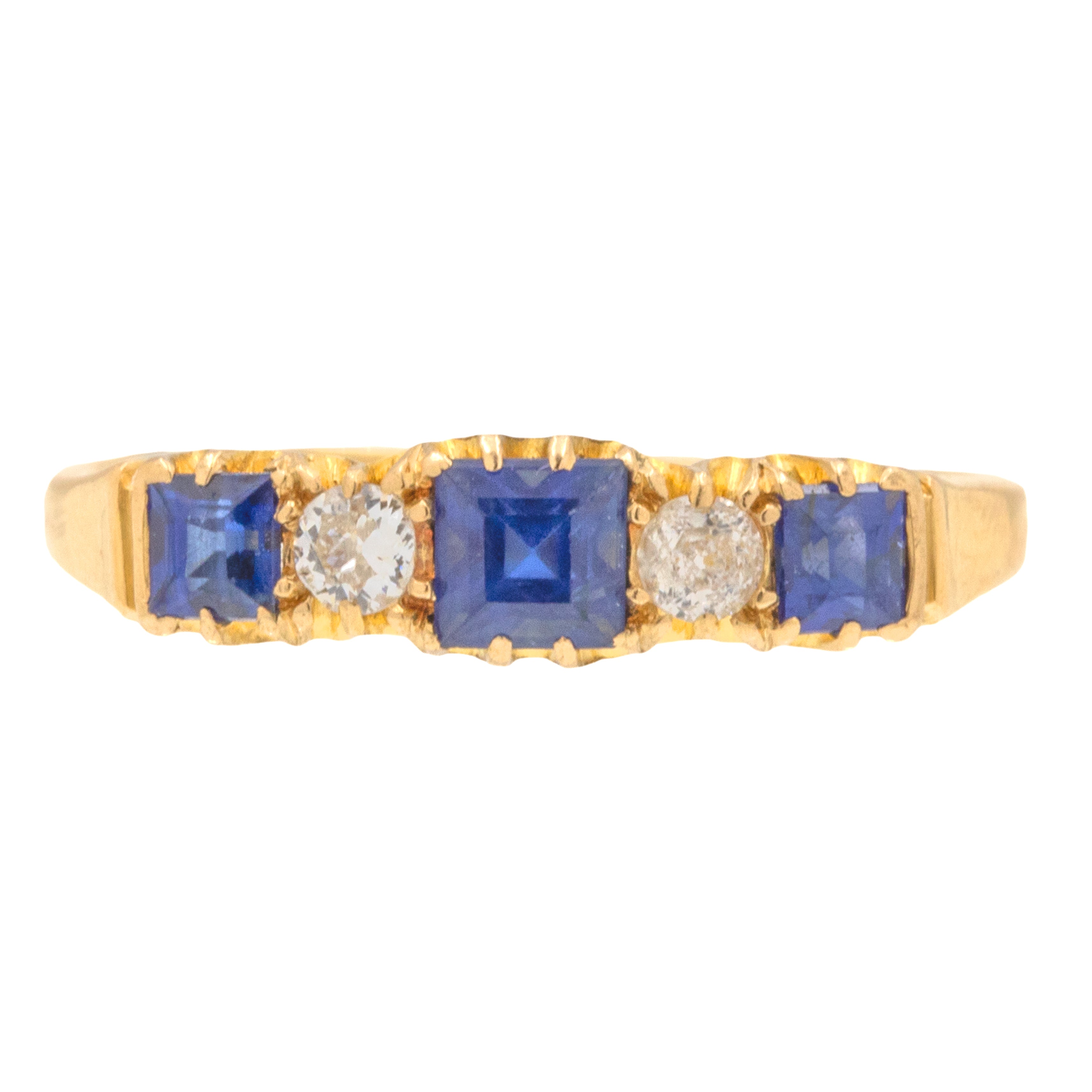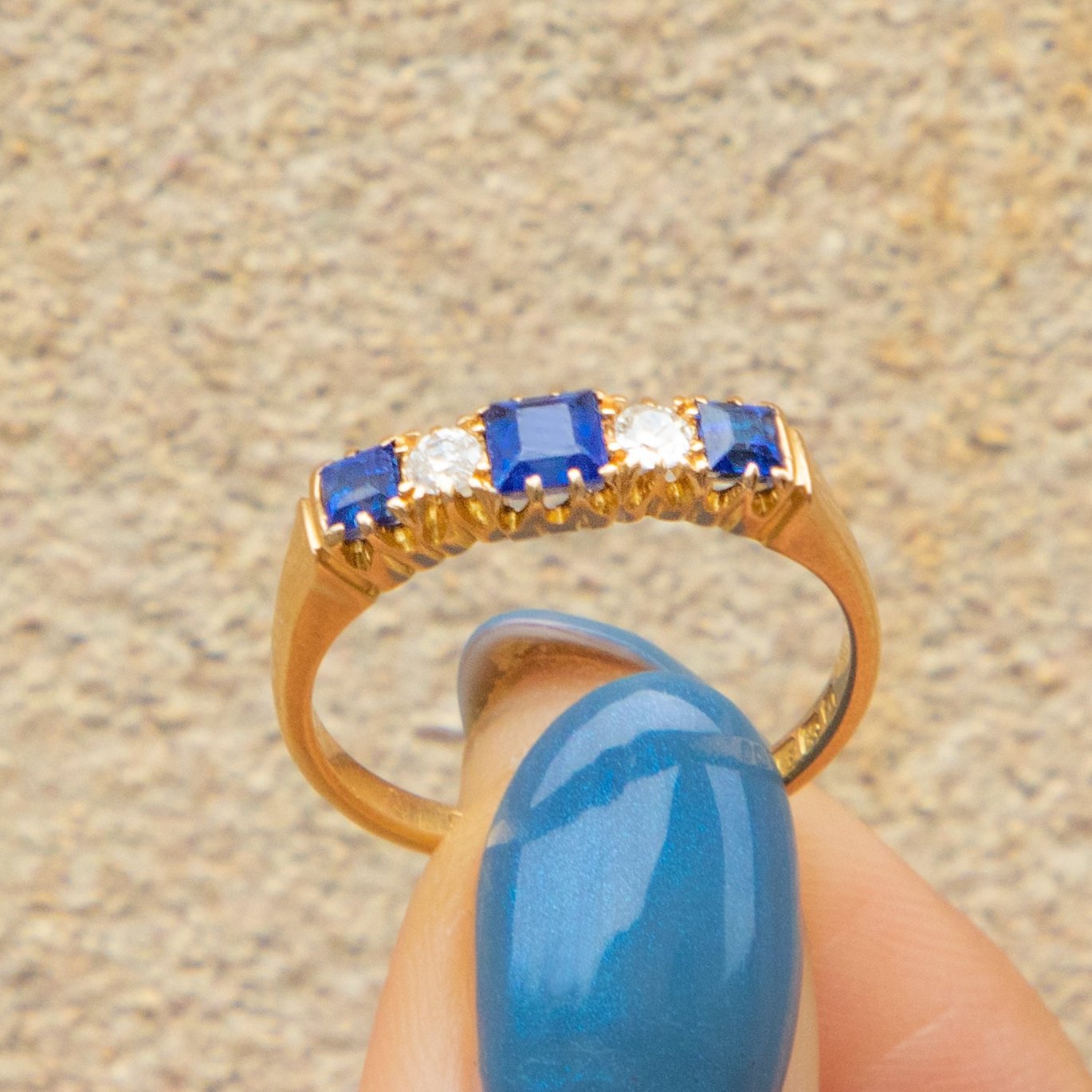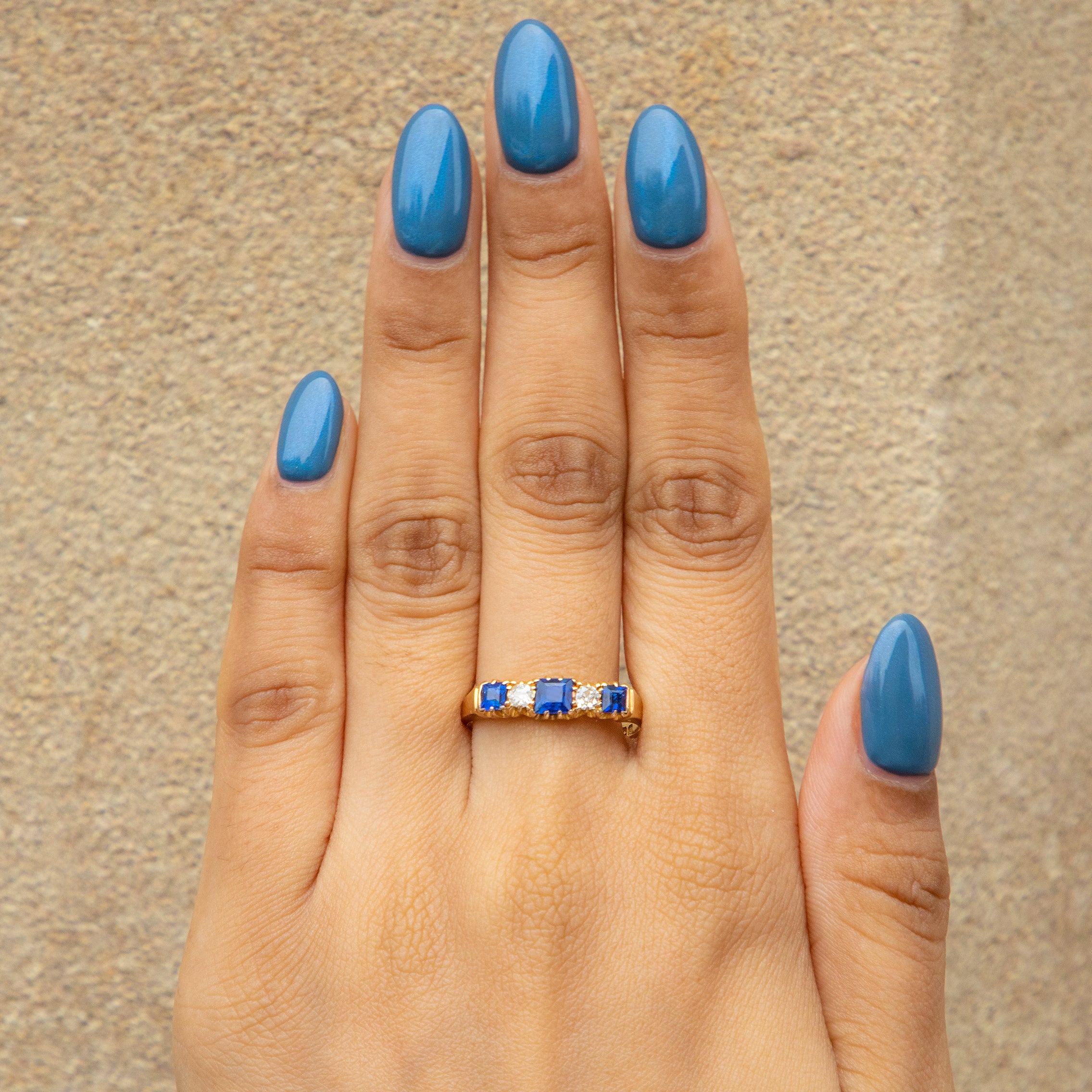 The square-cut Sapphires, with a combined weight of 1.00ct, exude deep blue hues and are accompanied by scintillating Diamonds creating a spectacular display as each facet catches the light. With a low profile, this antique five stone ring is ideal for everyday wear and would make the perfect choice for a unique engagement ring!