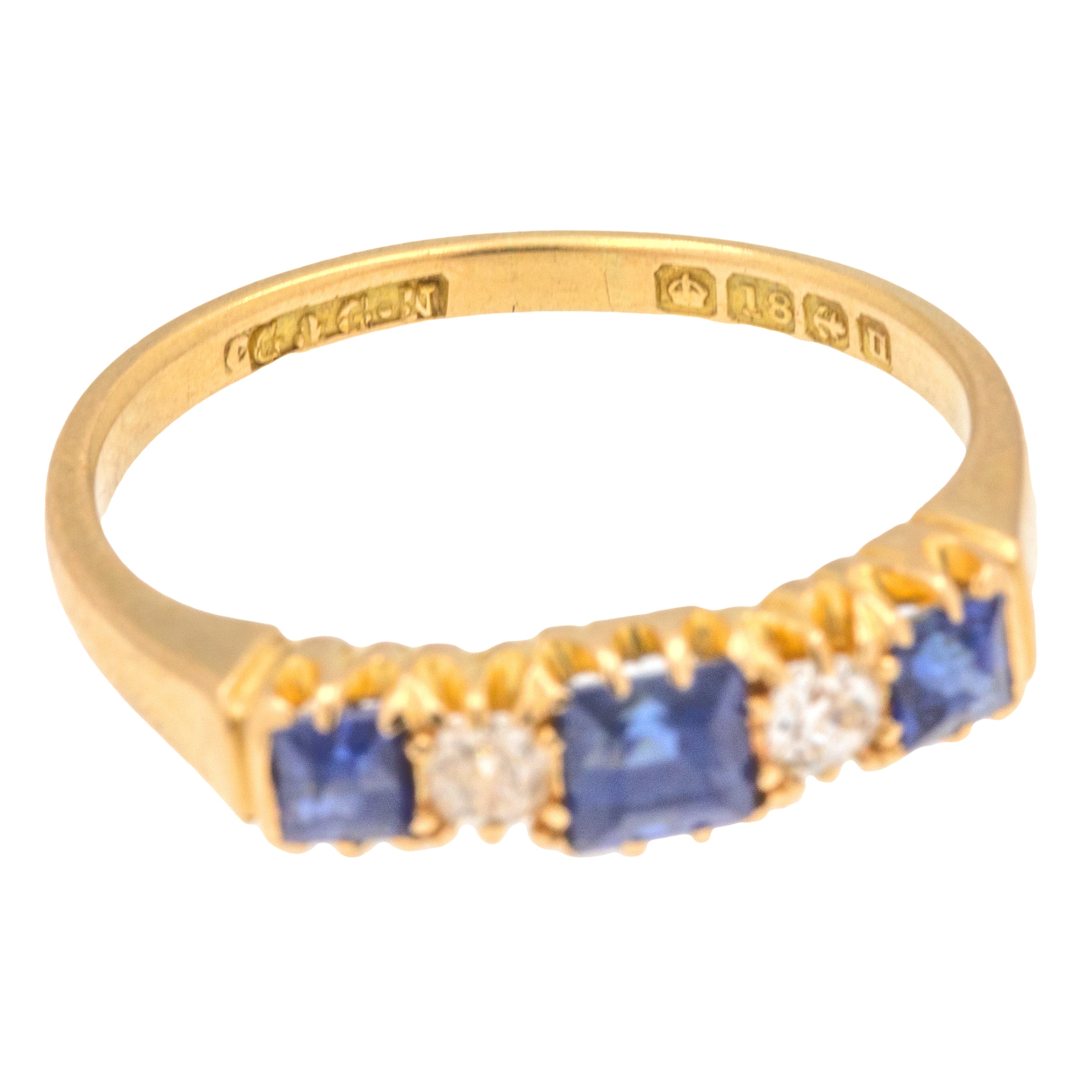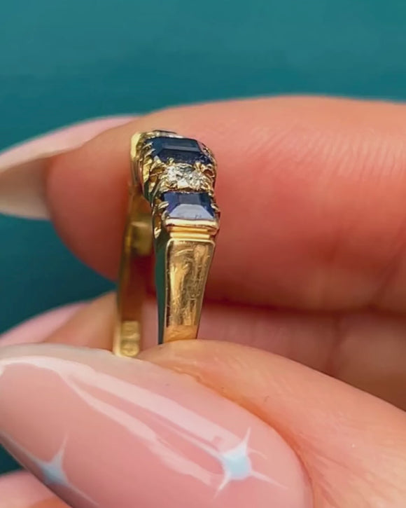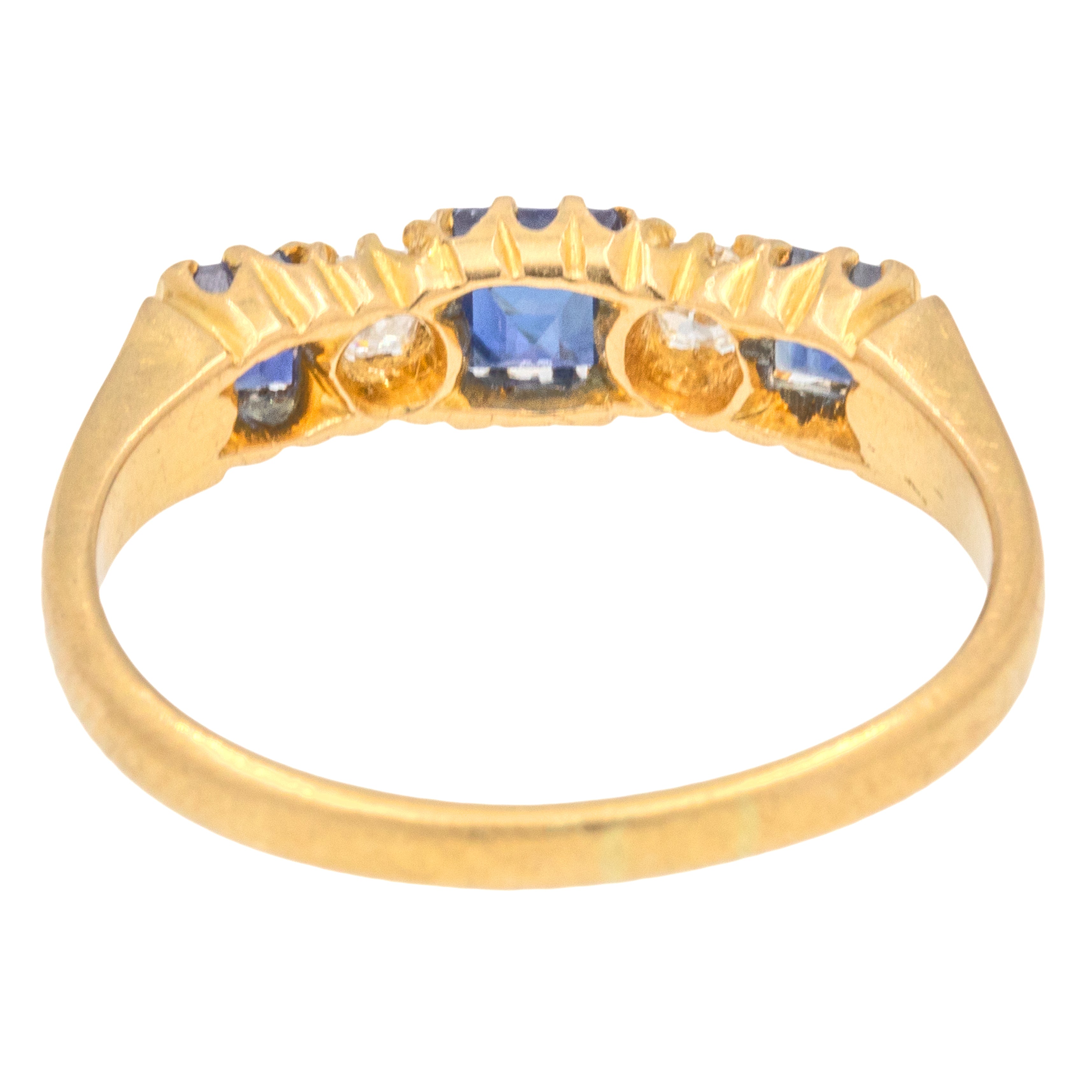 EXCELLENT. This antique 18ct Gold Sapphire Diamond five stone ring is offered in excellent condition. The Sapphires and Diamonds are securely held within their settings and are free from any chips or abrasions. The 18ct Gold band has retained its form well with only some minor surface wear, commensurate with age. With a full set of hallmarks allowing us to accurately date this antique Sapphire Diamond ring to 1919, she would make a wonderful addition to anyone's collection!