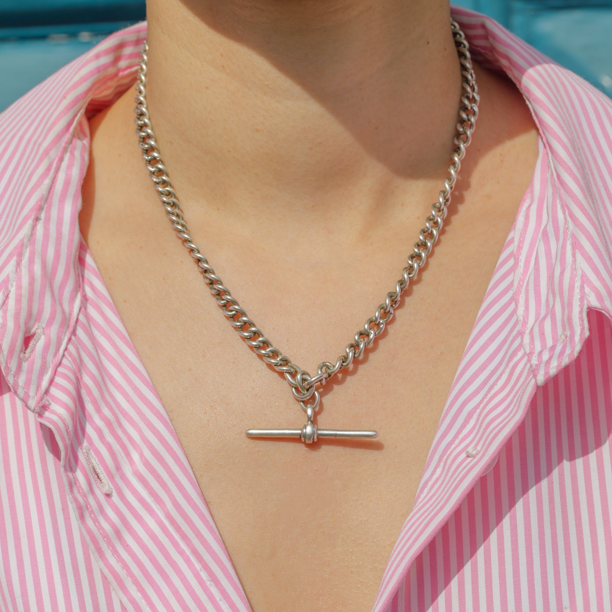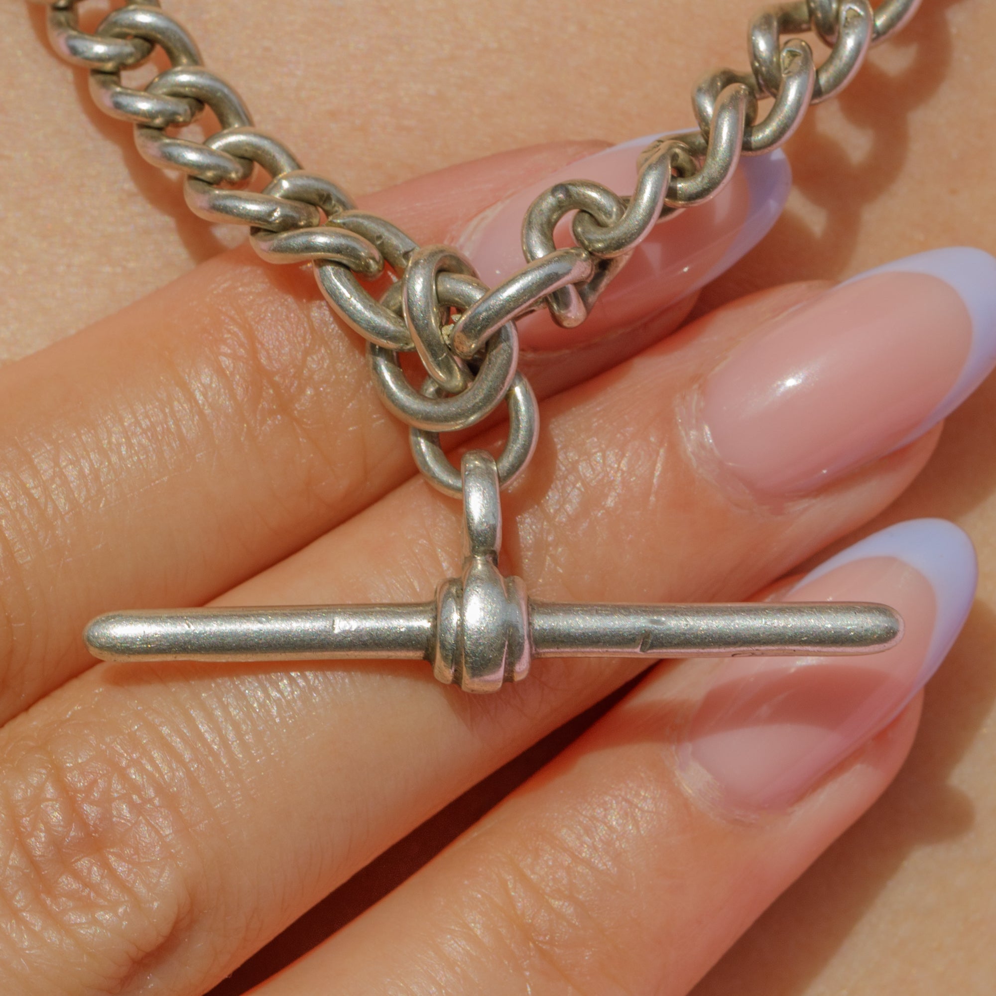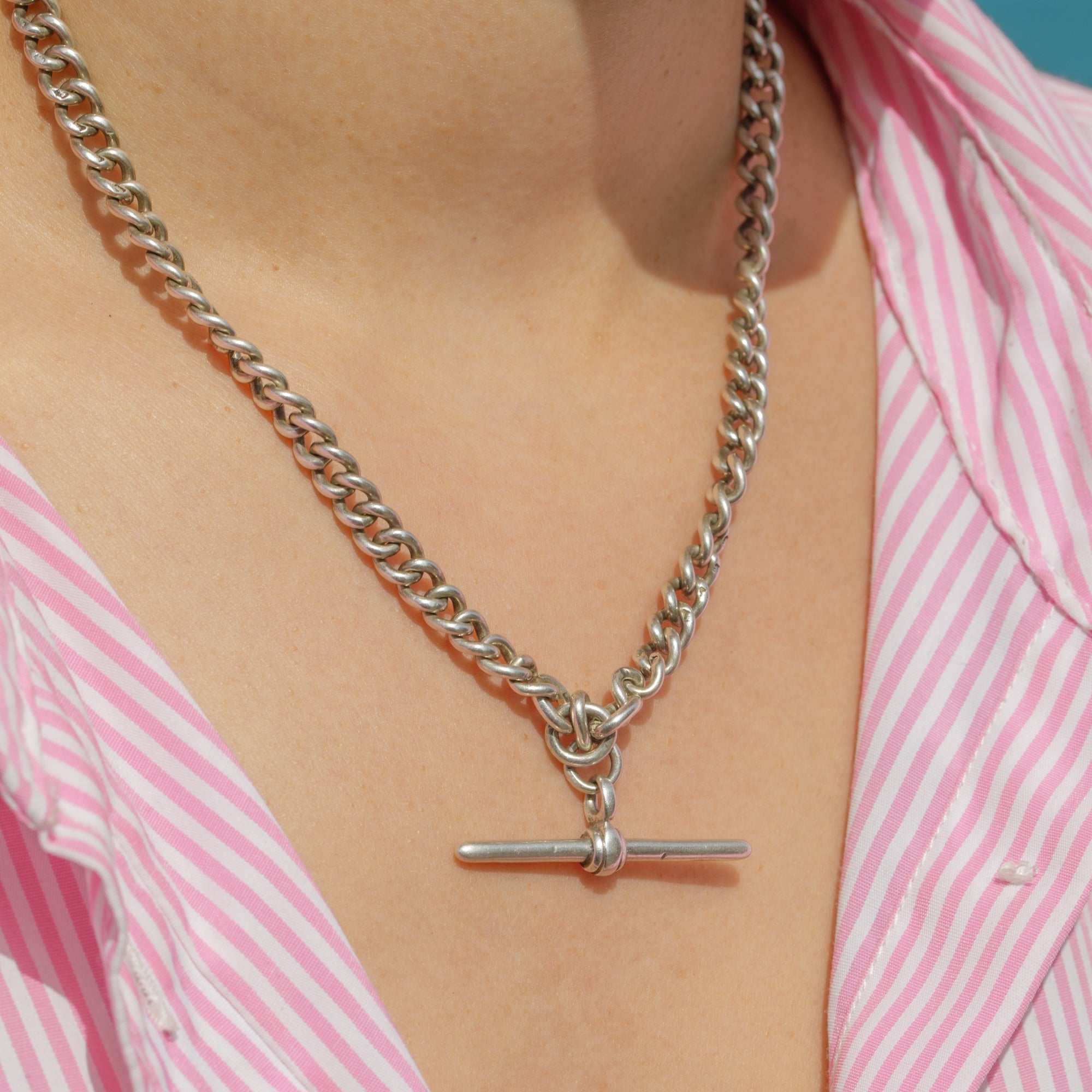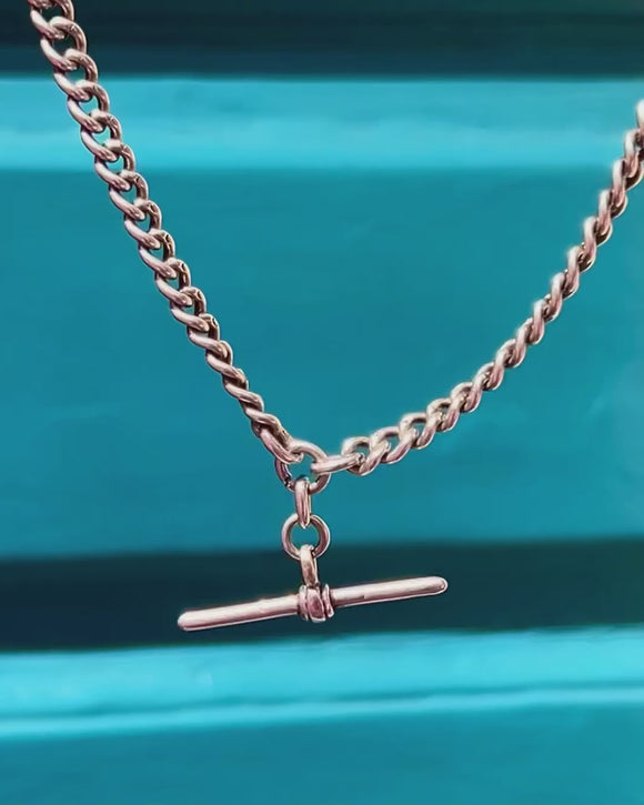 Add a chunky statement to your décolletage with this satisfying antique Silver Albert chain! The desirable 16-inch length is formed of neatly connected curb links that are fastened by two matching dog clips and suspend a fashionable t-bar between your collarbones.