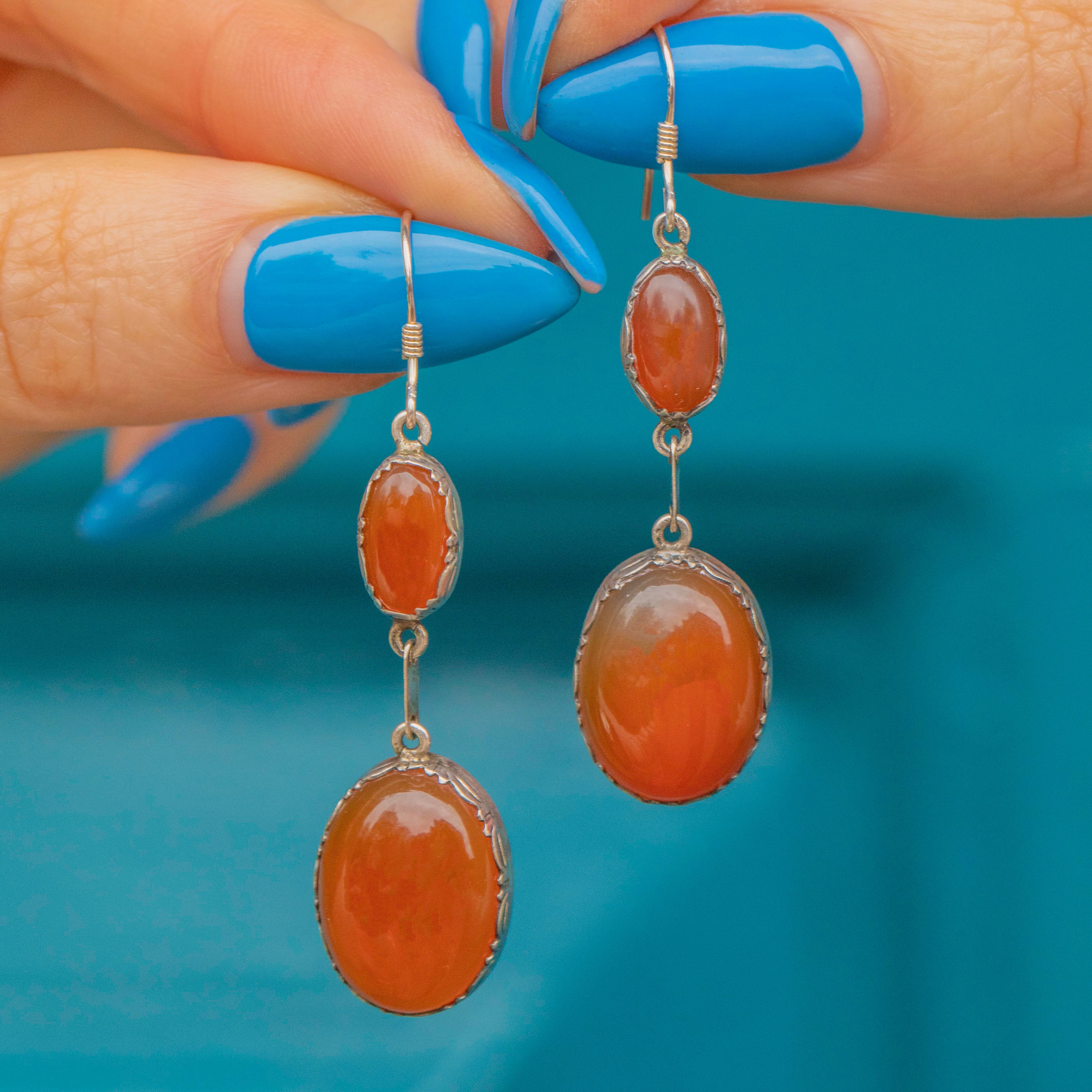 Crafted from supple Sterling Silver, these Victorian earrings each hold two vibrant Carnelians, radiating the most gorgeous rich honey-amber hues. Each Carnelian Cabochon is set securely within an intricately detailed Silver bezel and suspend from your lobes with a graceful swing.