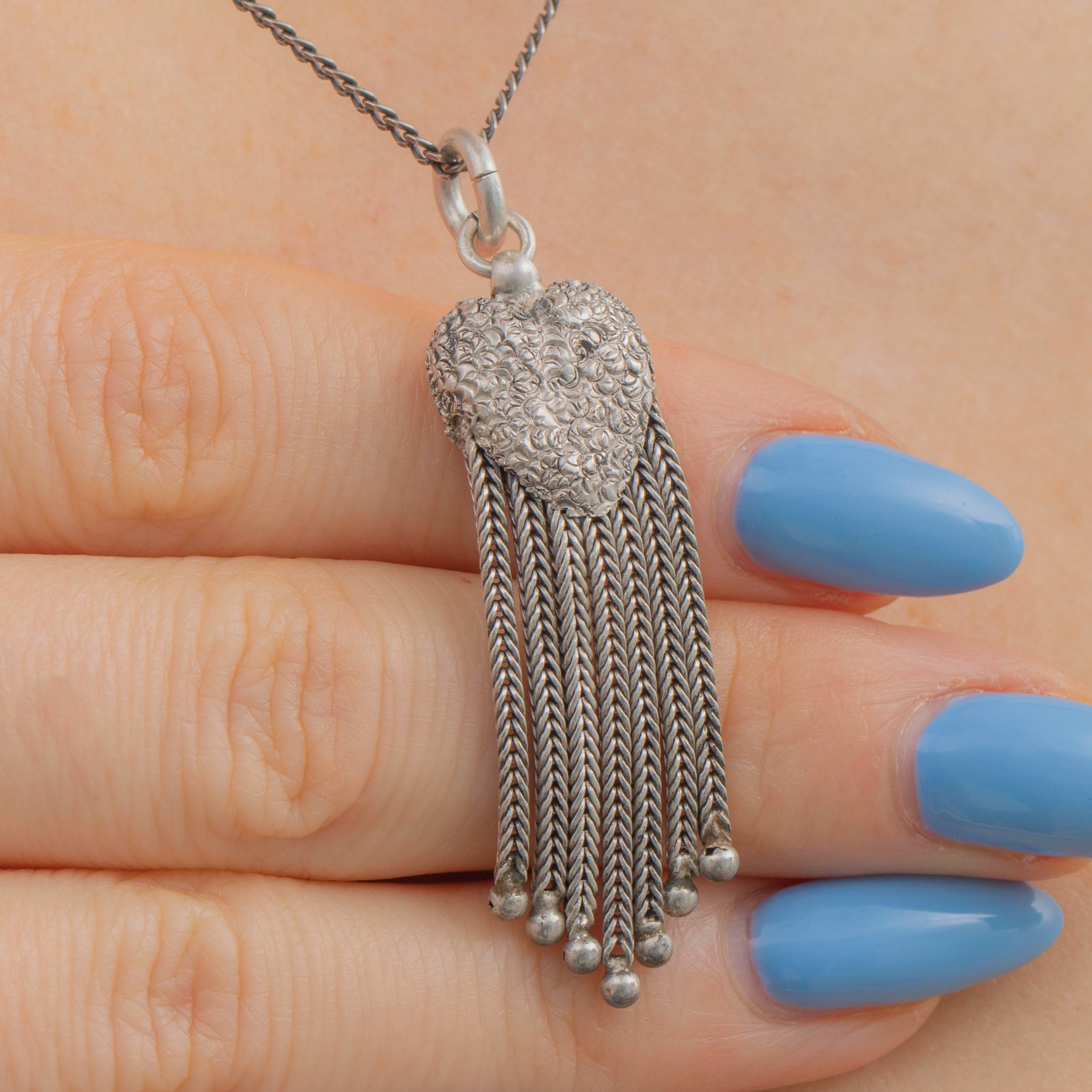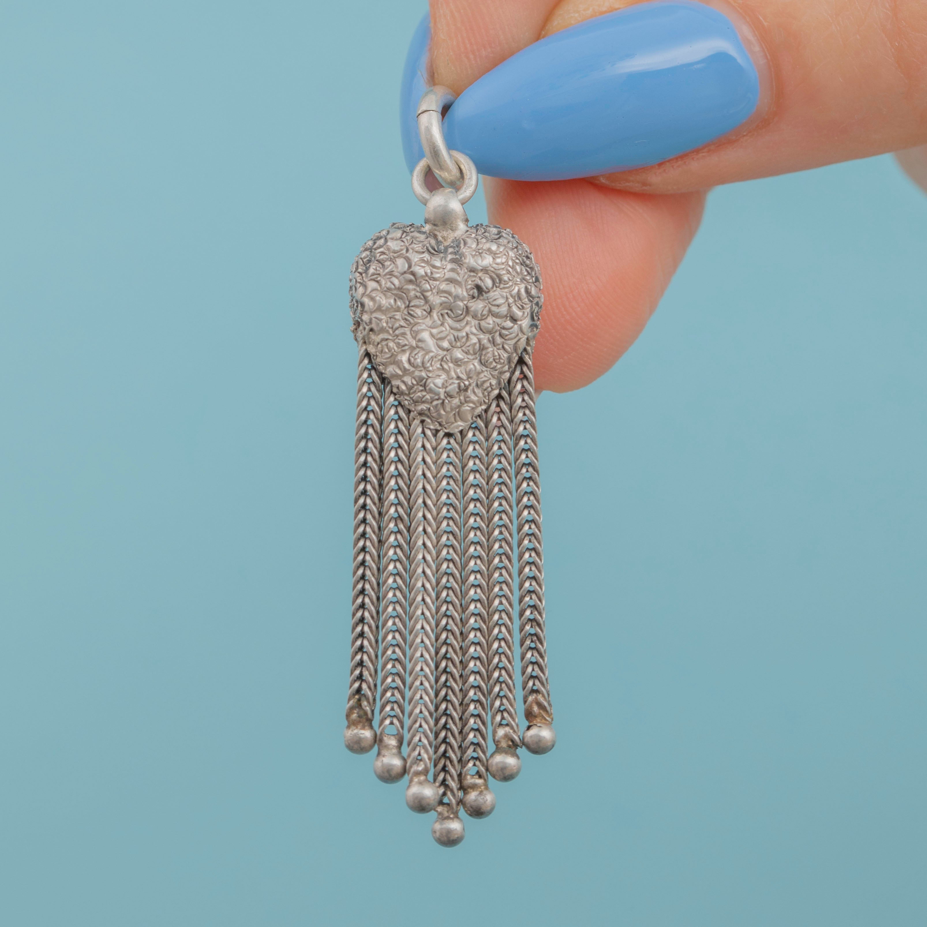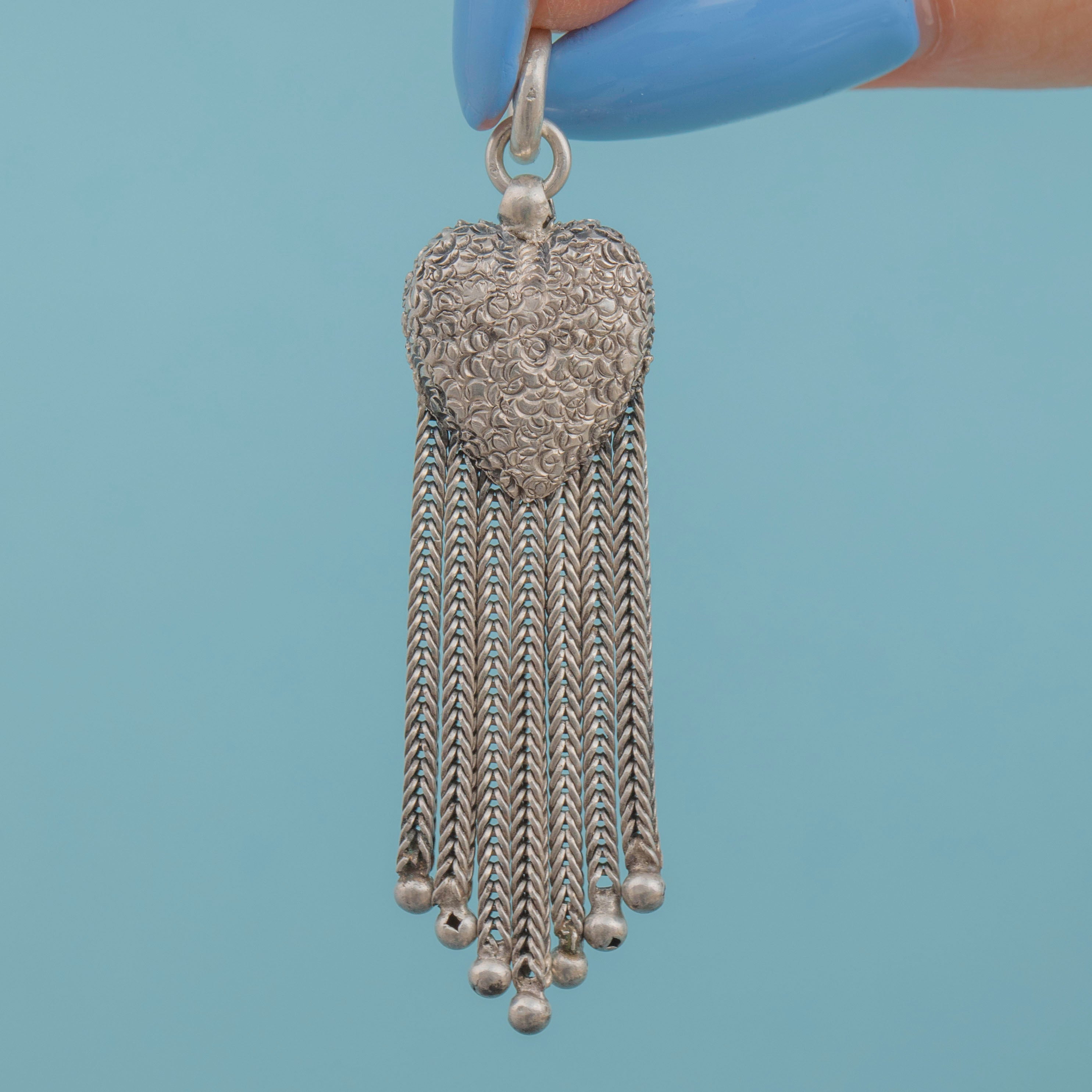 EXCELLENT. This Victorian Silver heart tassel pendant is in superb condition! A light Patina has accrued from age, animating the embossed and engraved details, and giving this piece a fitting moody look. All of the components are original to the piece and secure throughout, promising easy stylish wear.