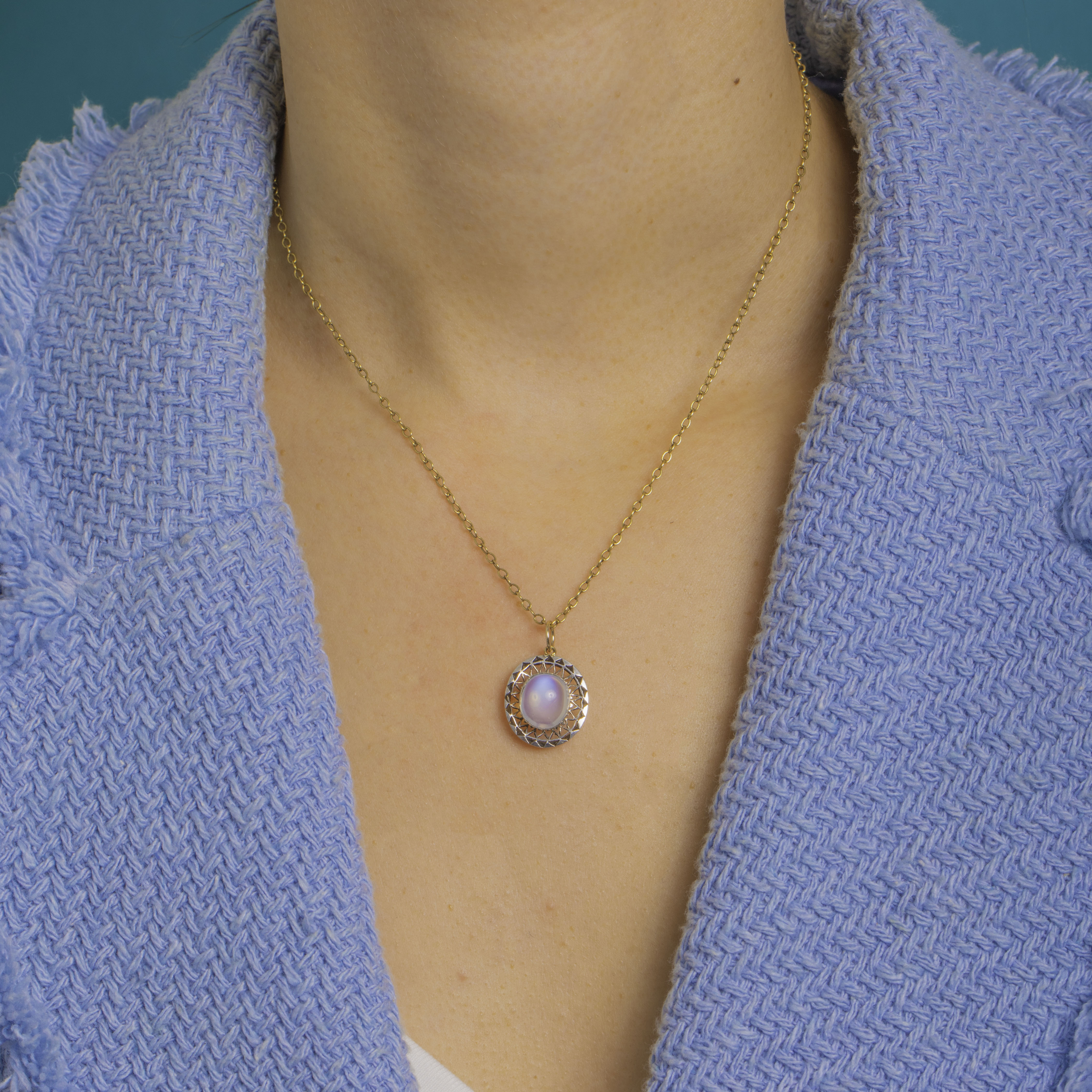 Glowing with ethereal allure, this Edwardian Moonstone charm pairs a luminous 1.25ct cabochon with a crisp halo of Silver filigree. The domed Moonstone shimmers with that coveted blue-lilac adularescence, set securely in a smooth rub-over nezel for a sleek, refined finish.