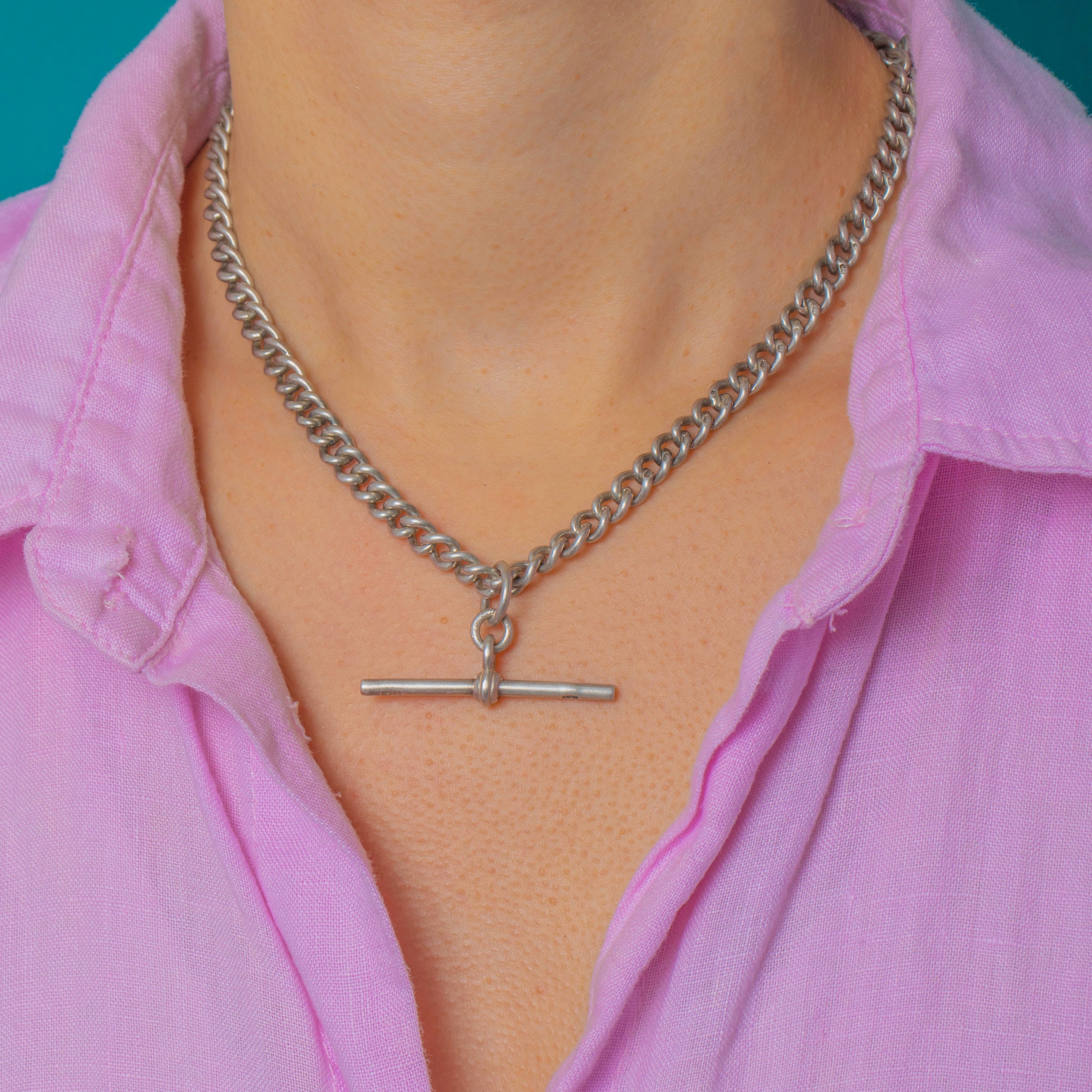 Albert Chains are a must-have for any collector and this Edwardian Silver graduating Albert chain is no exception! This antique curb chain is centred by a suspended t-bar pendant, but you could choose to style the chain with the desirable double dog-clips as the focal point, providing you with space to affix a charm or pendant.