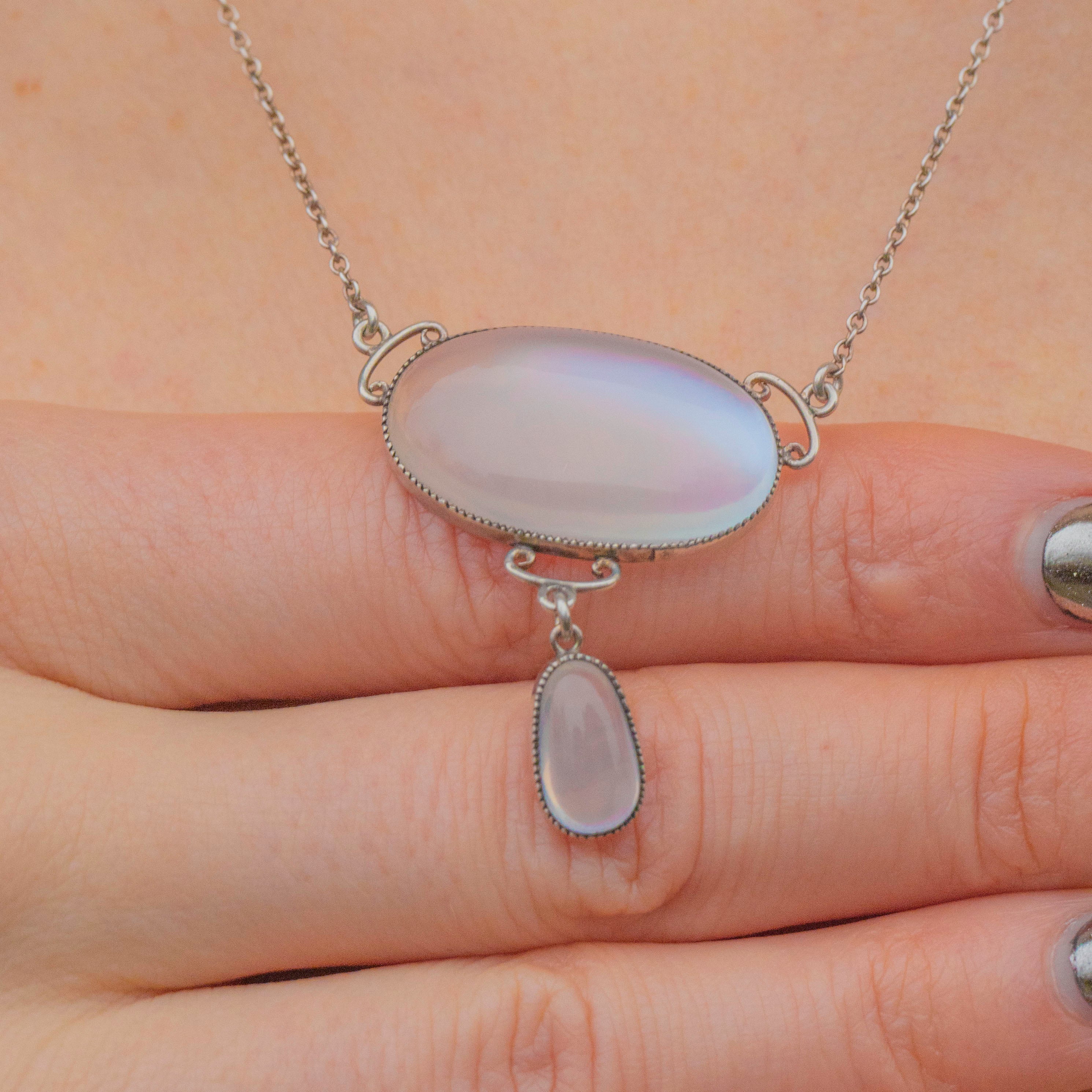 EXCELLENT. An excellent antique Silver Moonstone drop necklace! This gorgeous piece has very little wear to note with two secure Moonstones attached to a Silver chain. The clasp allows for secure closure.