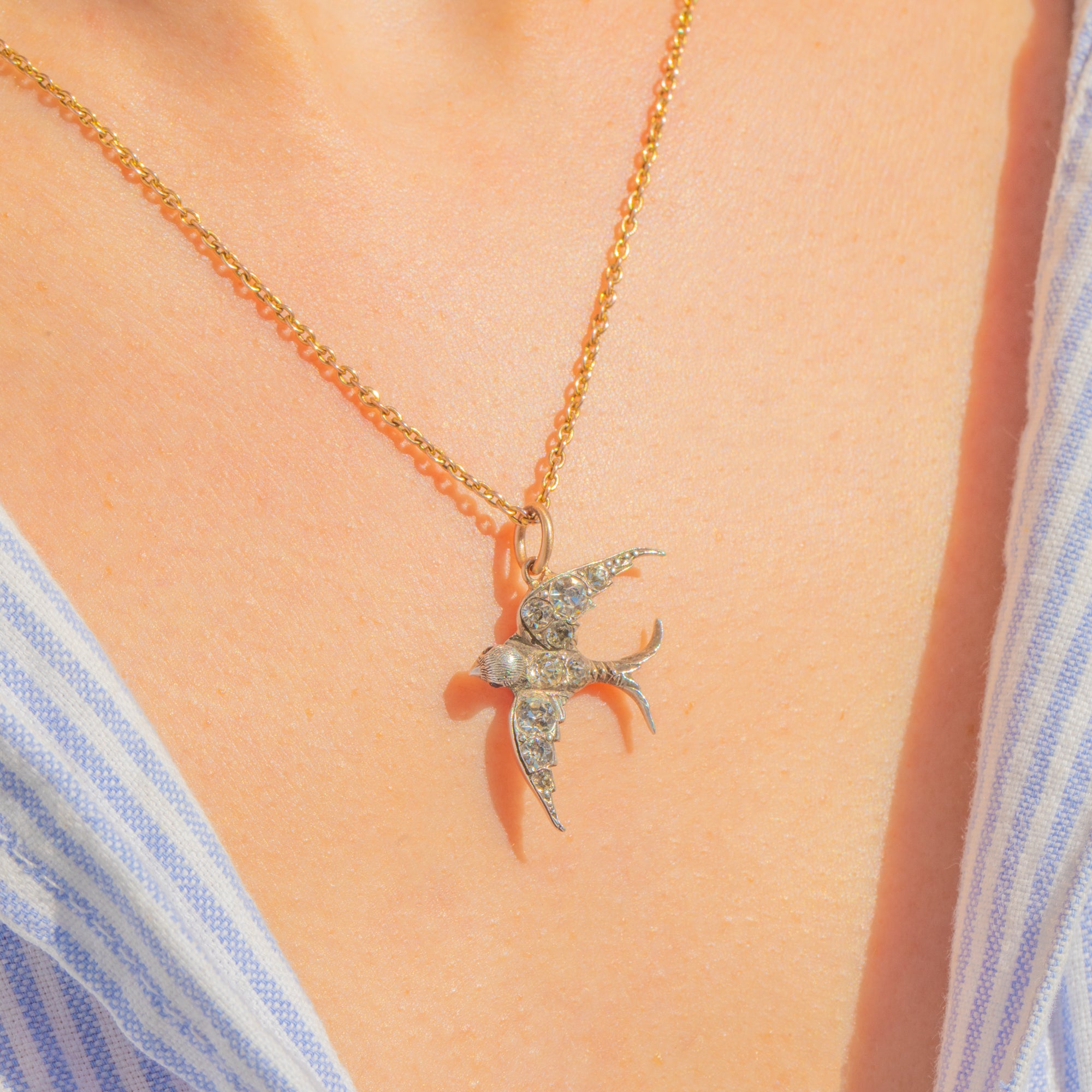 A charming Victorian Paste swallow pendant, finely crafted in bright 900 Silver with delicate pavé-set Paste that shimmer across the wings and body. The silhouette is graceful and compact, with crisp relief and subtle texturing that bring this little bird to life.