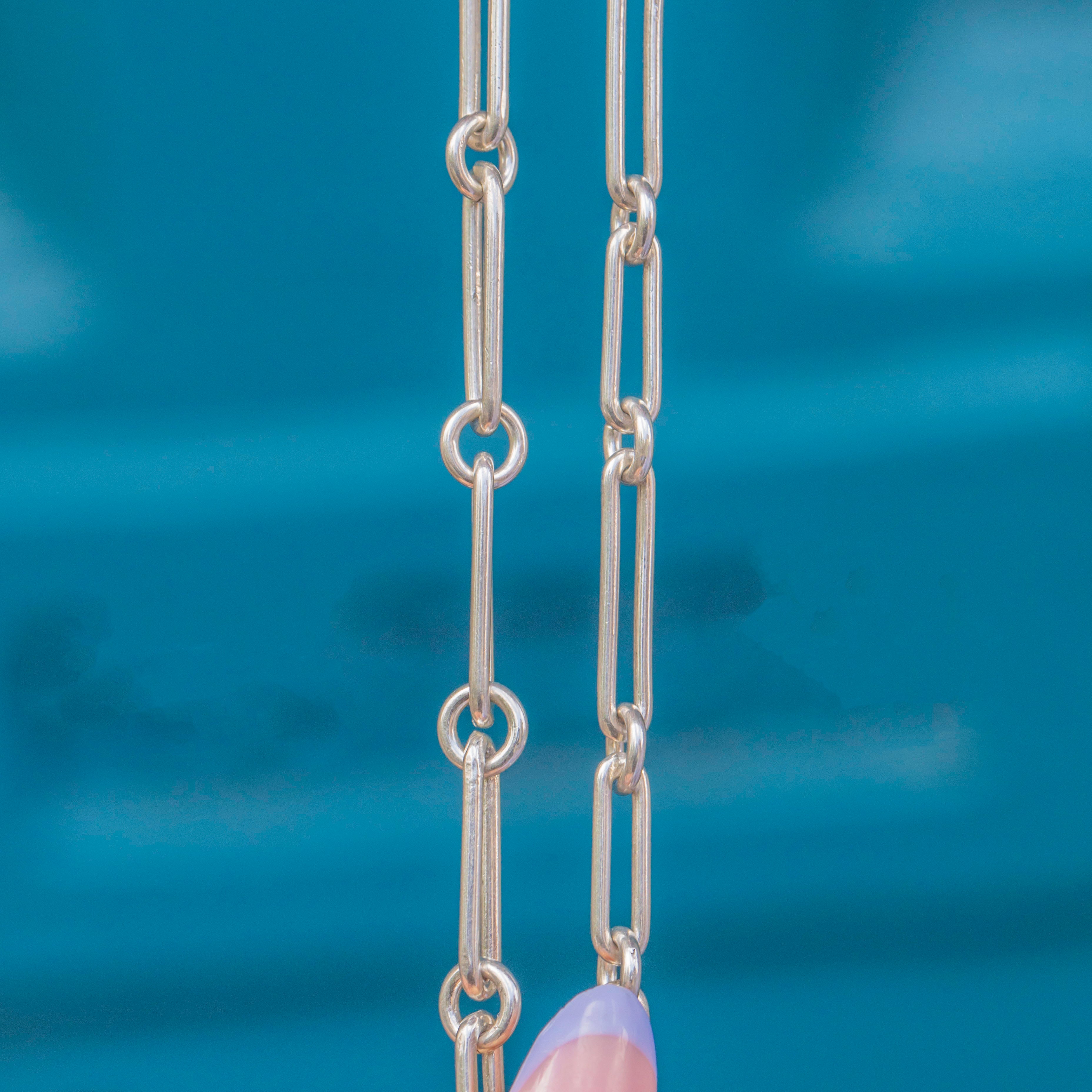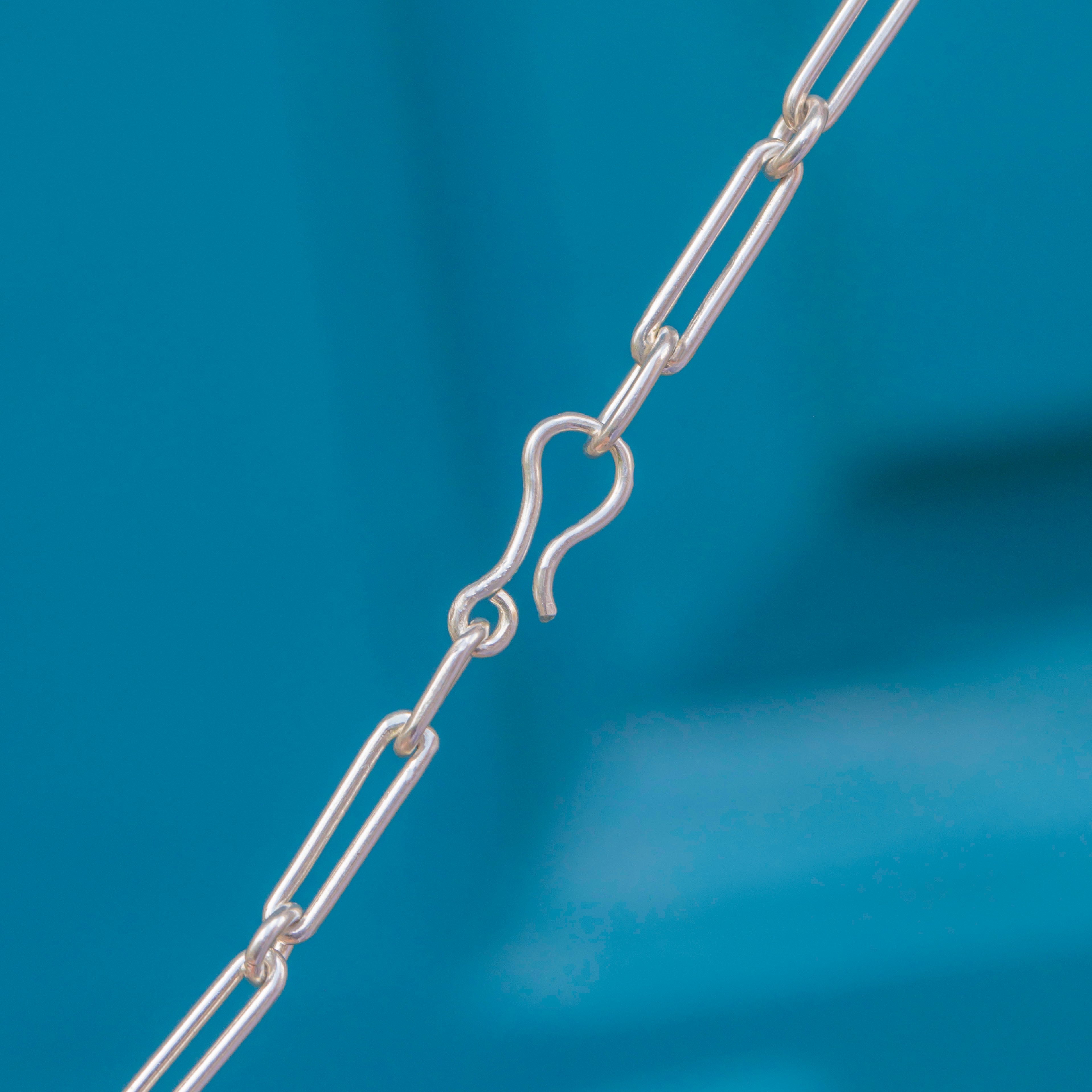 This antique Silver trombone link chain is a fabulous statement piece! Complete with a unique hook clasp, and measuring a generous 27.5" in length, this antique chain is the perfect piece to add an edge to your attire.