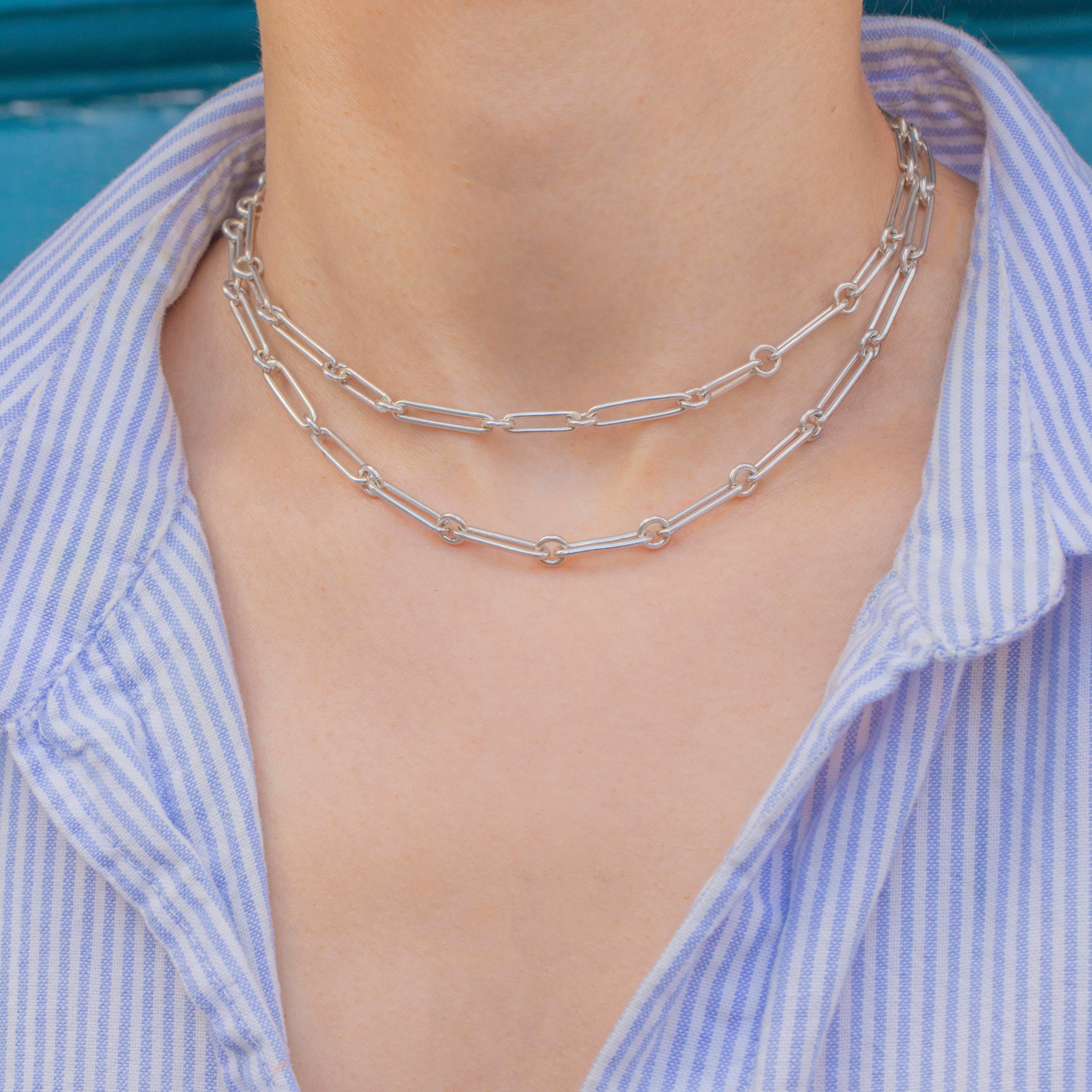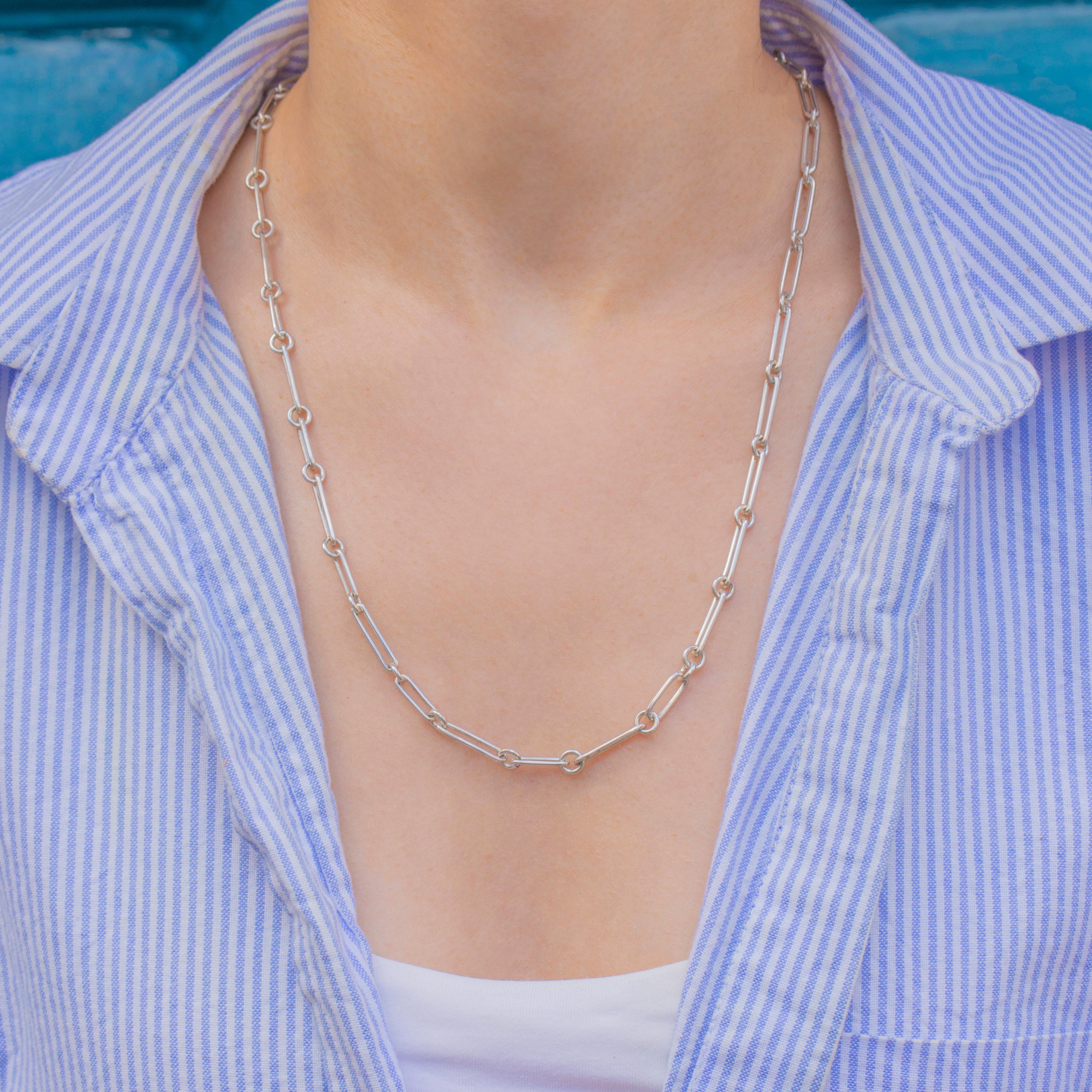 Her glossy Silver trombone links makes this Victorian chain a robust choice for everyday wear, with its generous length allowing you to create a layered look if you wish. With plenty of styling potential, don't hesitate to add this antique trombone chain to your collection!