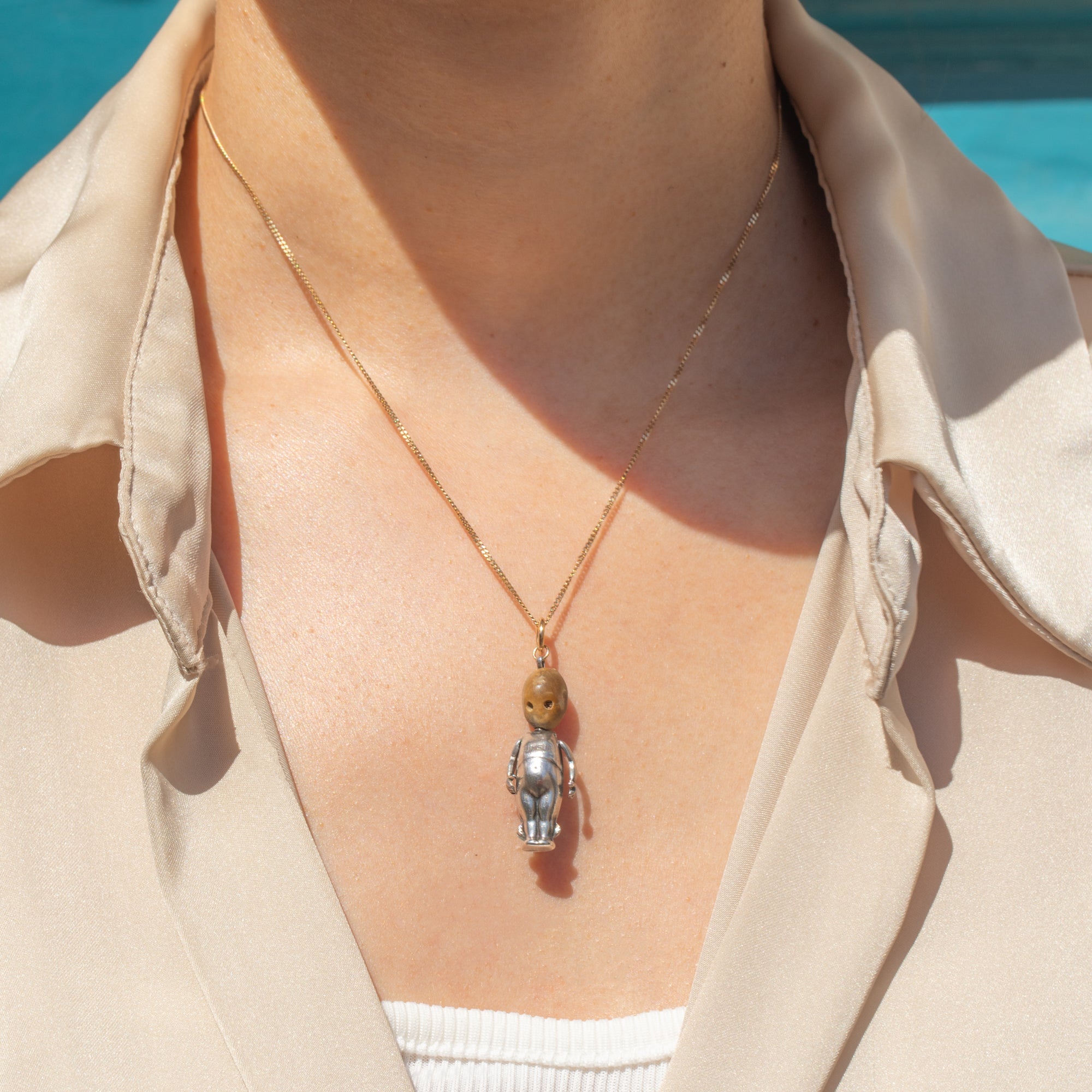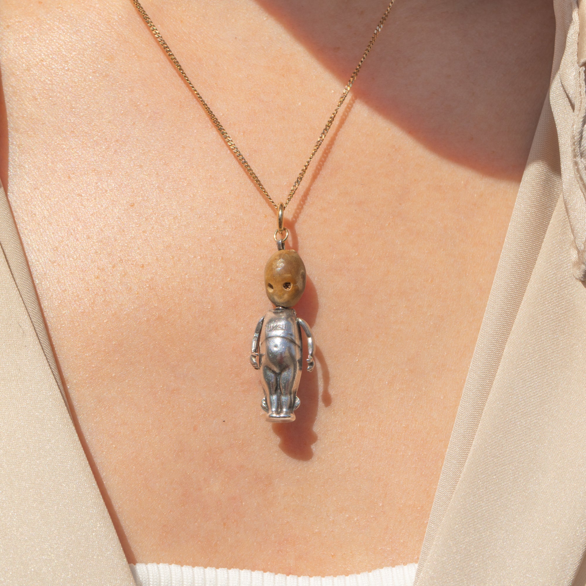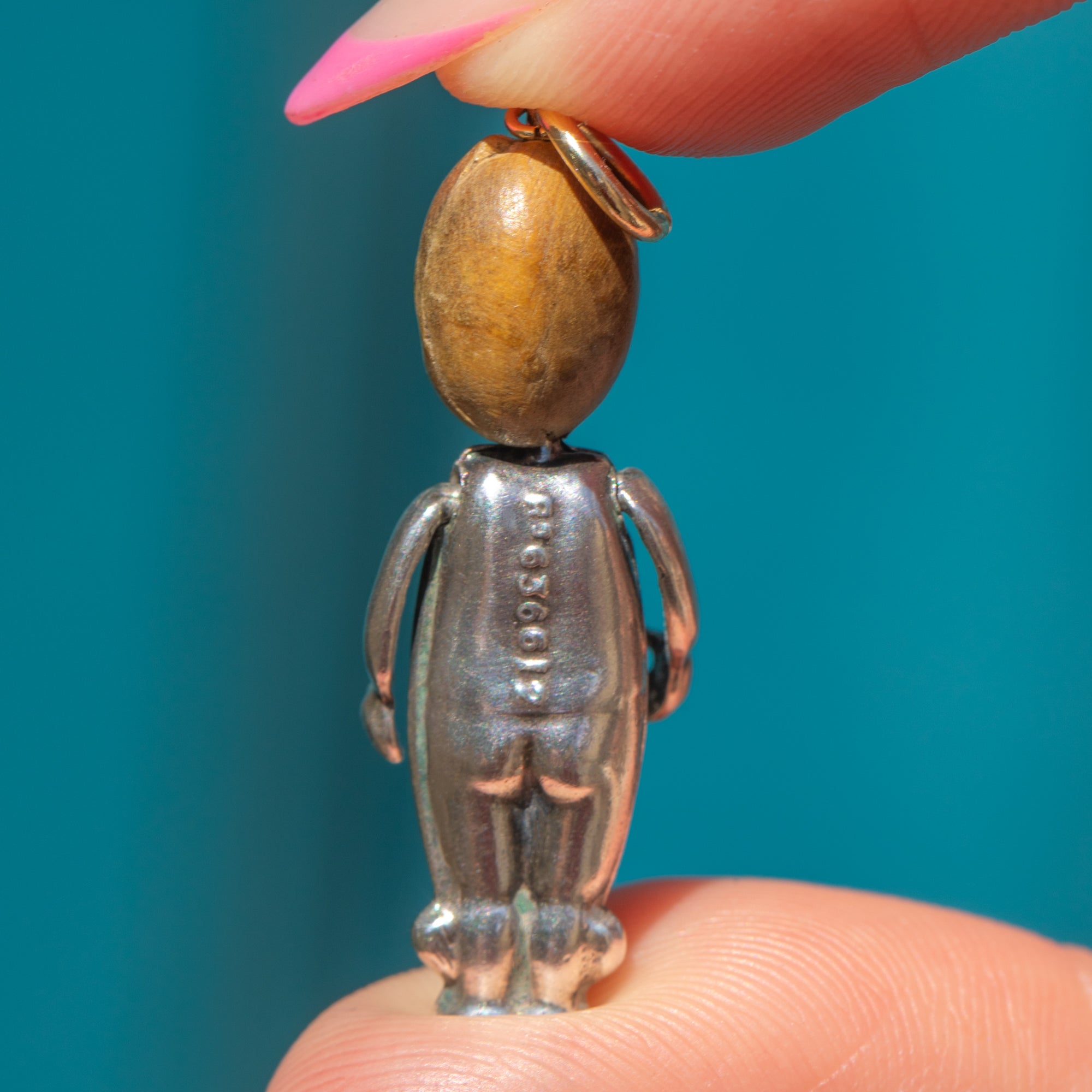 EXCELLENT: This antique Silver WWI Touch Wood fumsup charm has been wonderfully preserved! With no signs of surface wear and fully articulated arms, this antique fumsup pendant is in excellent, ready-to-wear condition!