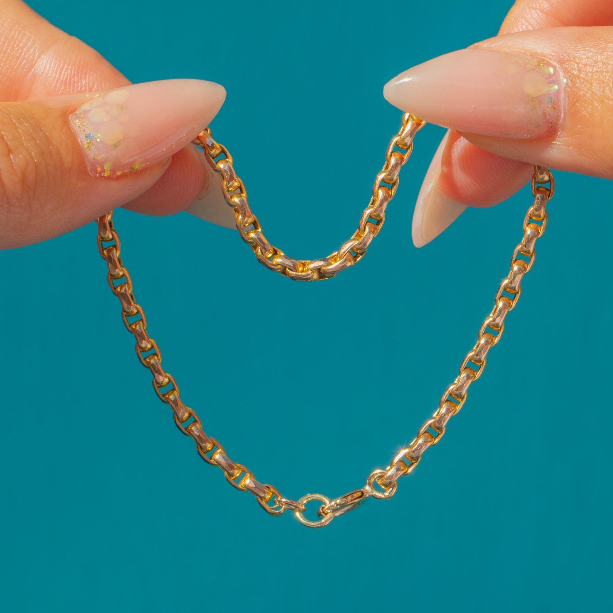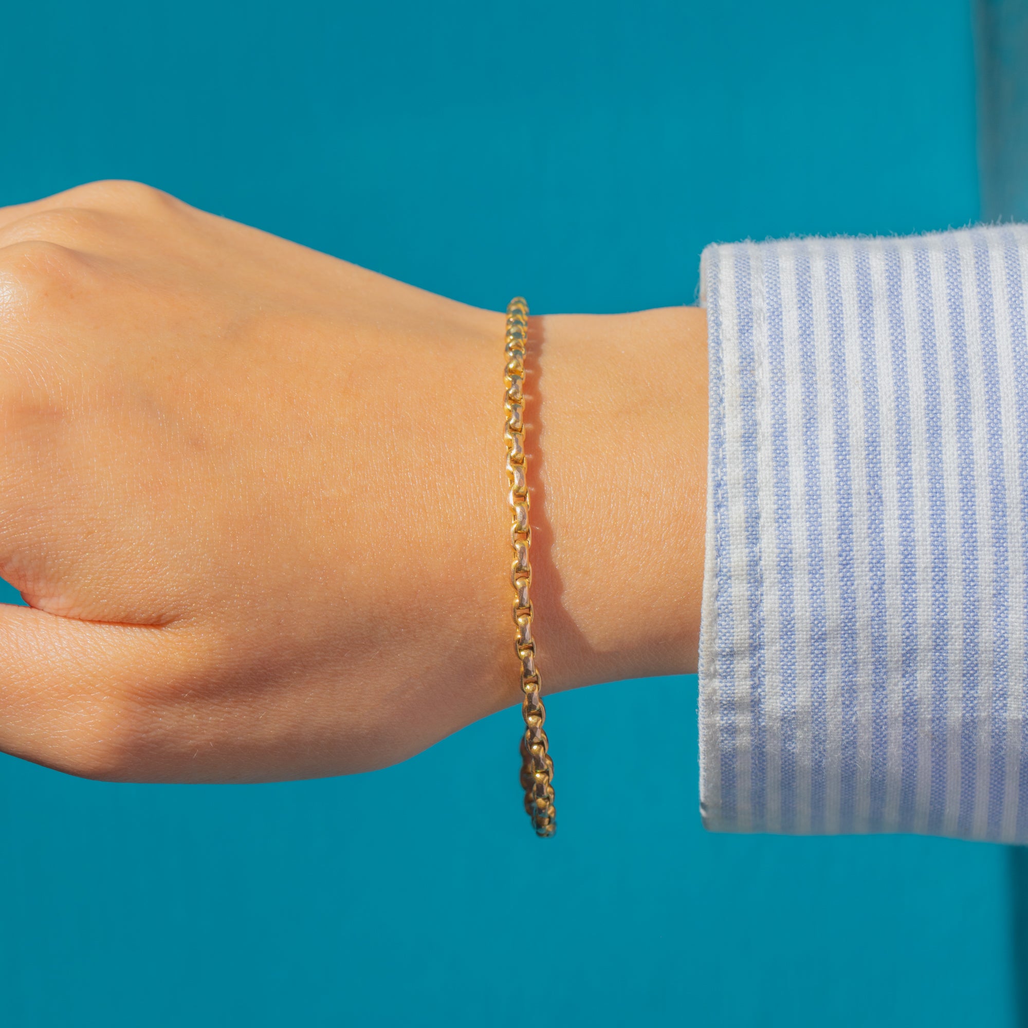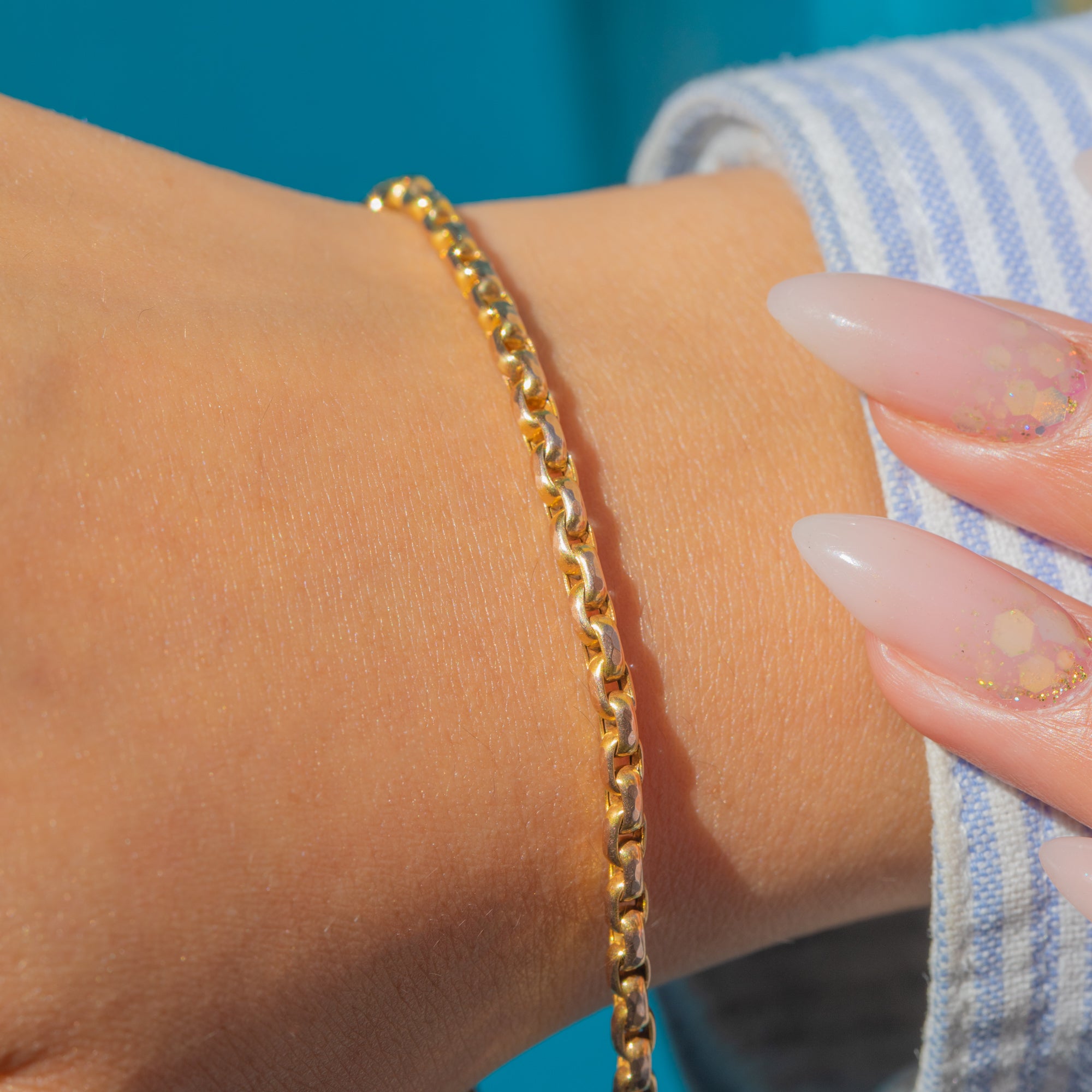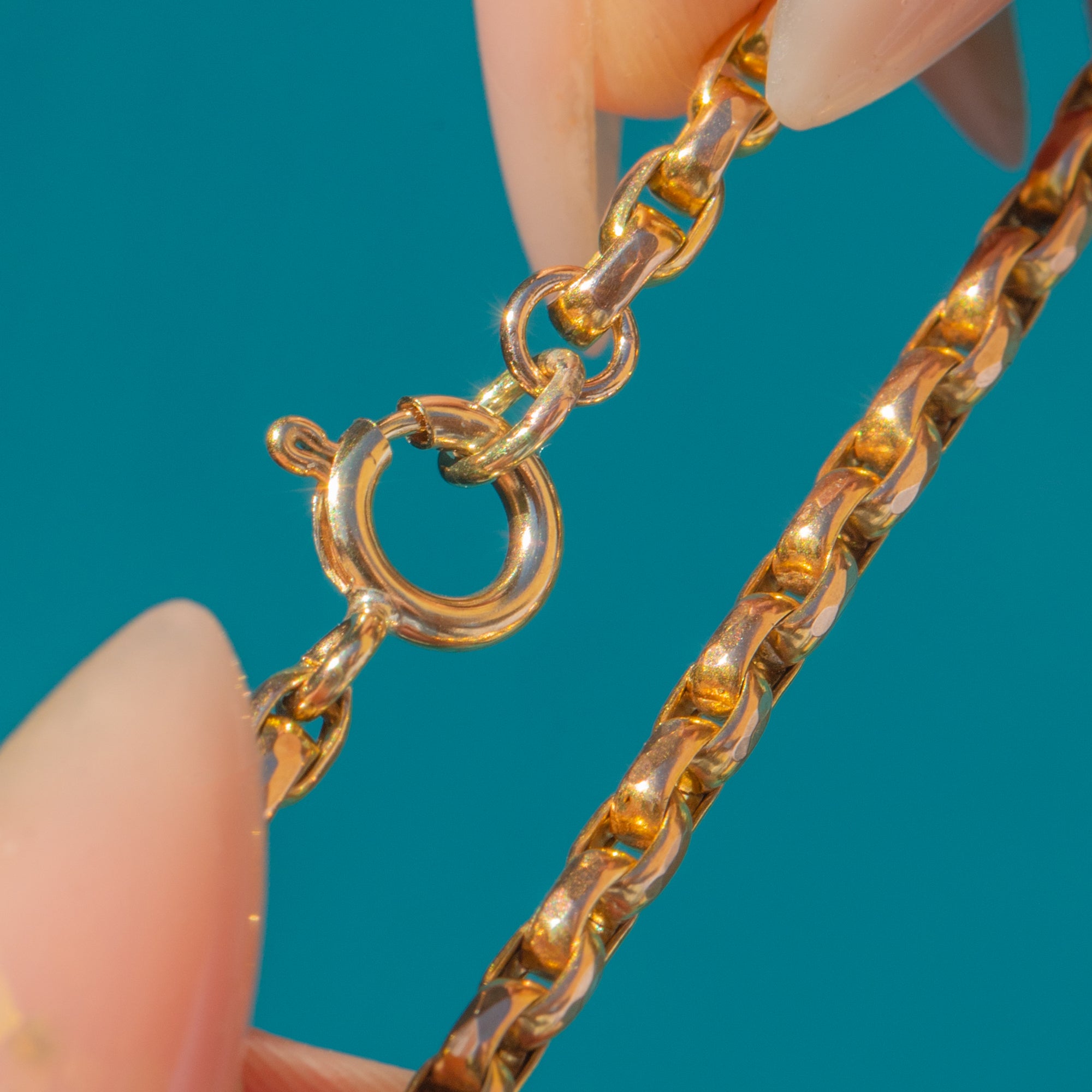 This antique bracelet is crafted in solid 9ct Gold with lightly faceted belcher links that catch the light with subtle sparkle. The Gold has a bright, sunny yellow hue, adding warmth and vibrancy to the design.
