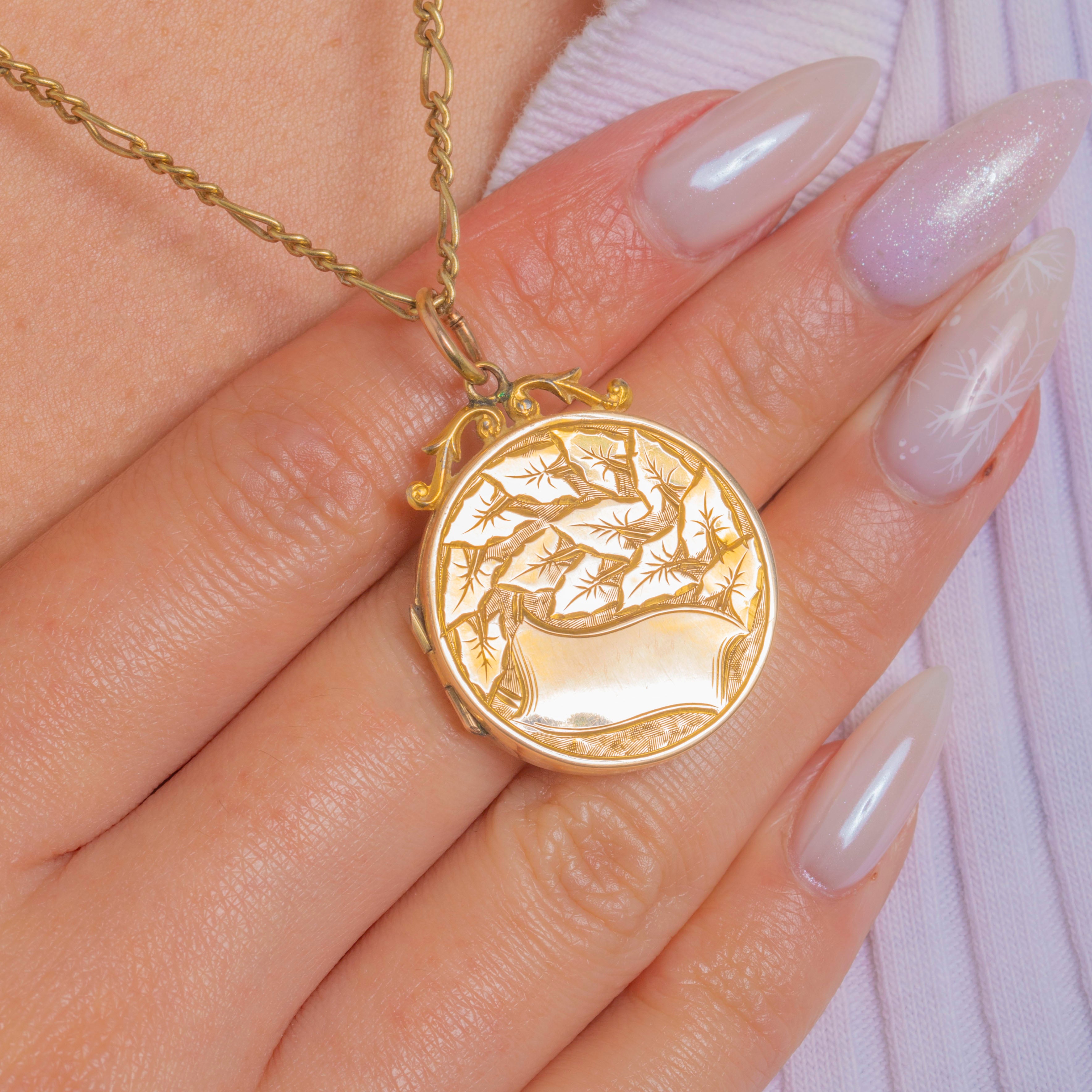Brimming with late Victorian charm, this solid 9ct Gold round locket is richly hand-engraved with romantic foliate motifs framing a polished cartouche. An ornate scrolled surmount and jump-ring bail add a graceful, decorative flourish, while the warm glow of 9ct Gold enhances every bright-cut line.
