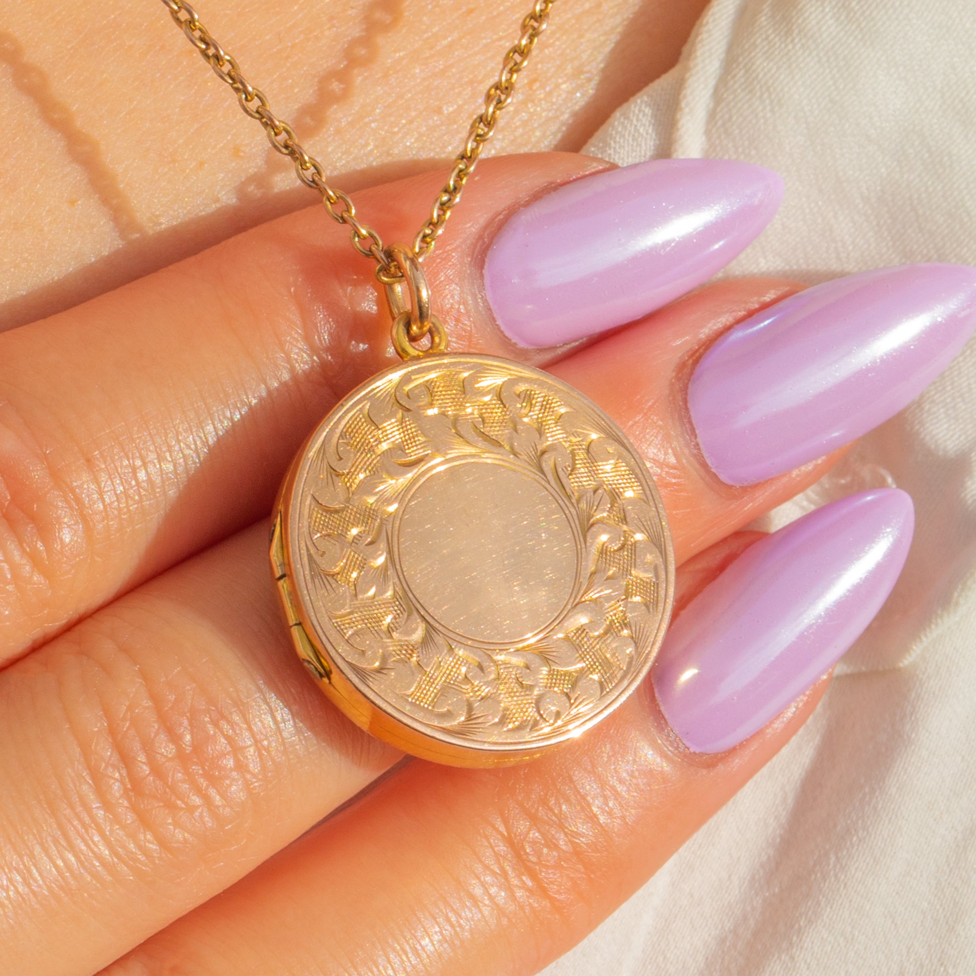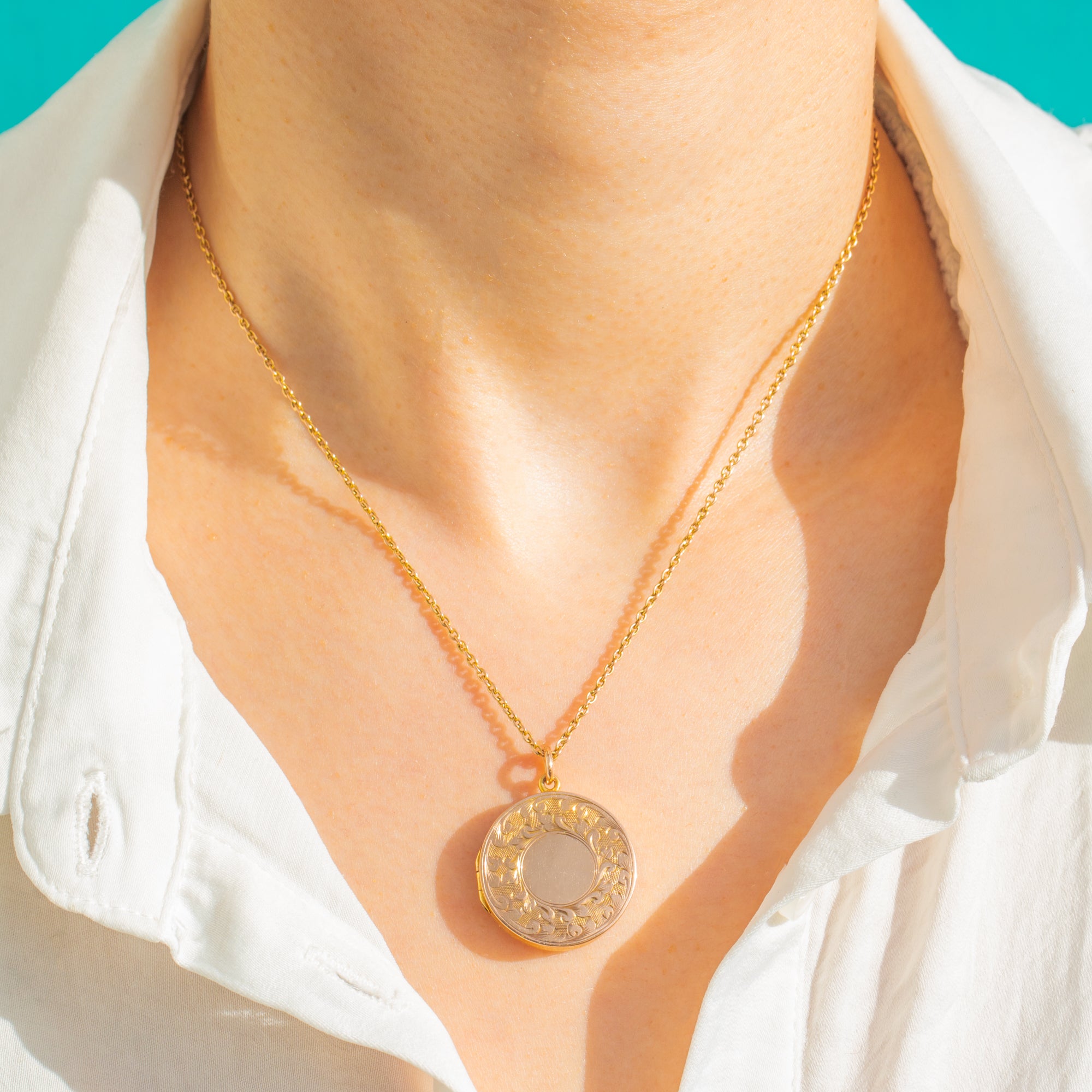 This classic round locket is richly decorated with engine-turned panels and ornate foliate engravings. A smooth central cartouche sits poised for a personal monogram, giving this piece its timeless, sentimental charm.