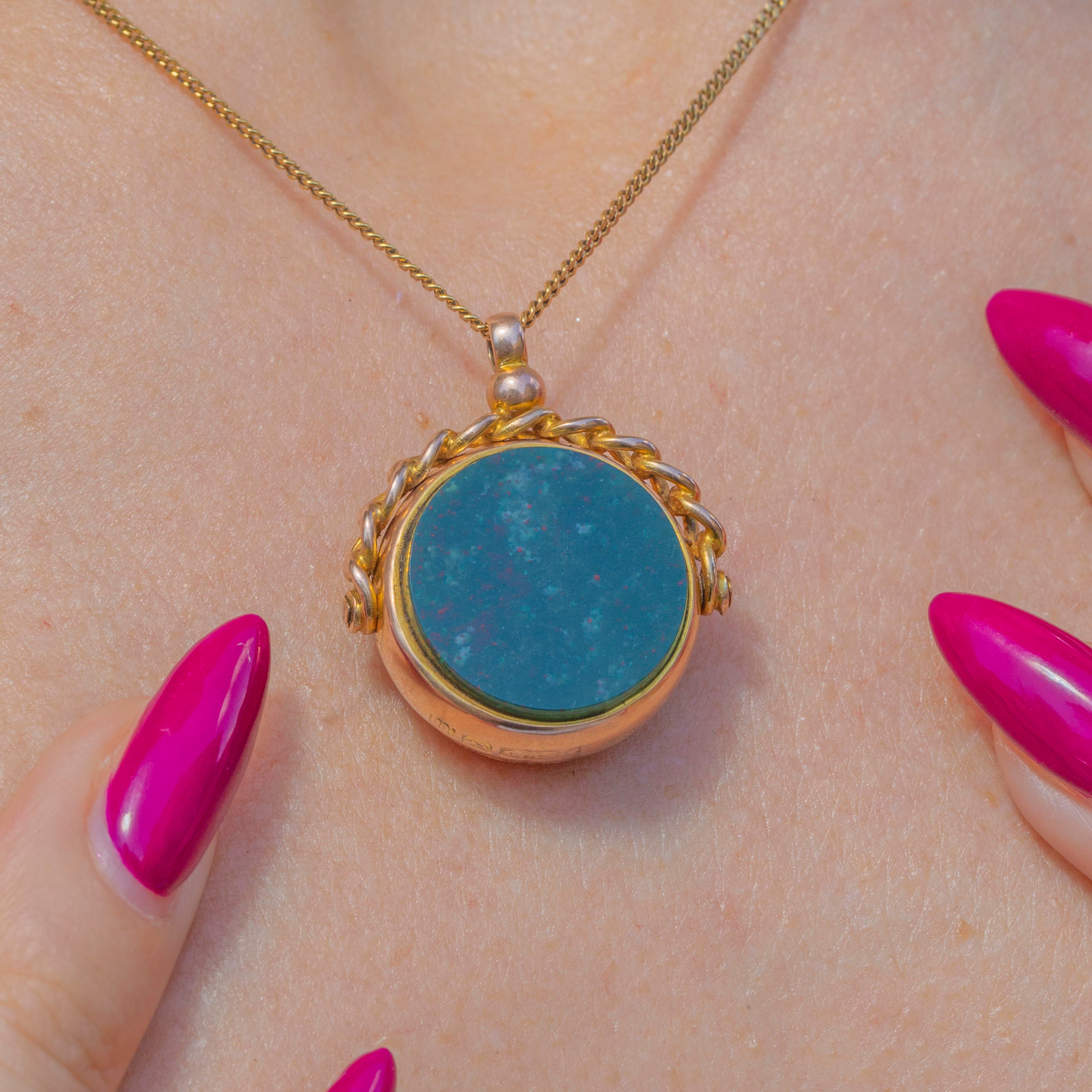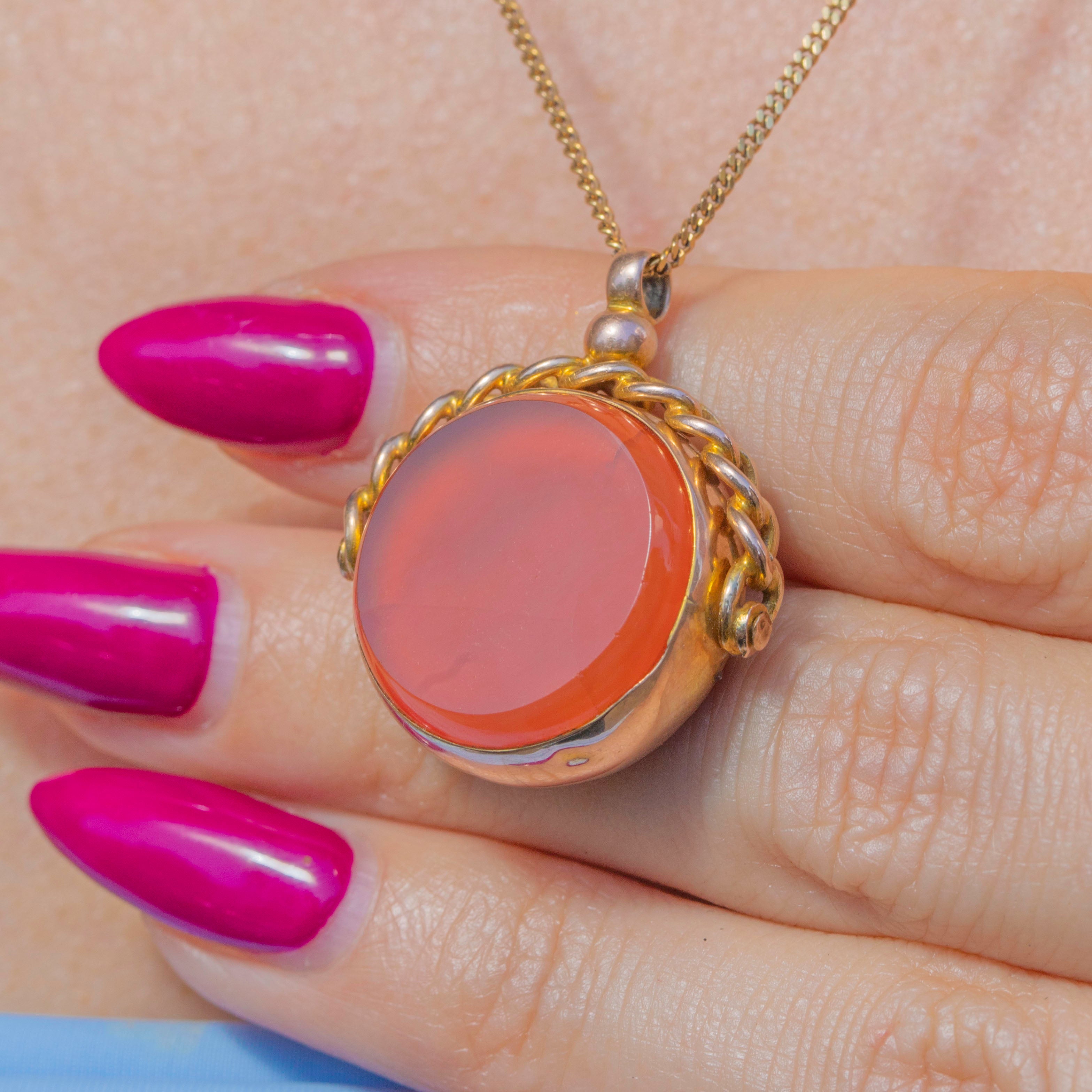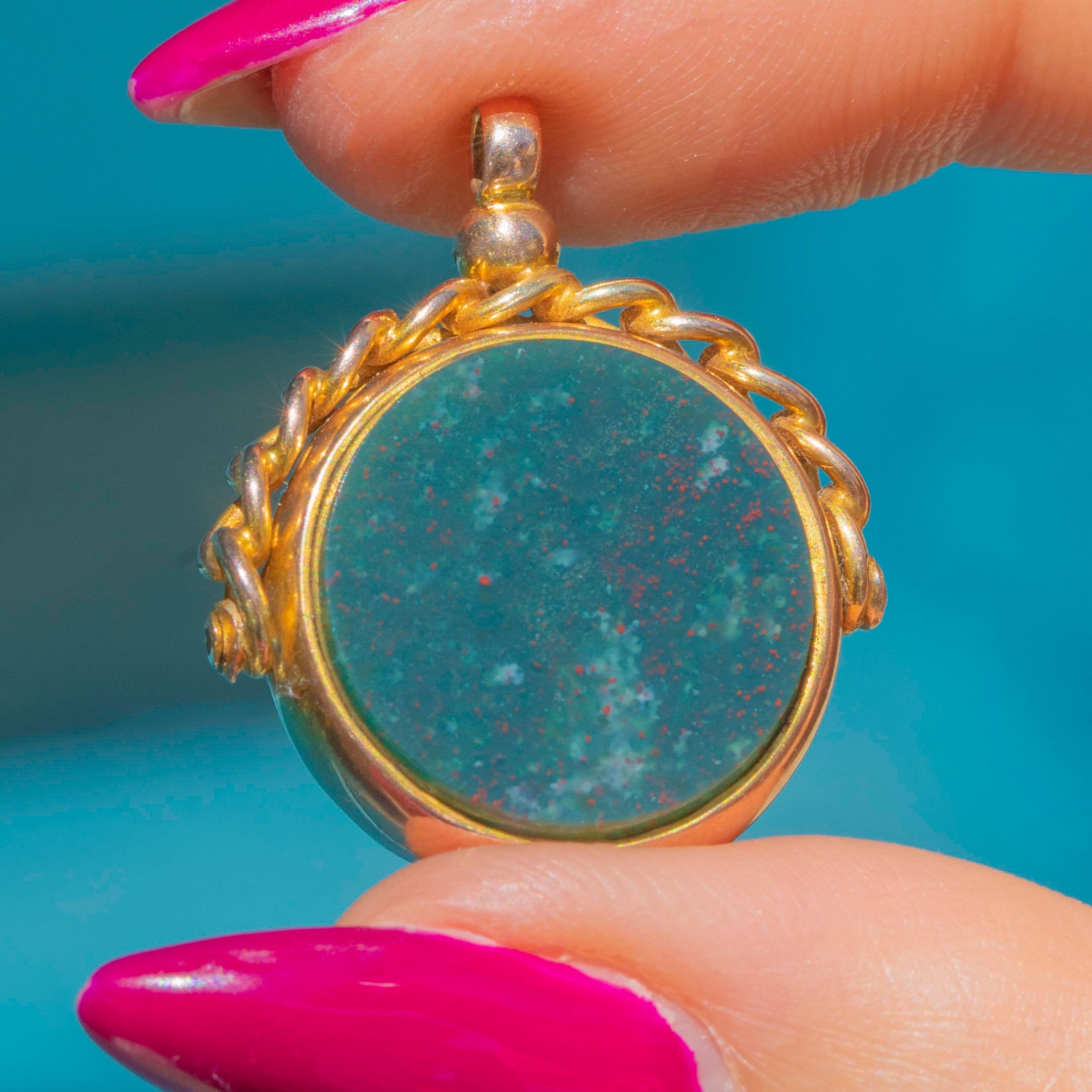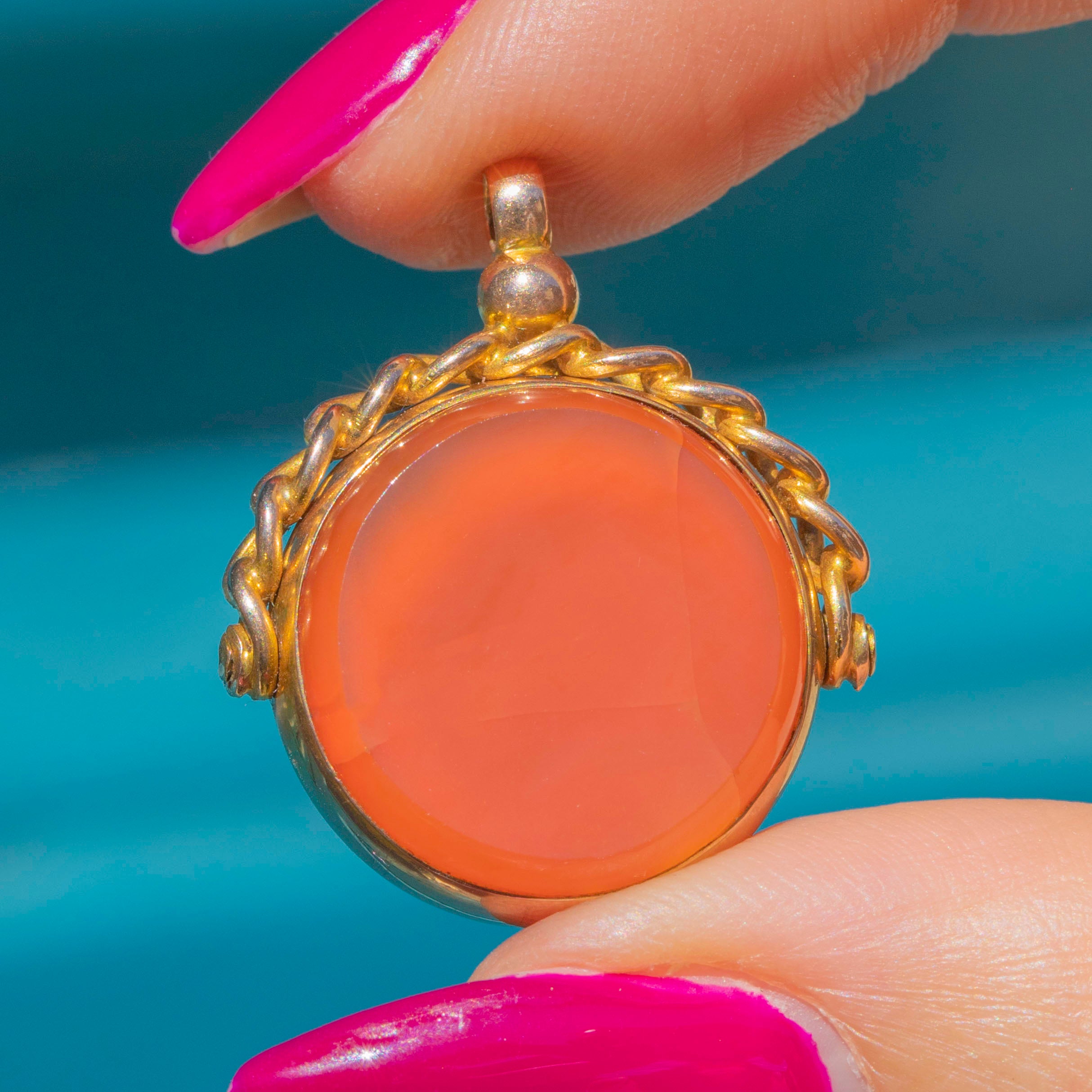 Inlaid with a smooth burnt orange Carnelian on one side and a contrasting forest green Bloodstone, this fully hallmarked spinner fob pendant (dated to 1919) radiates antique charm from every angle.