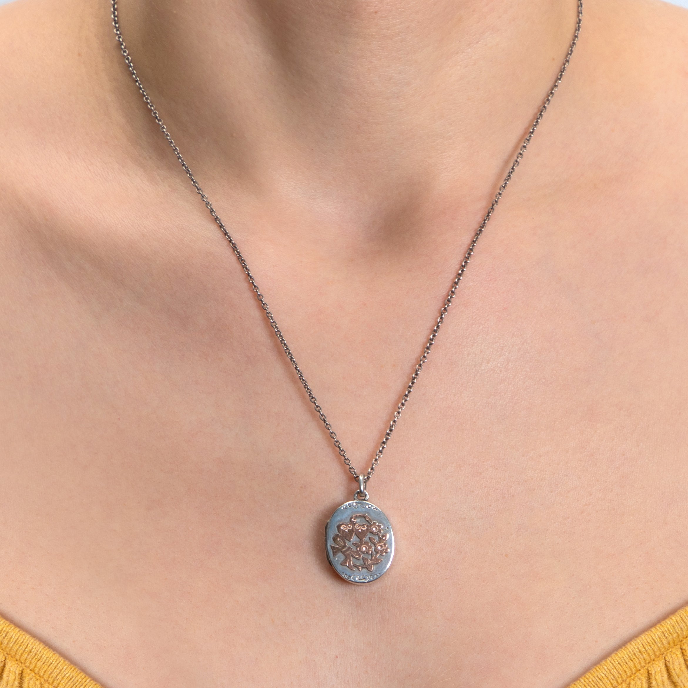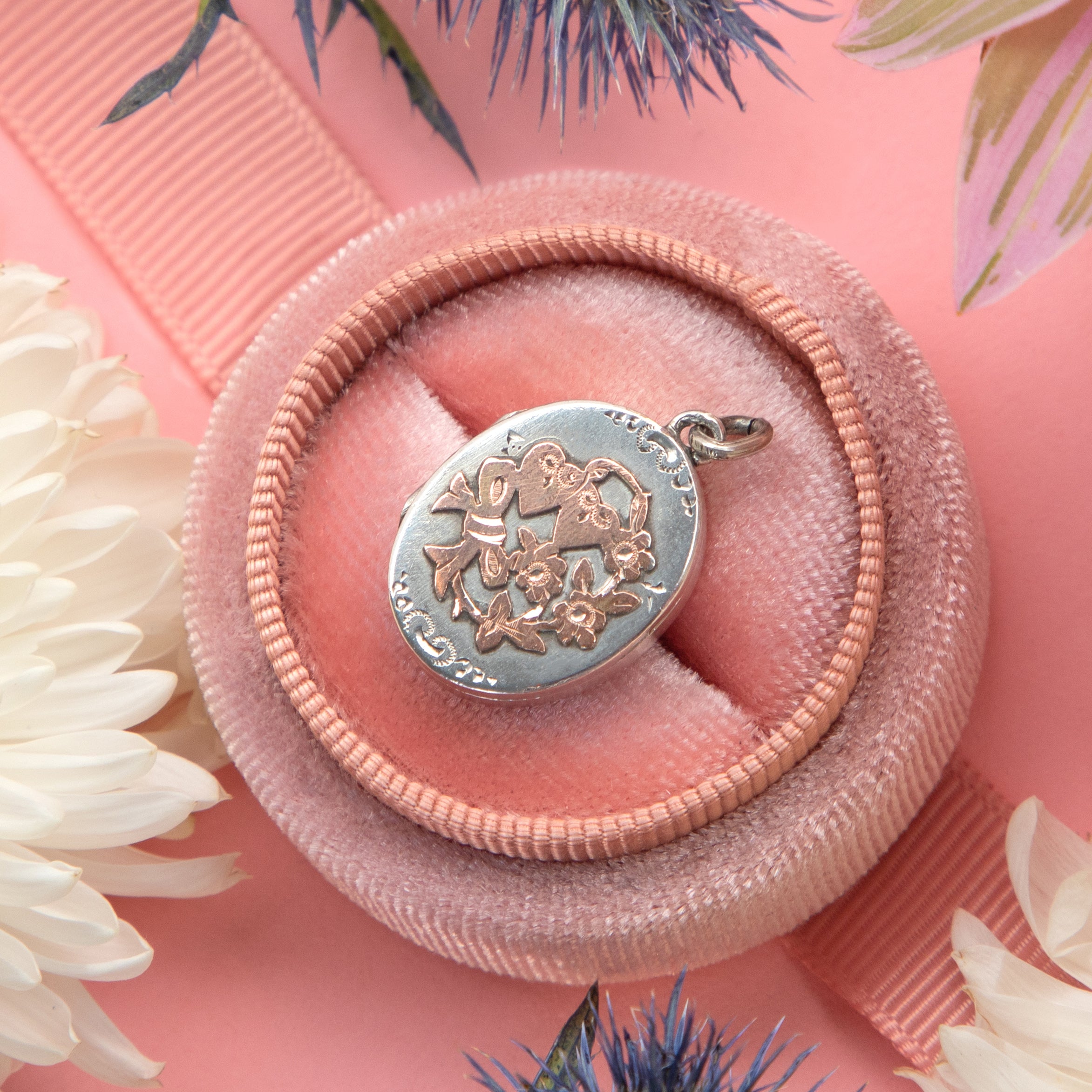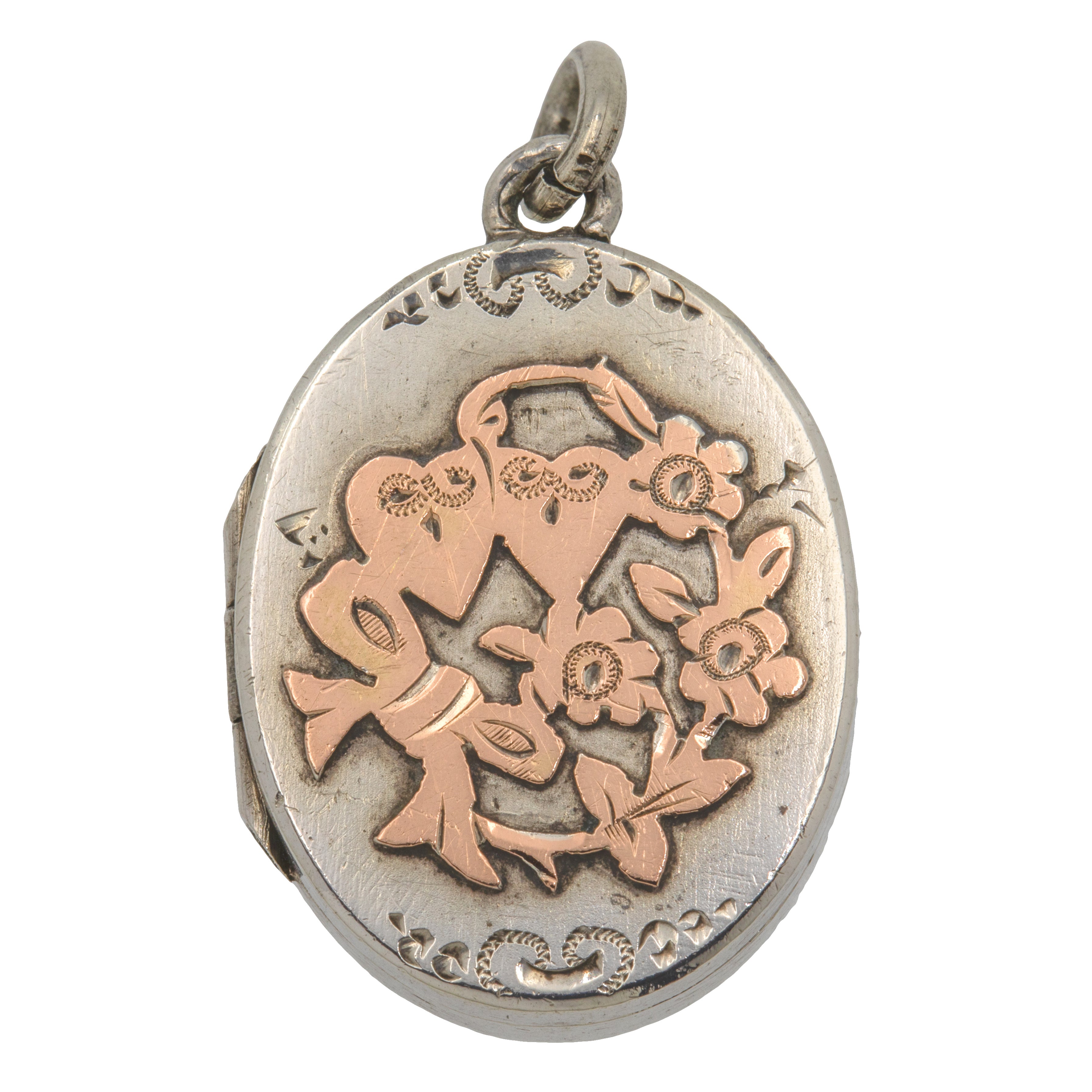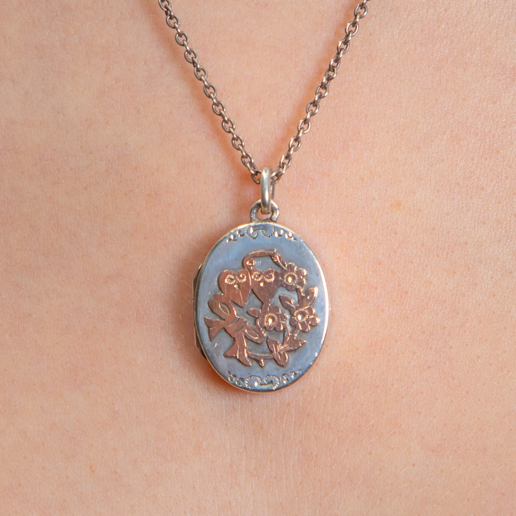This sweet antique Sterling Silver and 9ct Gold oval locket would make a fine addition to your collection! 9ct Gold detailing sits elevated from the lustrous Sterling Silver body, displaying a flourish of flowers, hearts, and bows.