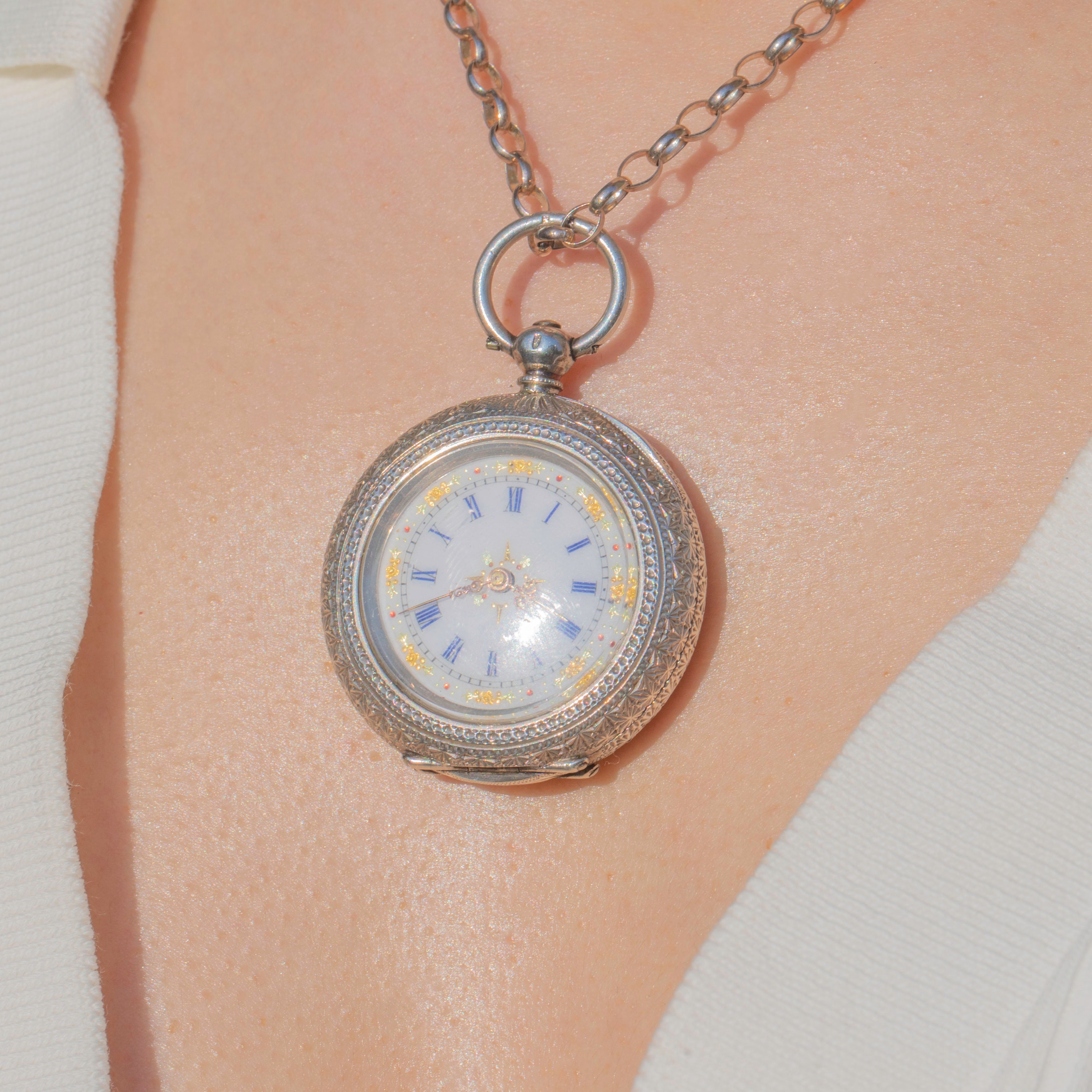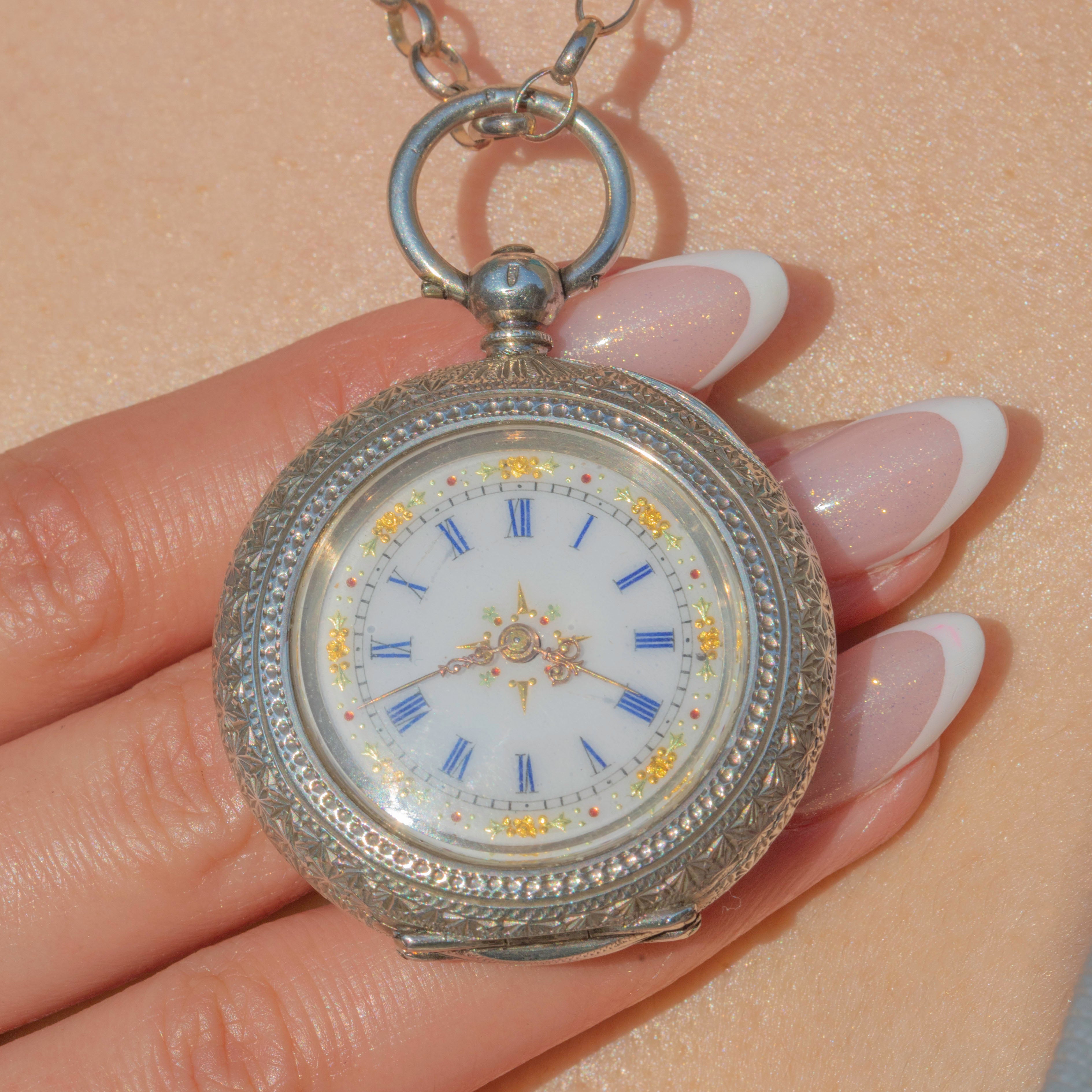 EXCELLENT: This antique Swiss Silver engraved pocket watch is in incredible condition. The watch can be opened easily by pressing the bale at the top, revealing its historic hallmarks inside. The hallmarks and engravings are well-preserved and crisp. This pocket watch will certainly take pride of place in your collection!