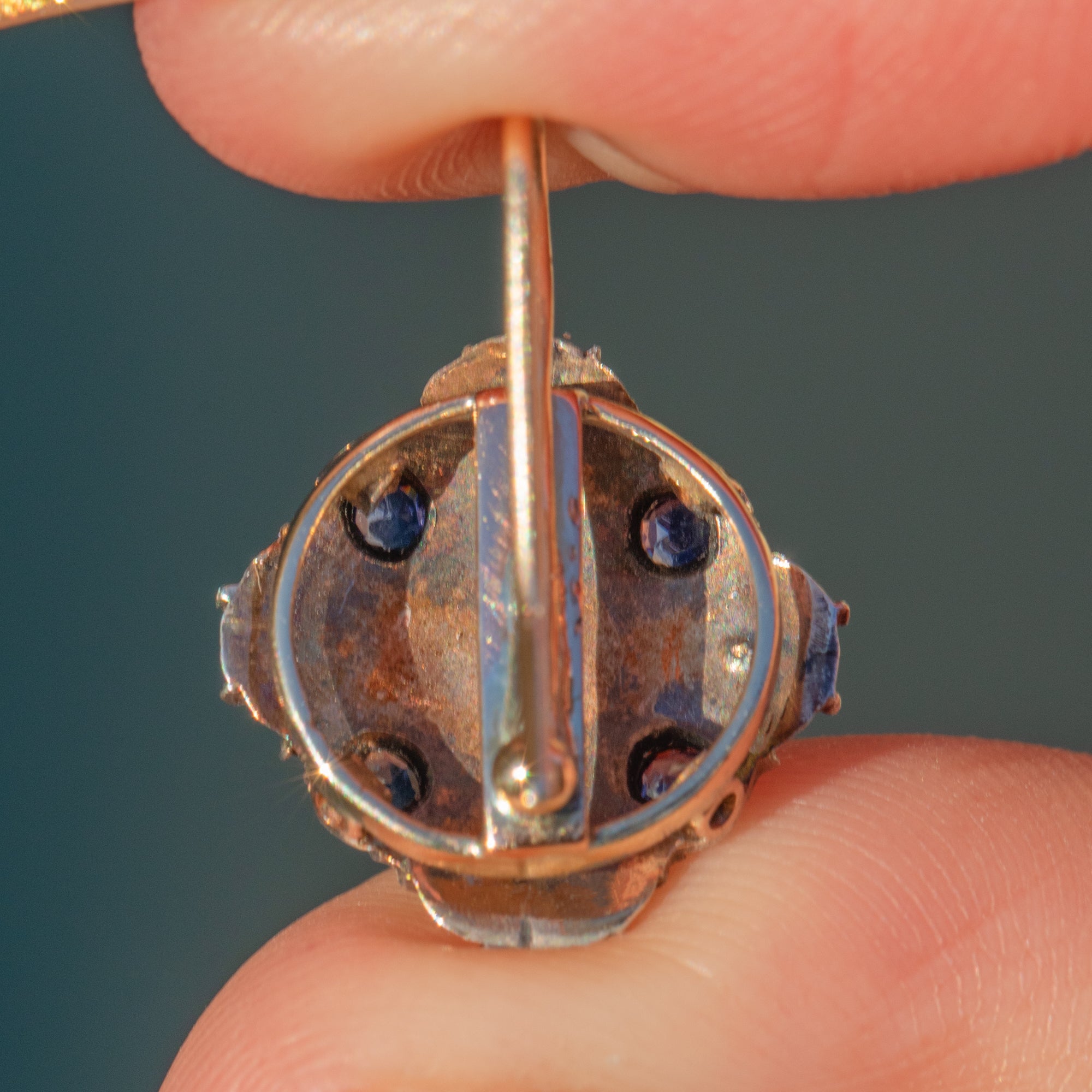 These antique Edwardian cluster earrings are beautifully luminous, full of soft colour and elegant sparkle. Each earring forms a rounded floral cluster, with dark Tanzanite stones complemented by creamy Pearls for a refined early 20th-century look.