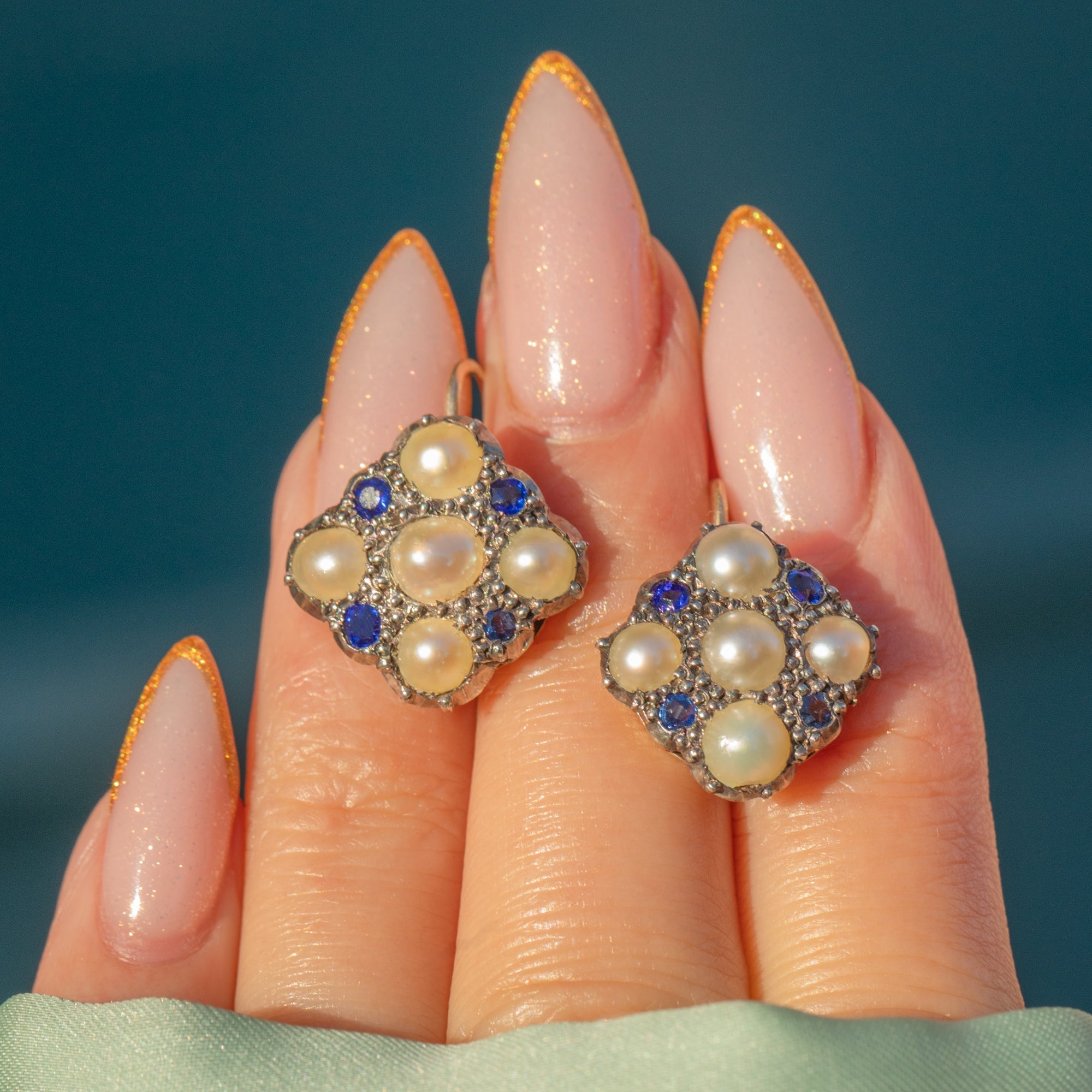 Antique Tanzanite Pearl Cluster Earrings, 9ct Gold Hooks