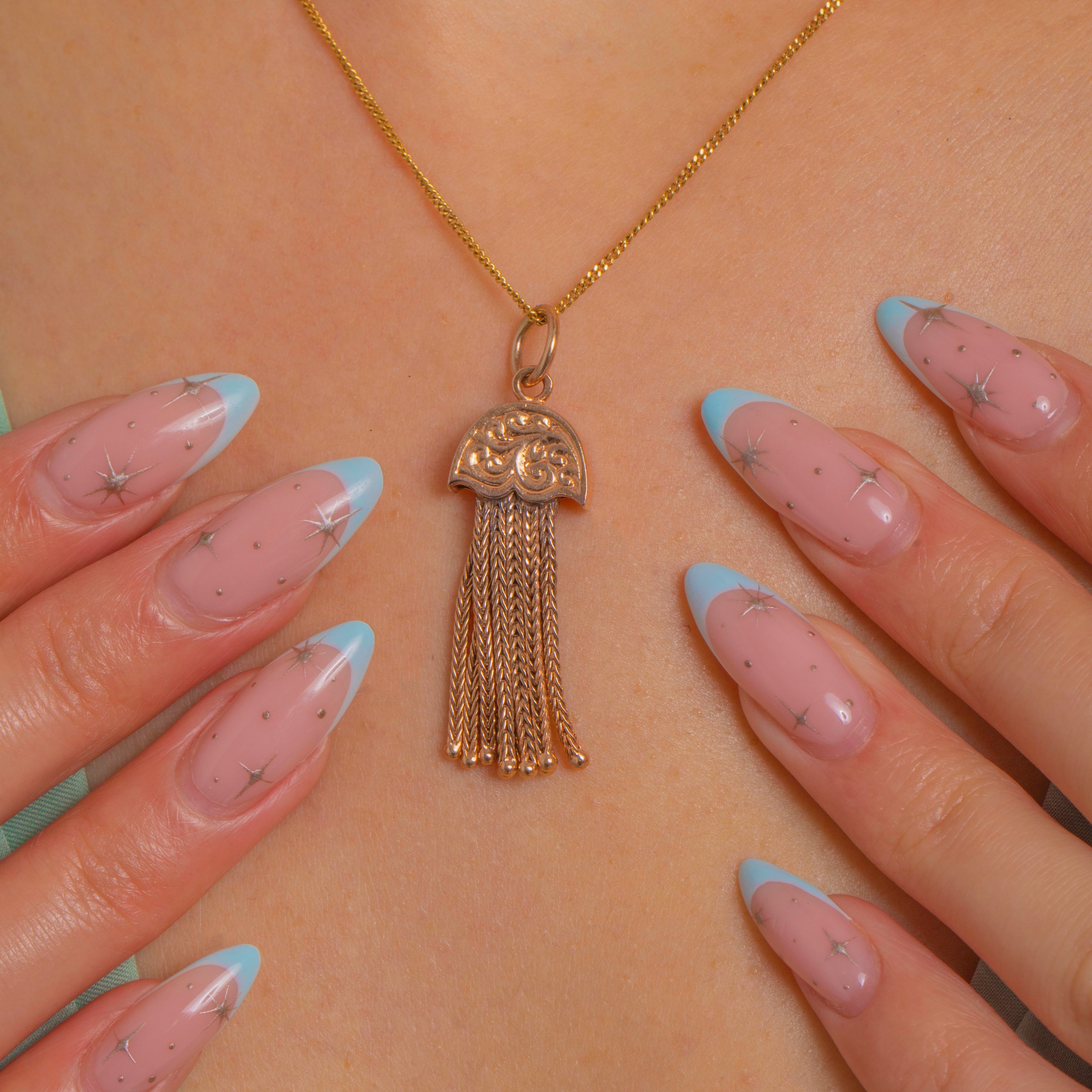 Sumptuously detailed and wonderfully tactile, this Victorian 9ct Gold tassel pendant is a petite treasure with beautiful movement. The domed, scalloped cap is richly engraved with scrolling foliate motifs, flowing into a fringe of fine foxtail chain strands tipped with tiny beads for a lively, dancing finish.