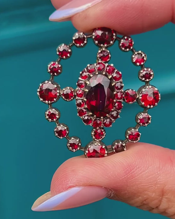 VERY GOOD: This antique Victorian Garnet cluster pendant is in very good condition! Starting life as a brooch, this piece has been converted into this highly wearable pendant. The work has been carried out very well, with only mild evidence of this on the back. The Garnets are crisply faceted, deeply saturated, and securely set! The Silver settings have accrued gorgeous patina and the 18ct Gold is buttery and smooth. The chunky jump ring is securely soldered allowing you to suspend this outstanding Victorian pendant from a chain of your choice with absolute confidence!