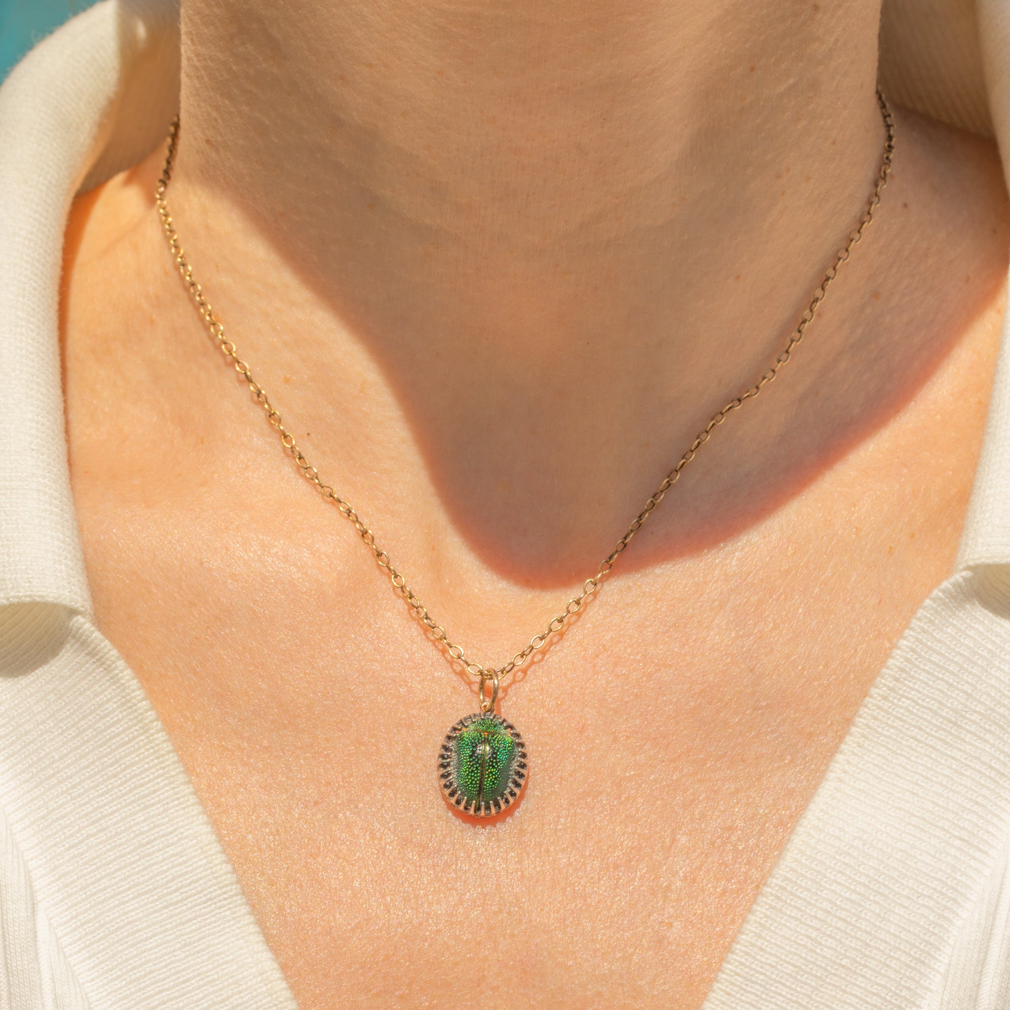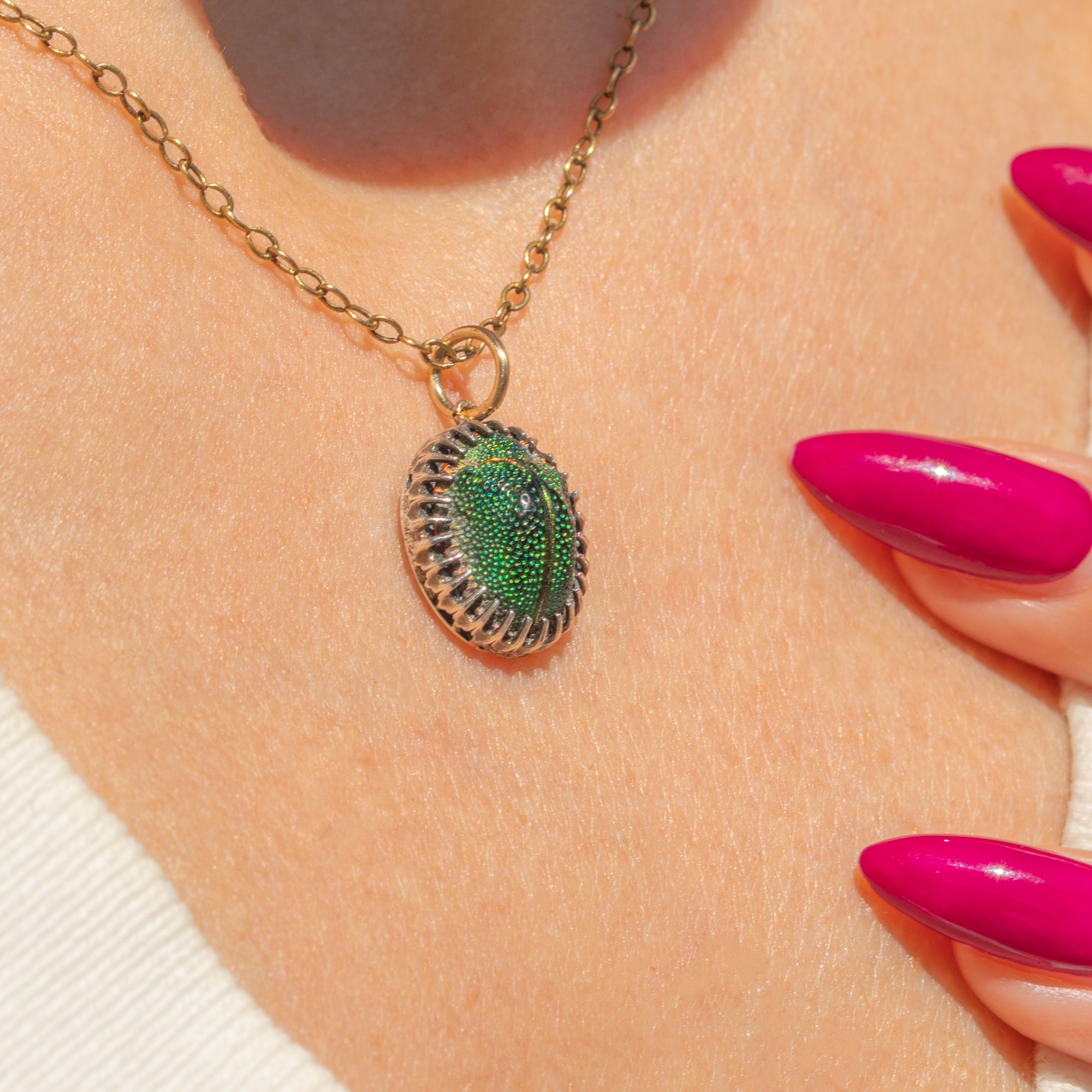 The natural Scarab Beetle boasts a deep green hue, with a gorgeous iridescence that shimmers in the light, and is displayed within striking Silver claws creating an eye-catching treasure that can easily be suspended from a skinny chain!