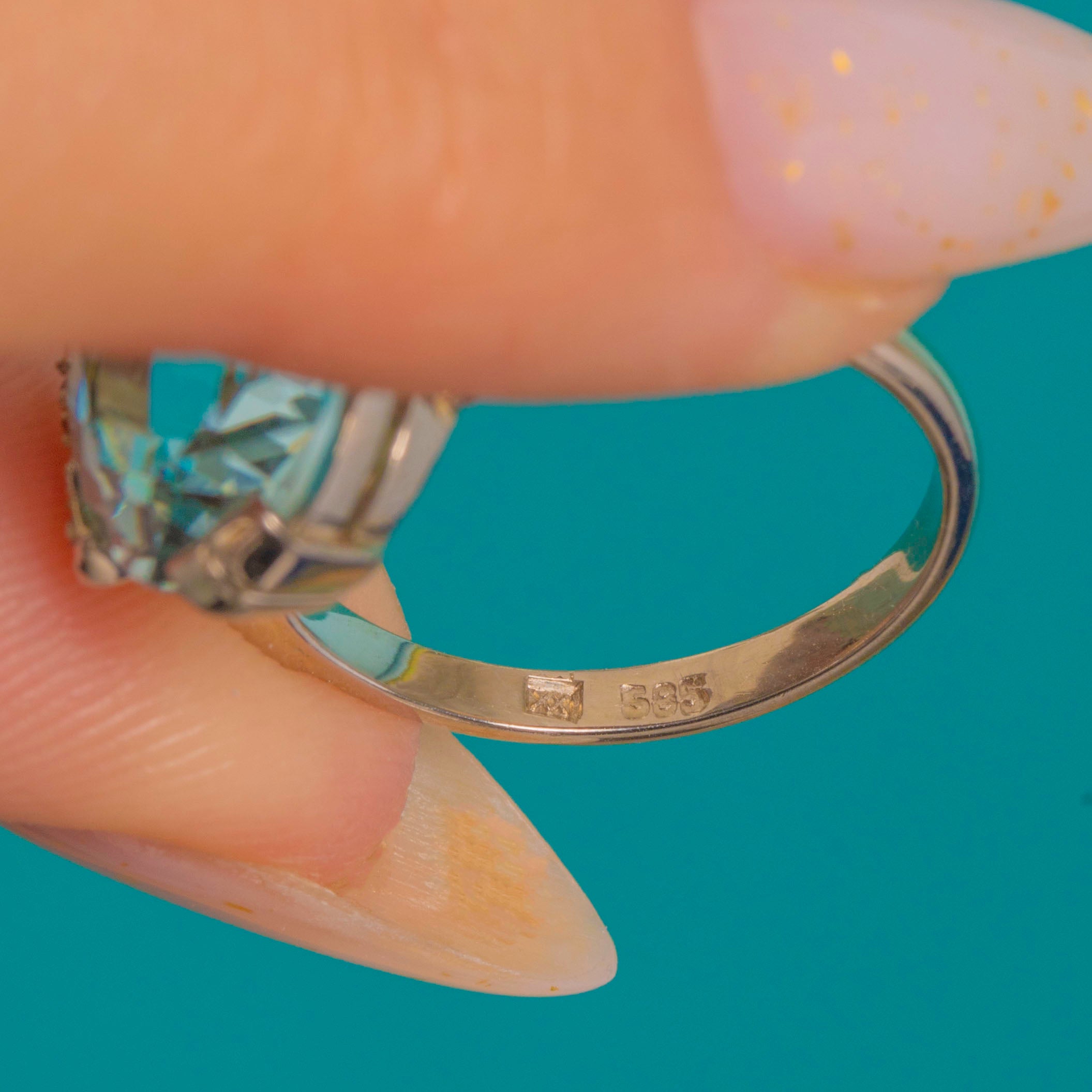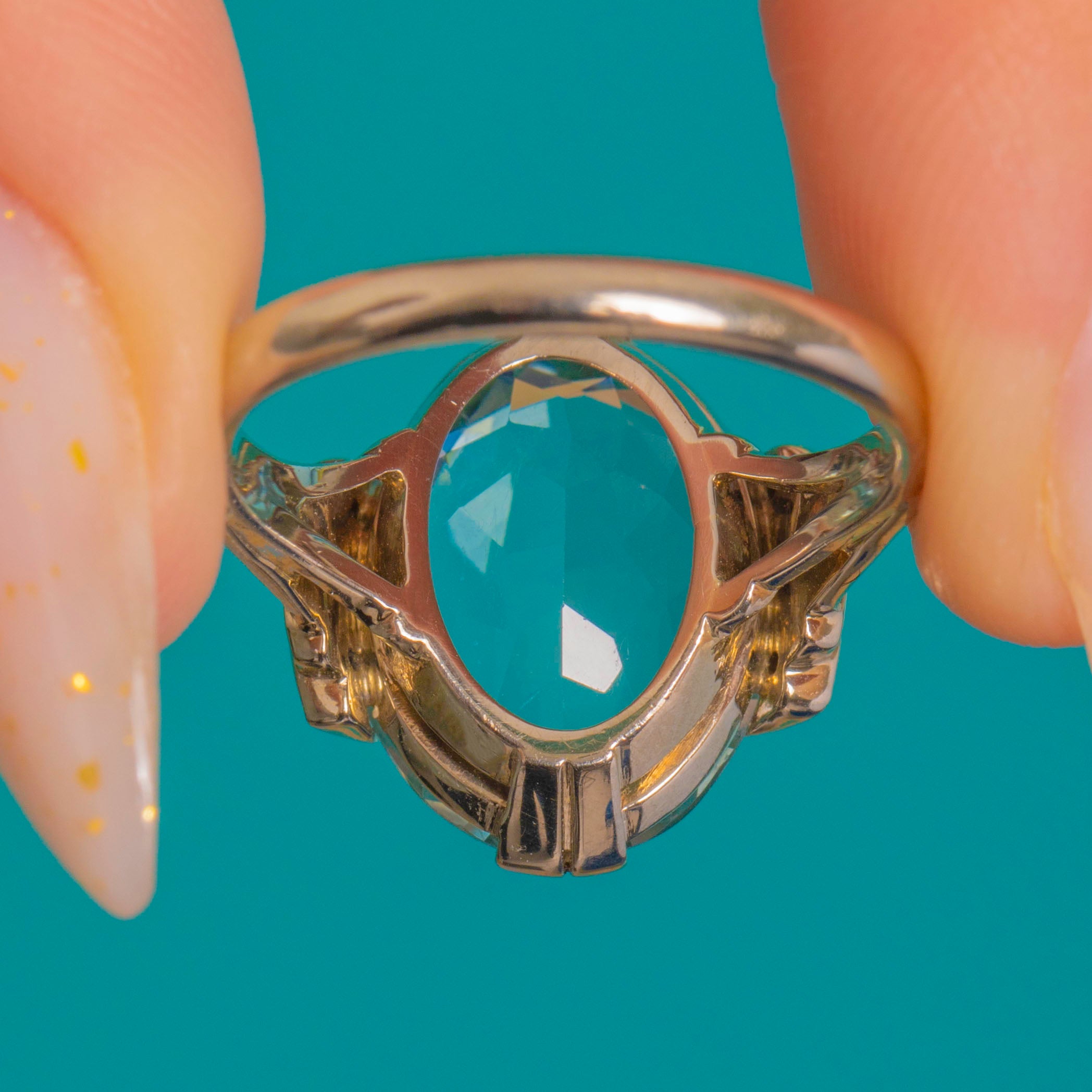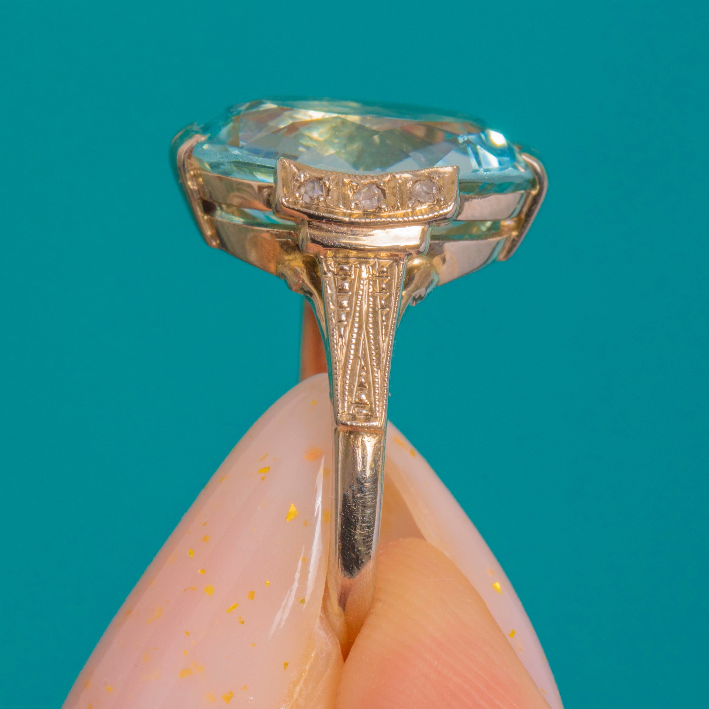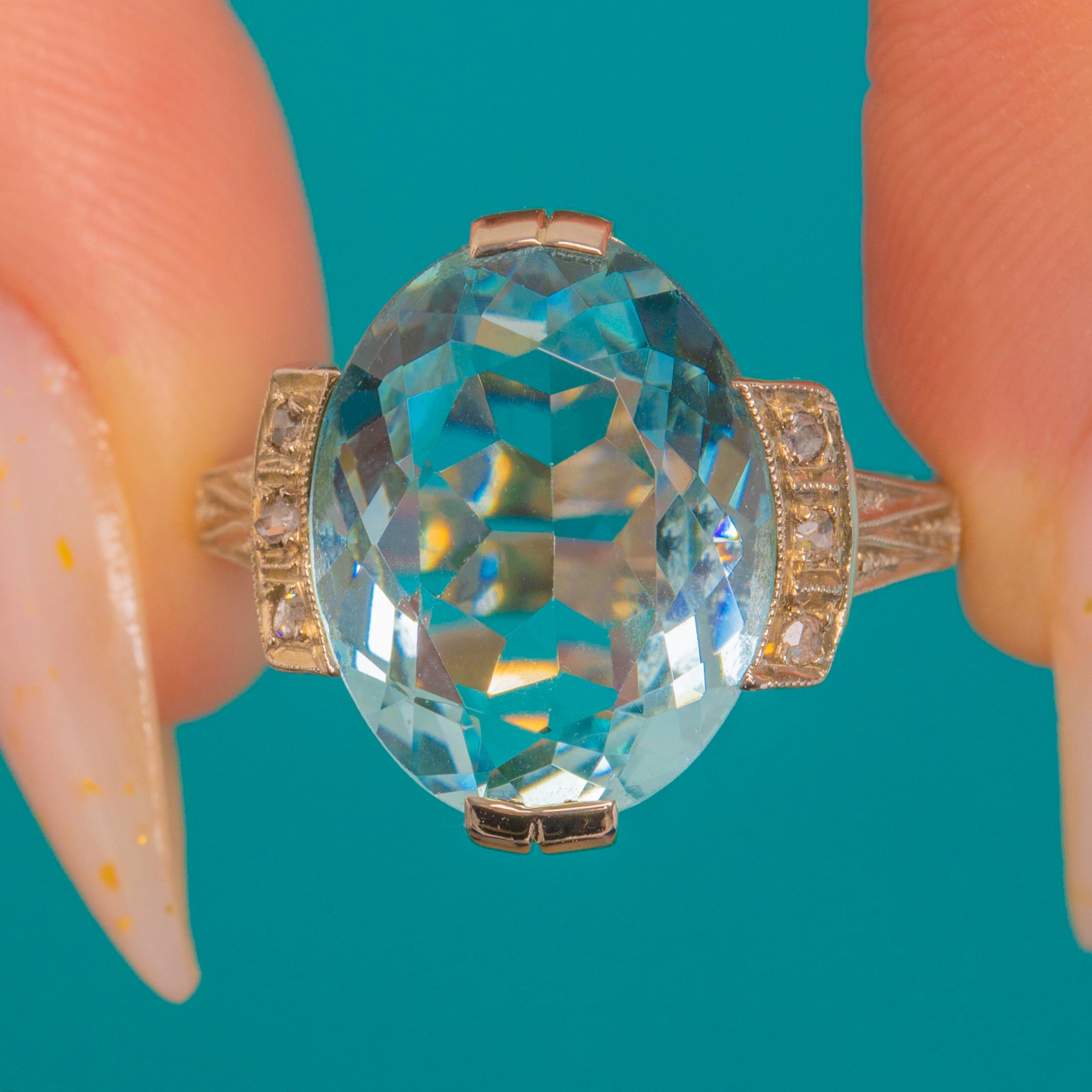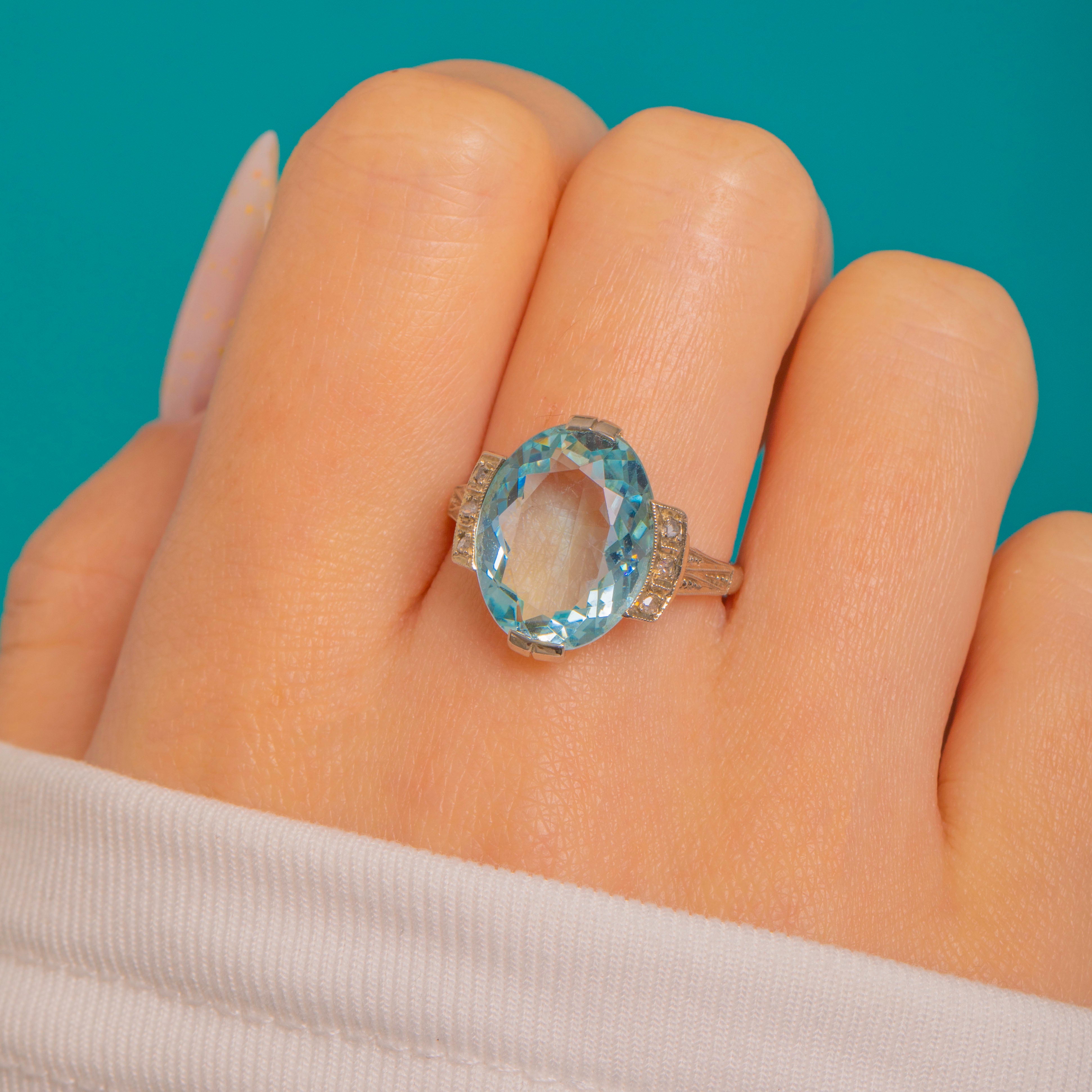 A breathtaking Continental Art Deco ring showcasing a magnificent 10.00ct Aquamarine framed by six tiny accent Diamonds. The cool, ocean-blue Aquamarine glows beautifully within its 14ct Gold mount, enhanced by three 1mm Diamonds on each shoulder for a touch of sparkle.