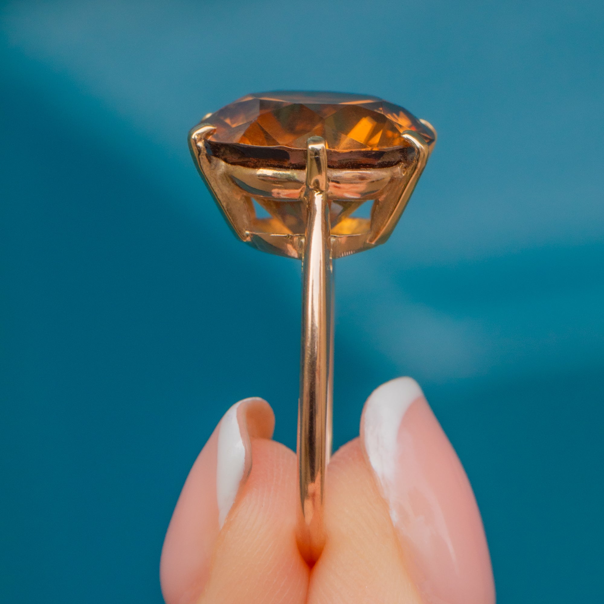 Brown Zircons are a highly sought-after gemstone, and you can see why when they look this good. The Zircon sits beautifully within a 9ct Gold basket allowing the light to stream through from all angles, leading out onto a 14ct Gold band that wraps around your finger with undeniable luxury!