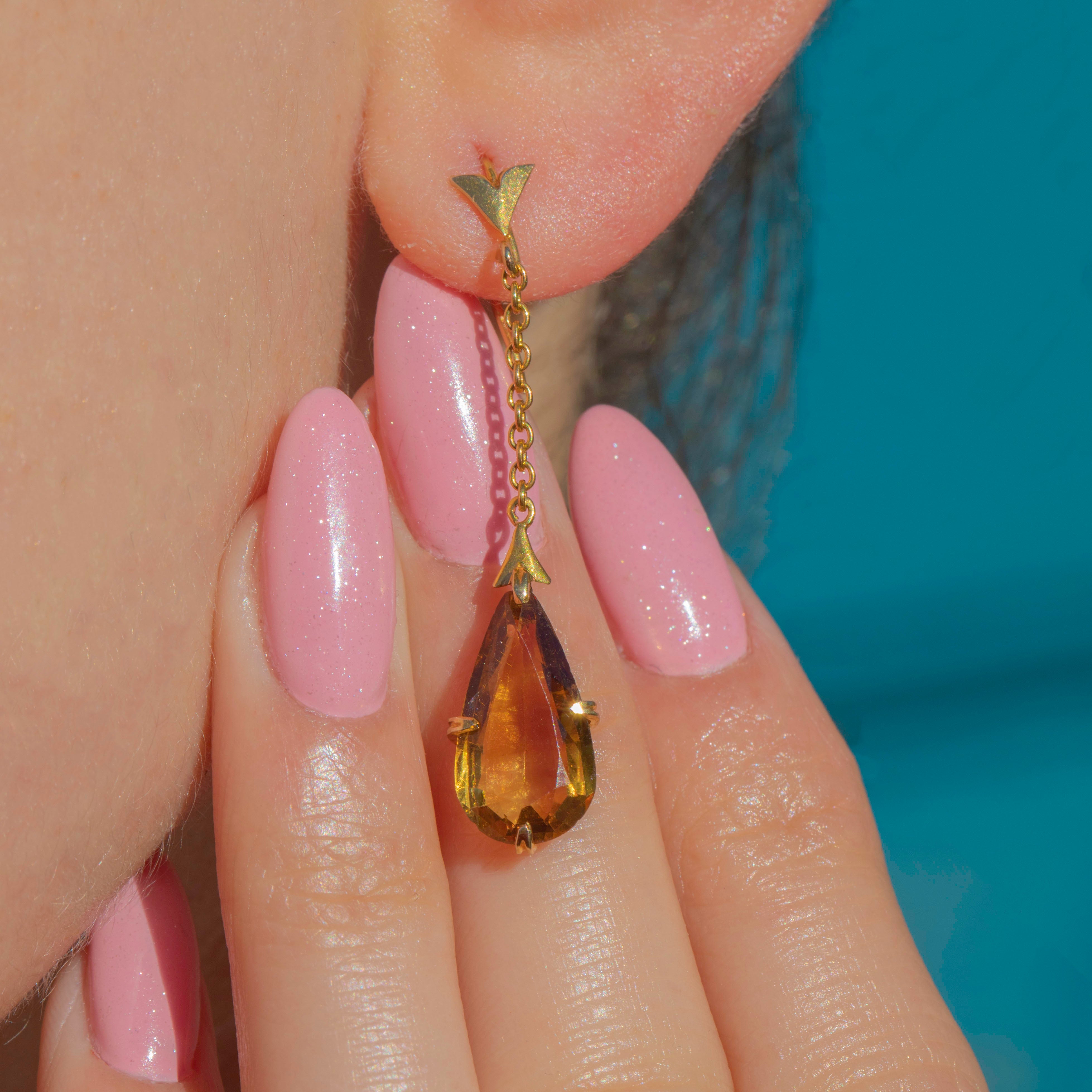 Like droplets of honey, each earring features a radiant pear-cut Citrine, faceted wonderfully to catch the light. They are set within buttery 14ct Gold claws and suspended from a fine chain, providing these Art Deco earrings with a lovely movement.