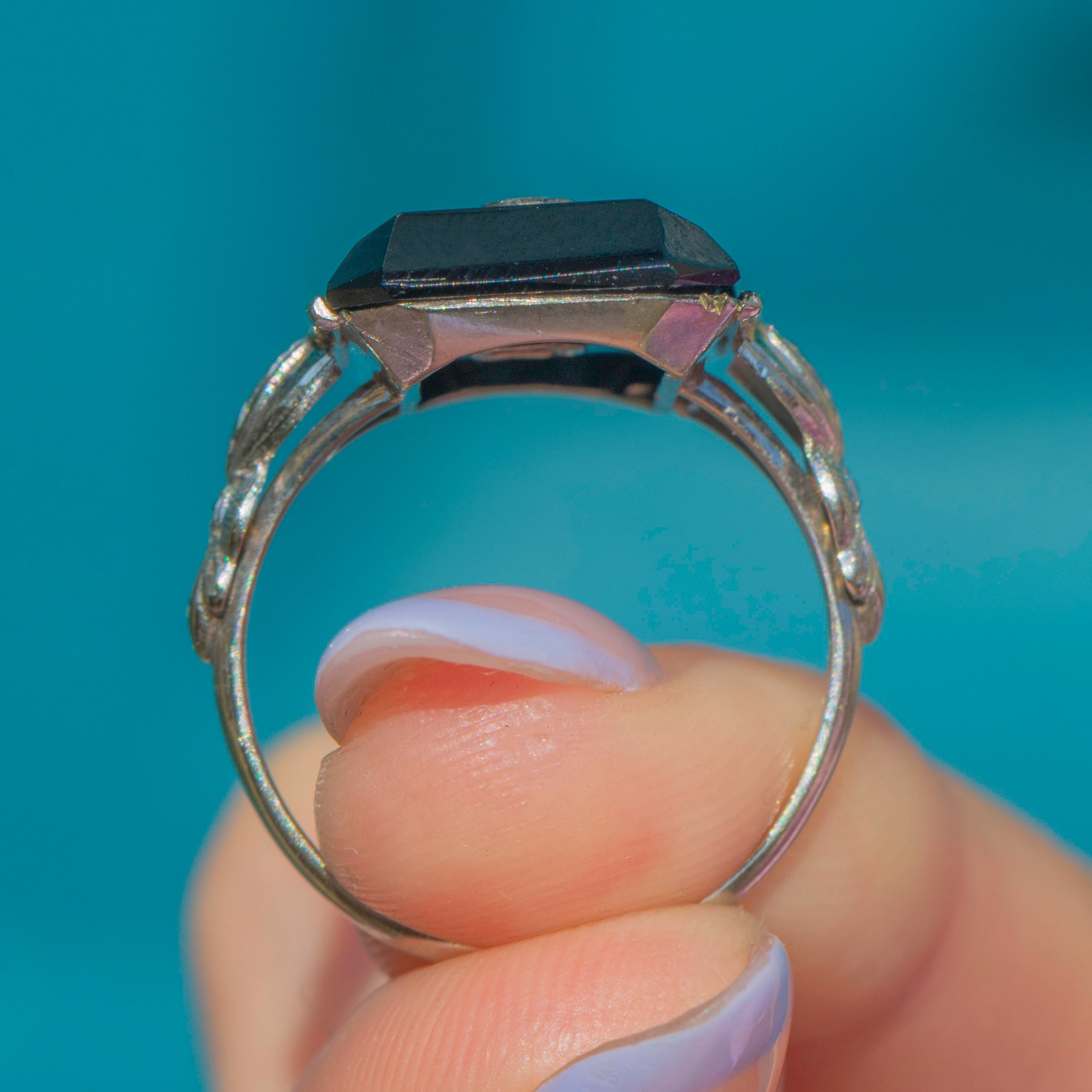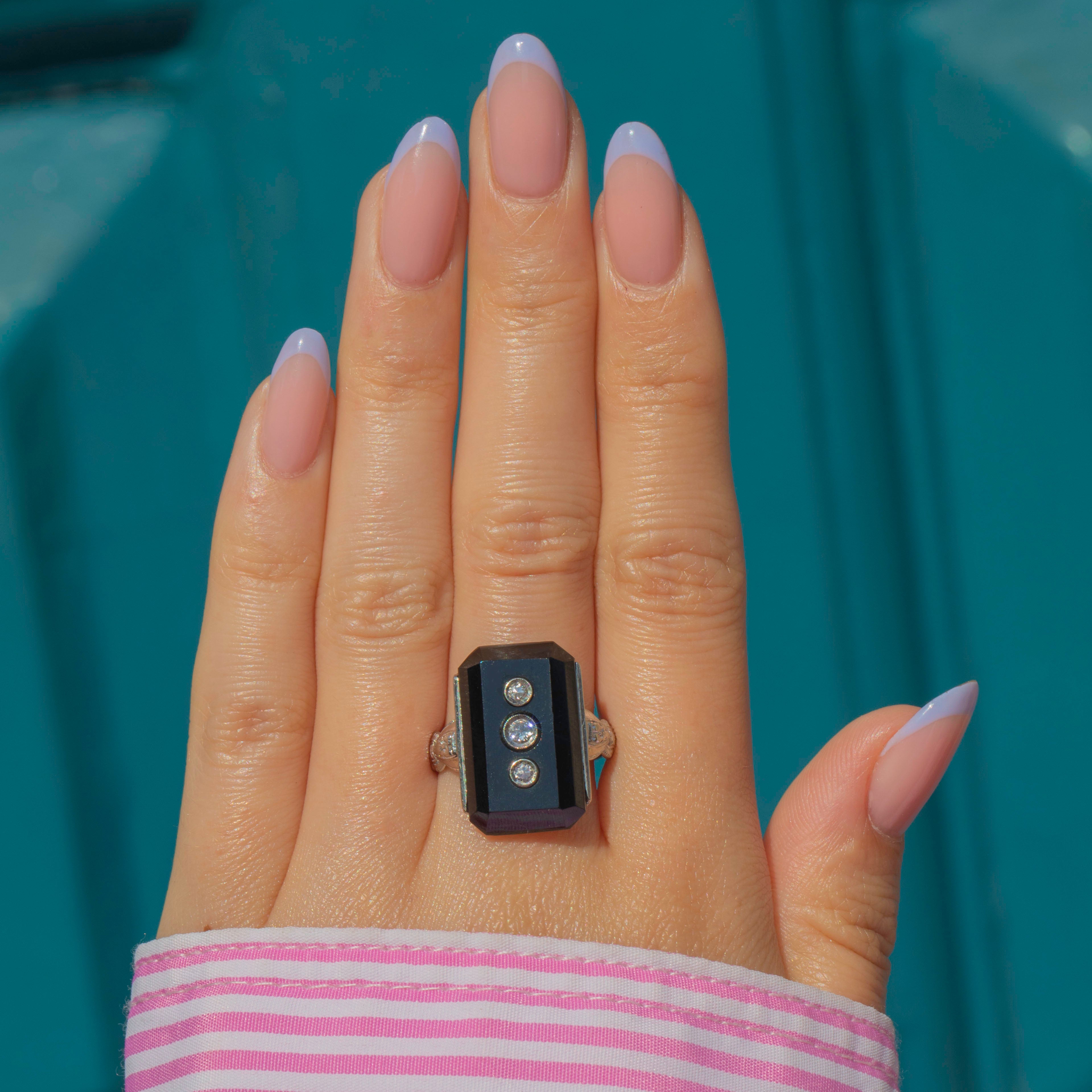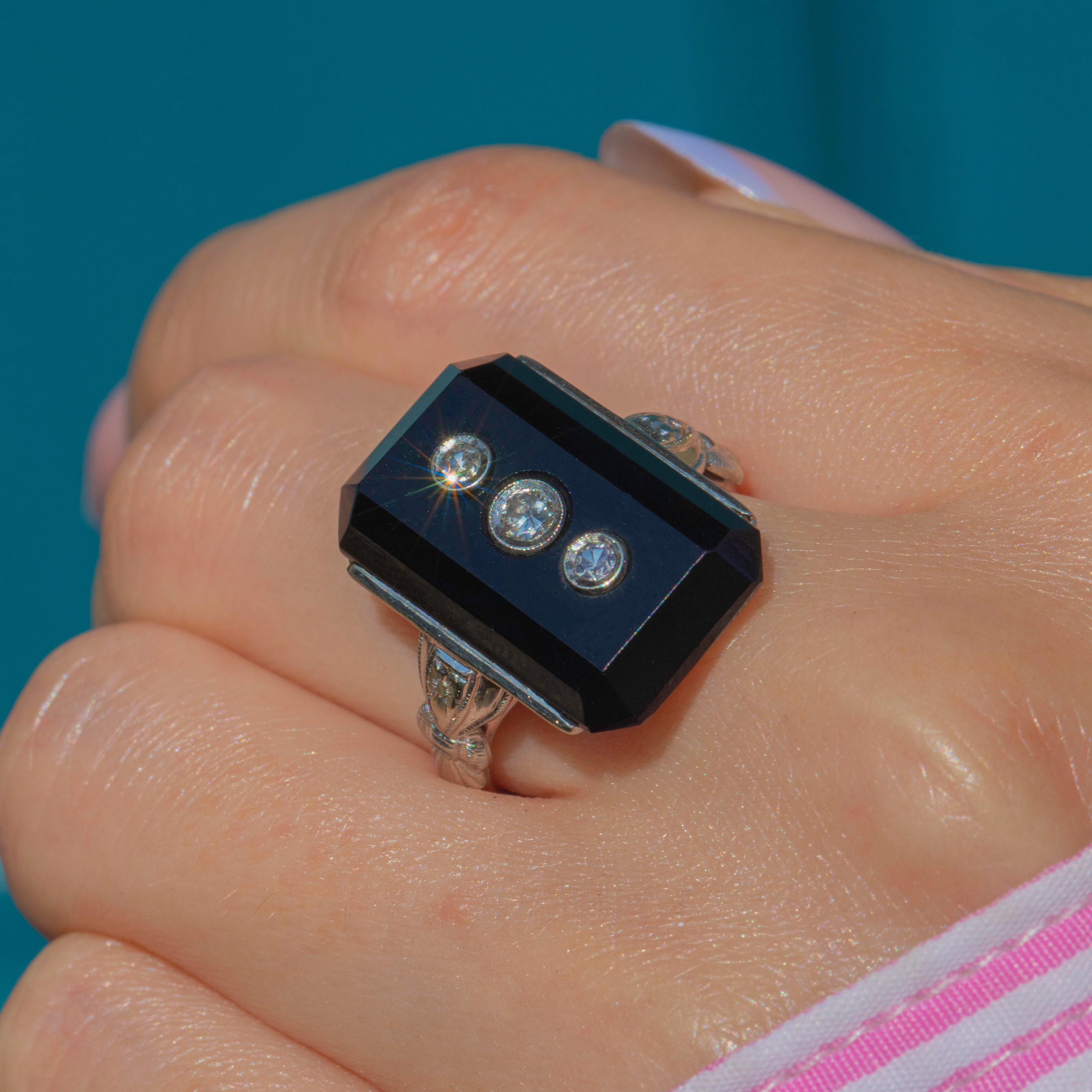 The boldly faceted Onyx is flanked by intricately engraved shoulders, boasting delicate geometric details. The craftsmanship of this Art Deco ring is truly exceptional and perfectly captures the opulence of the era. If you have a penchant for outstanding jewels, this antique Onyx Diamond ring is a must for your collection!