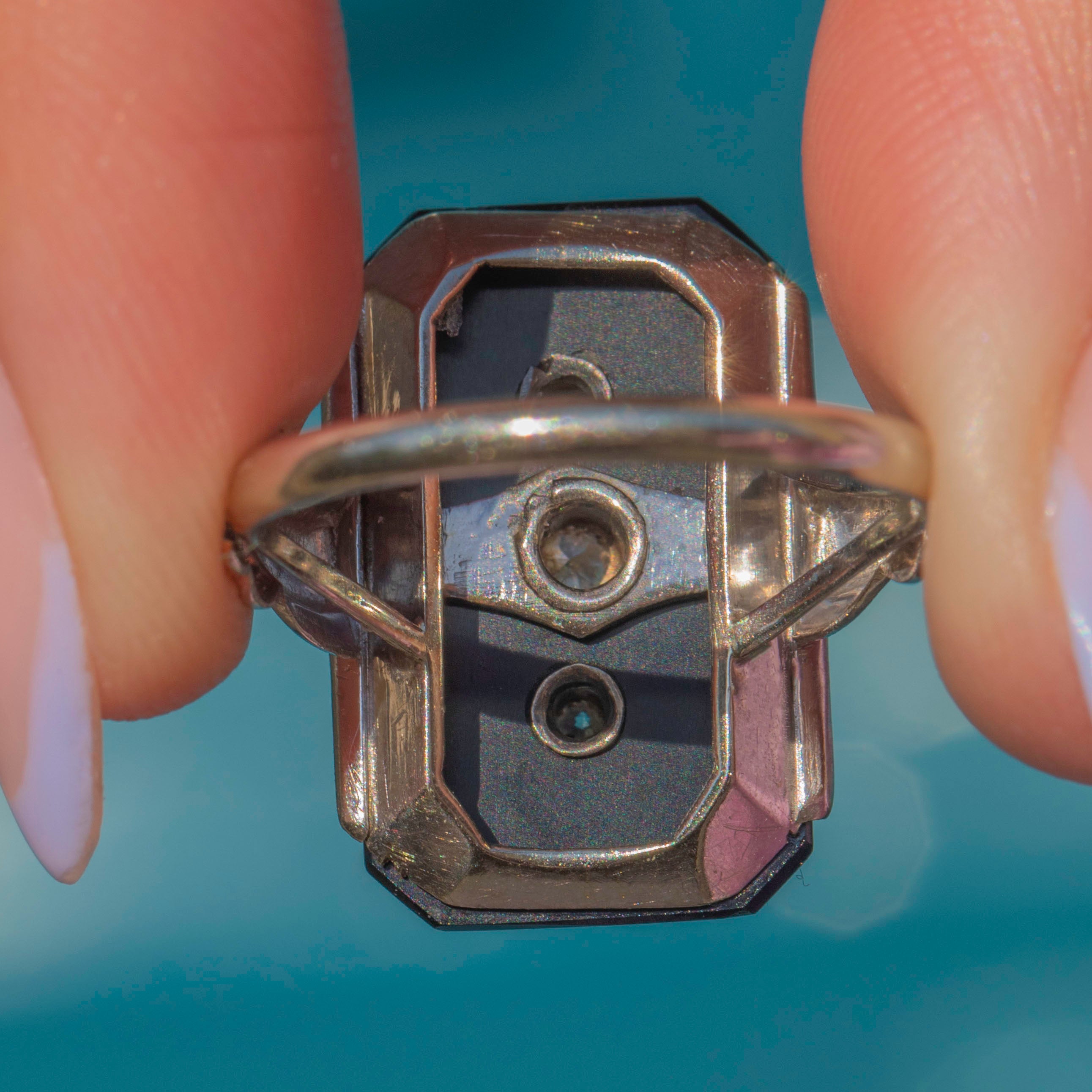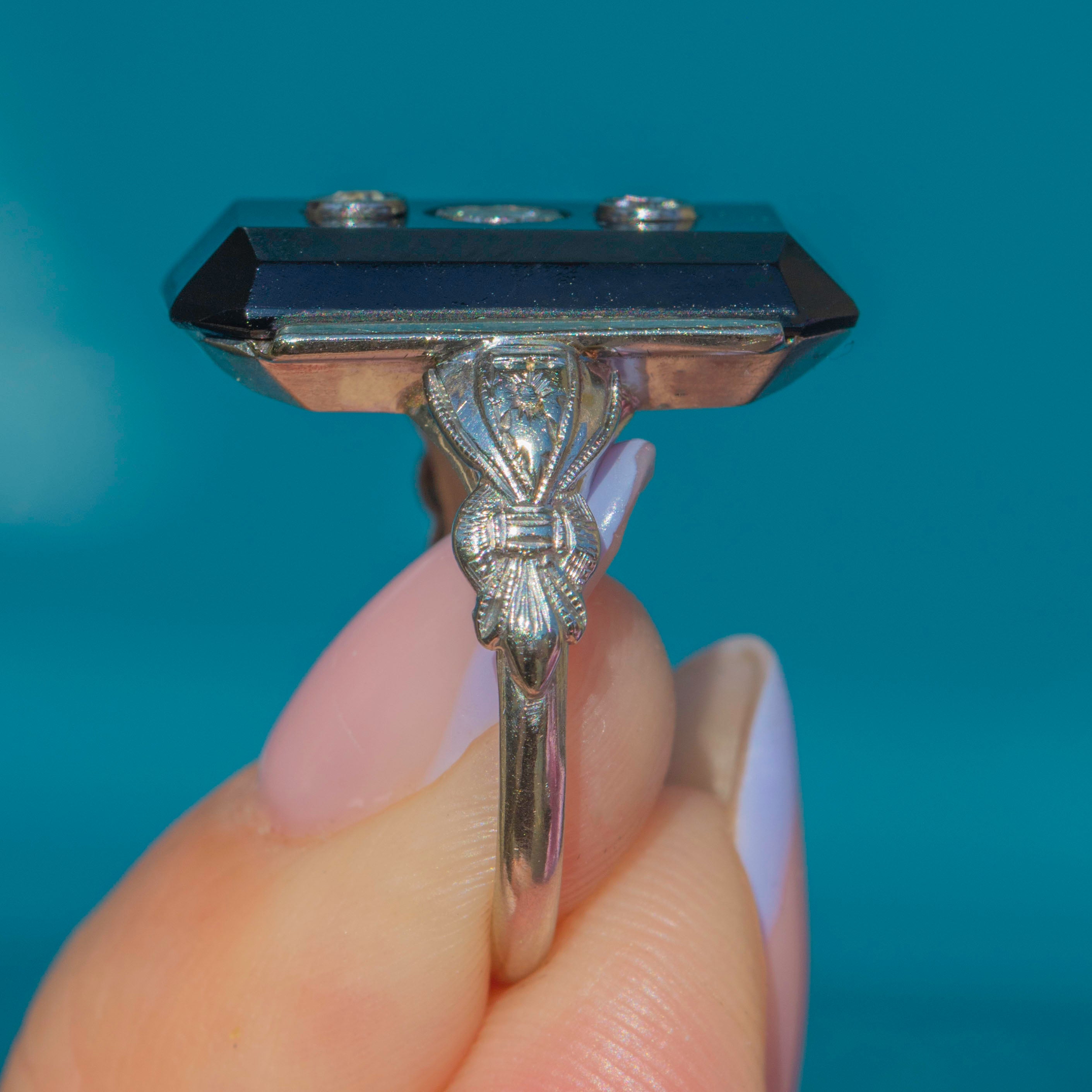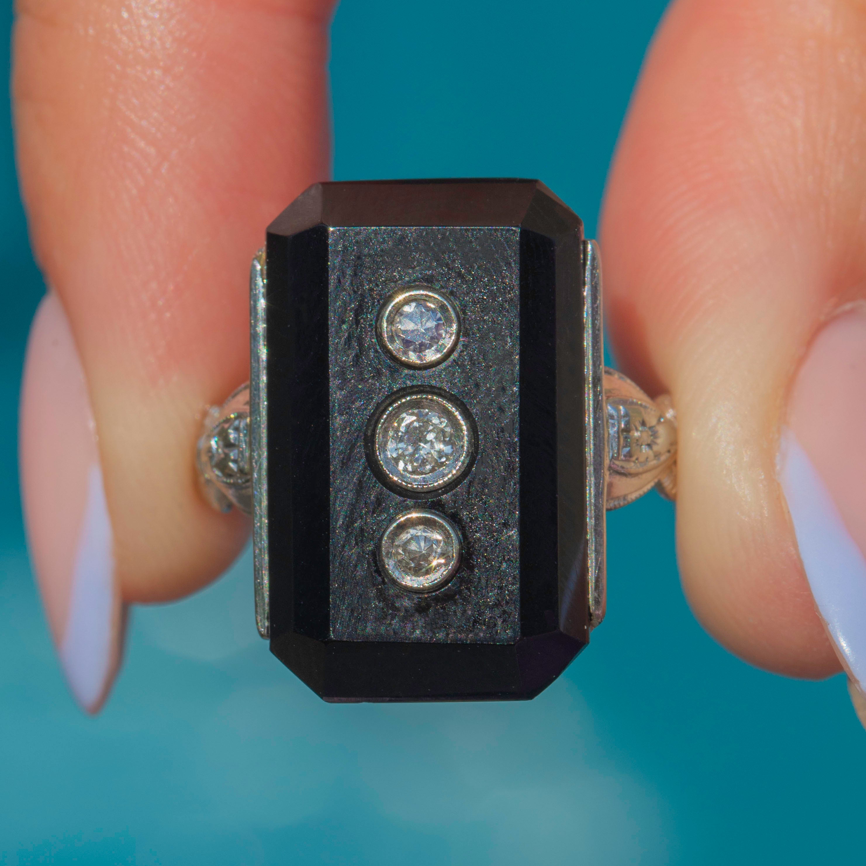 The boldly faceted Onyx is flanked by intricately engraved shoulders, boasting delicate geometric details. The craftsmanship of this Art Deco ring is truly exceptional and perfectly captures the opulence of the era. If you have a penchant for outstanding jewels, this antique Onyx Diamond ring is a must for your collection!