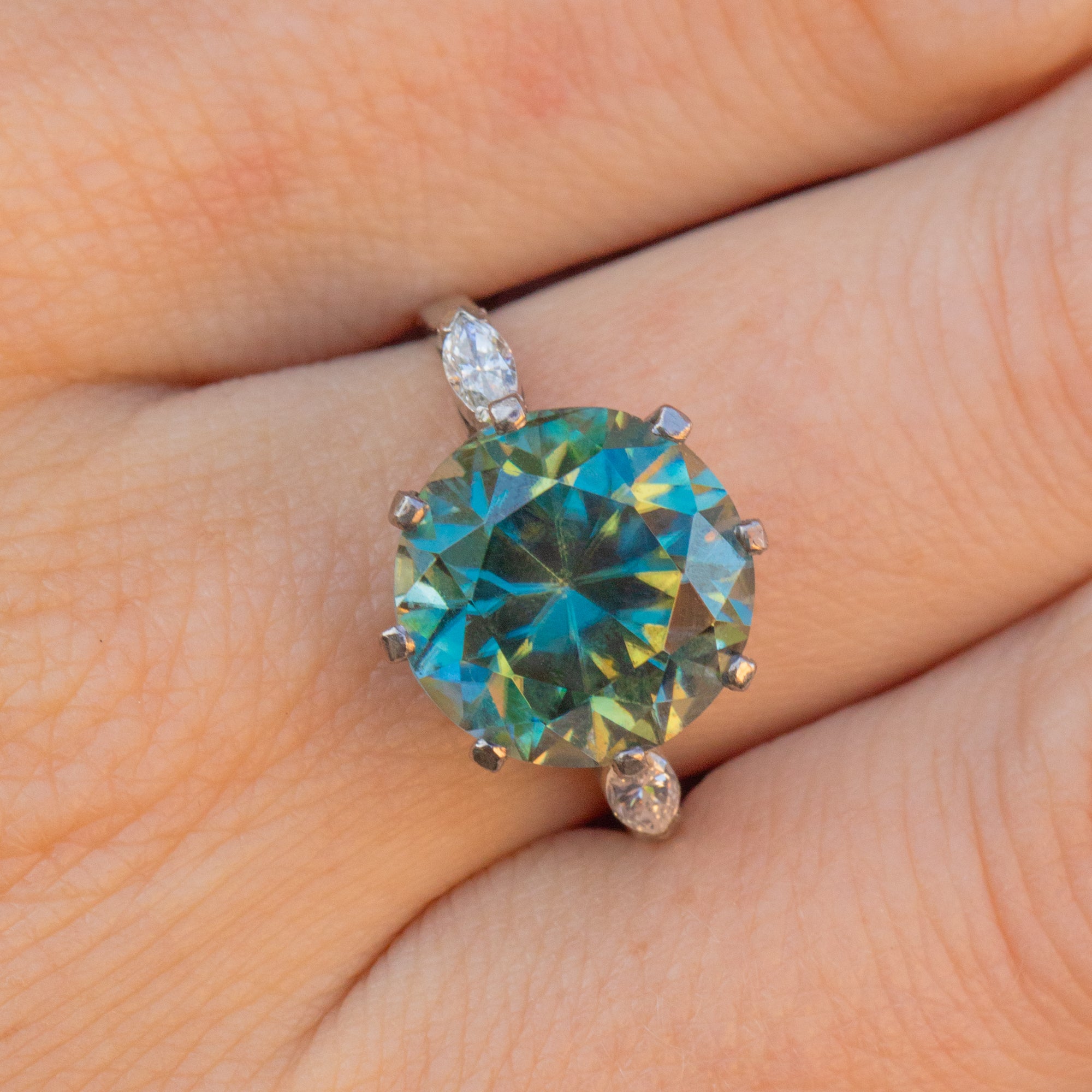 This Art Deco 14ct Gold and Platinum Blue Zircon Diamond ring is a phenomenal find! This lively blue Zircon ring leaves little to the imagination, with its 7.70ct blue Zircon gemstone taking centre stage.
