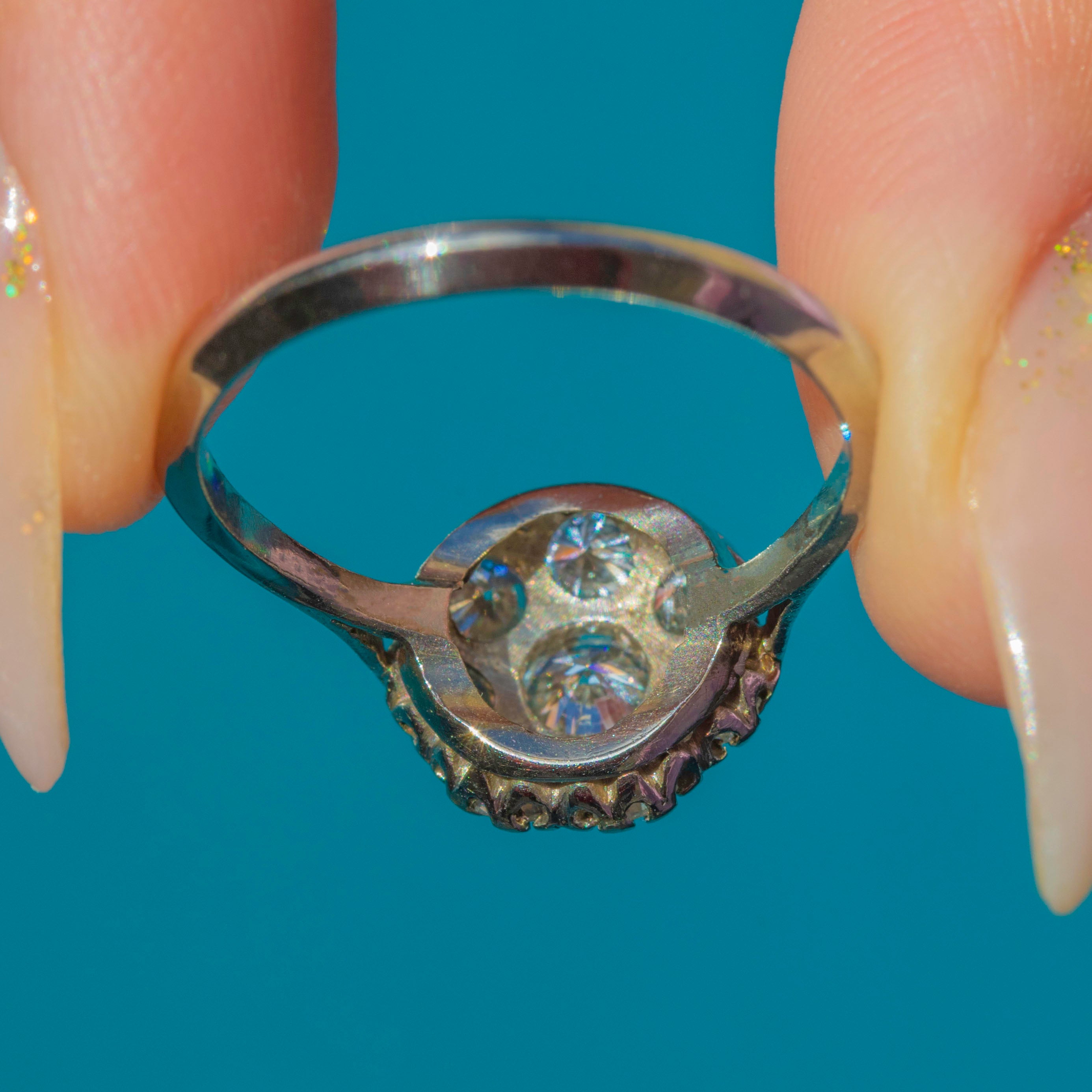This dazzling Art Deco cluster ring is crafted in 14ct White Gold with a Platinum shank, set with a lively 1.05ct of bright Diamonds. The central 4.5mm stone is encircled by a halo of seven 3mm Diamonds, forming a radiant flower-like cluster with beautiful sparkle and symmetry. The knife-edge shank enhances the ring’s bold yet refined design.