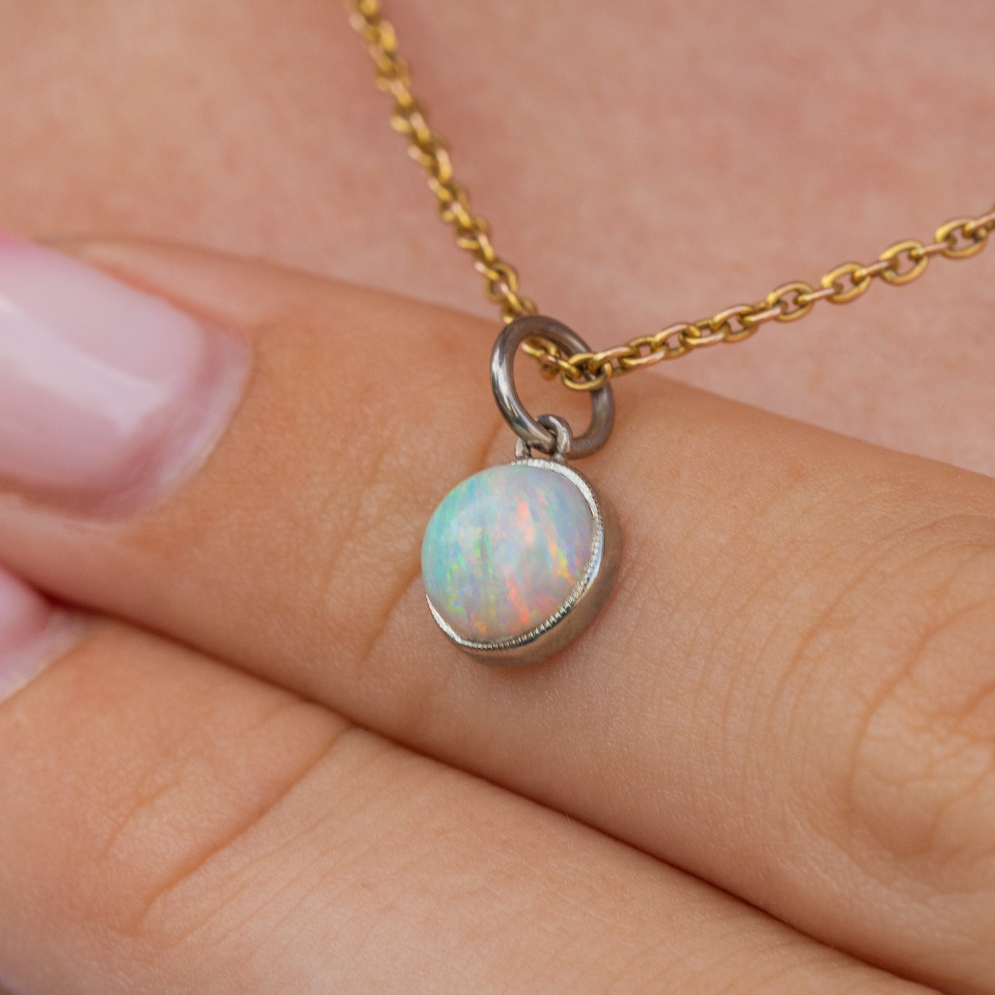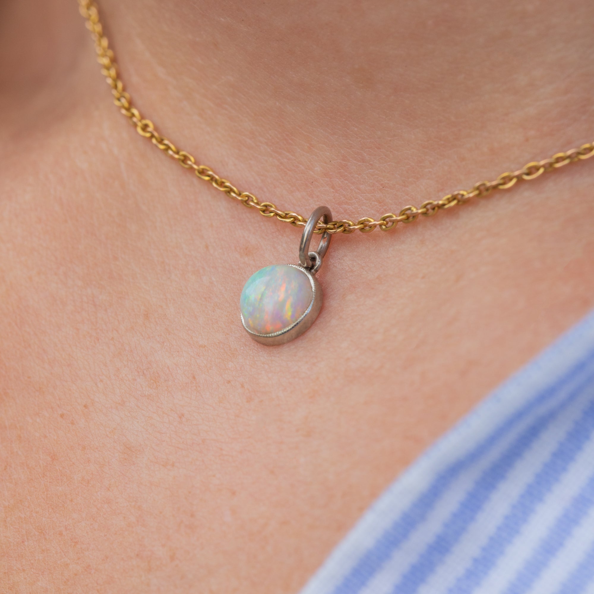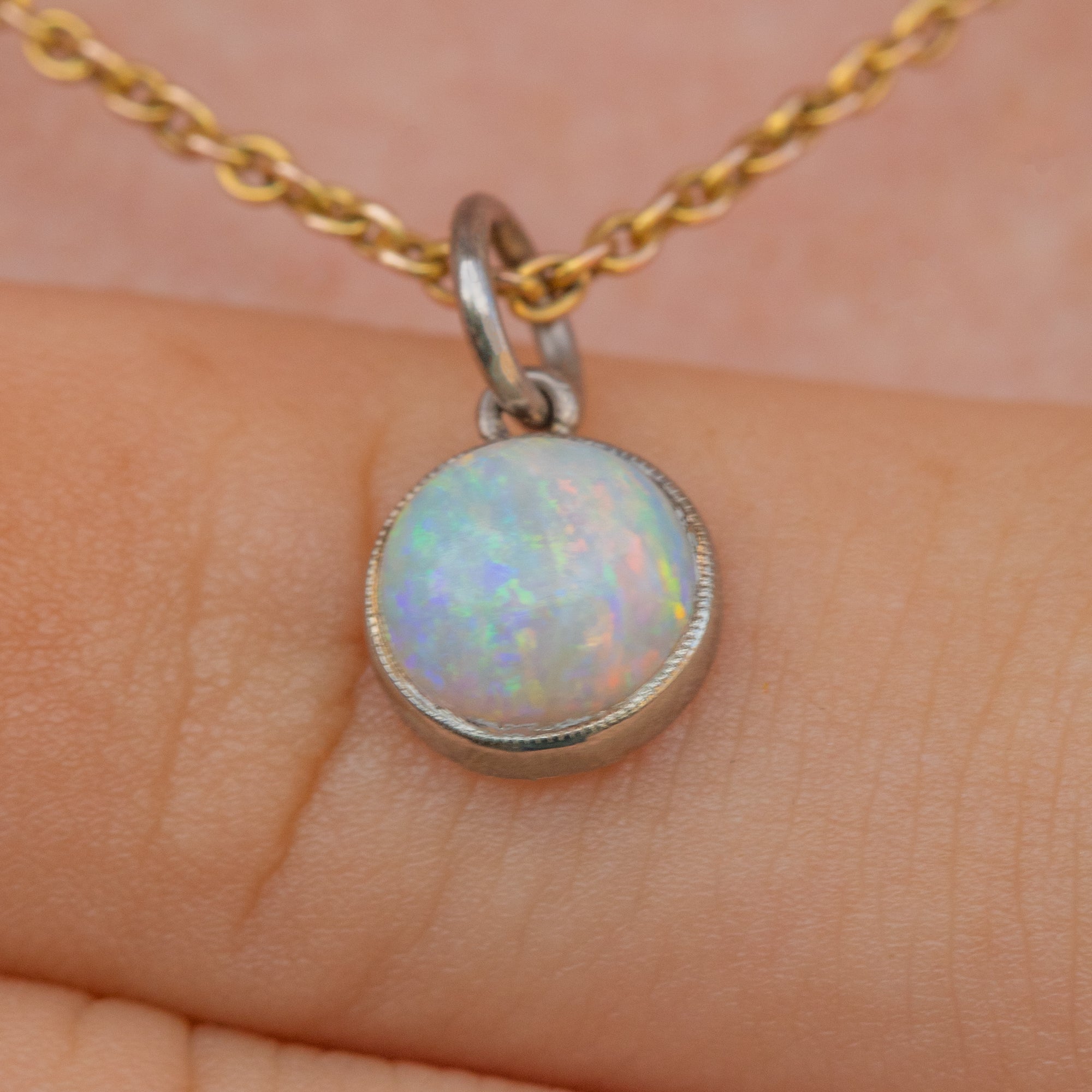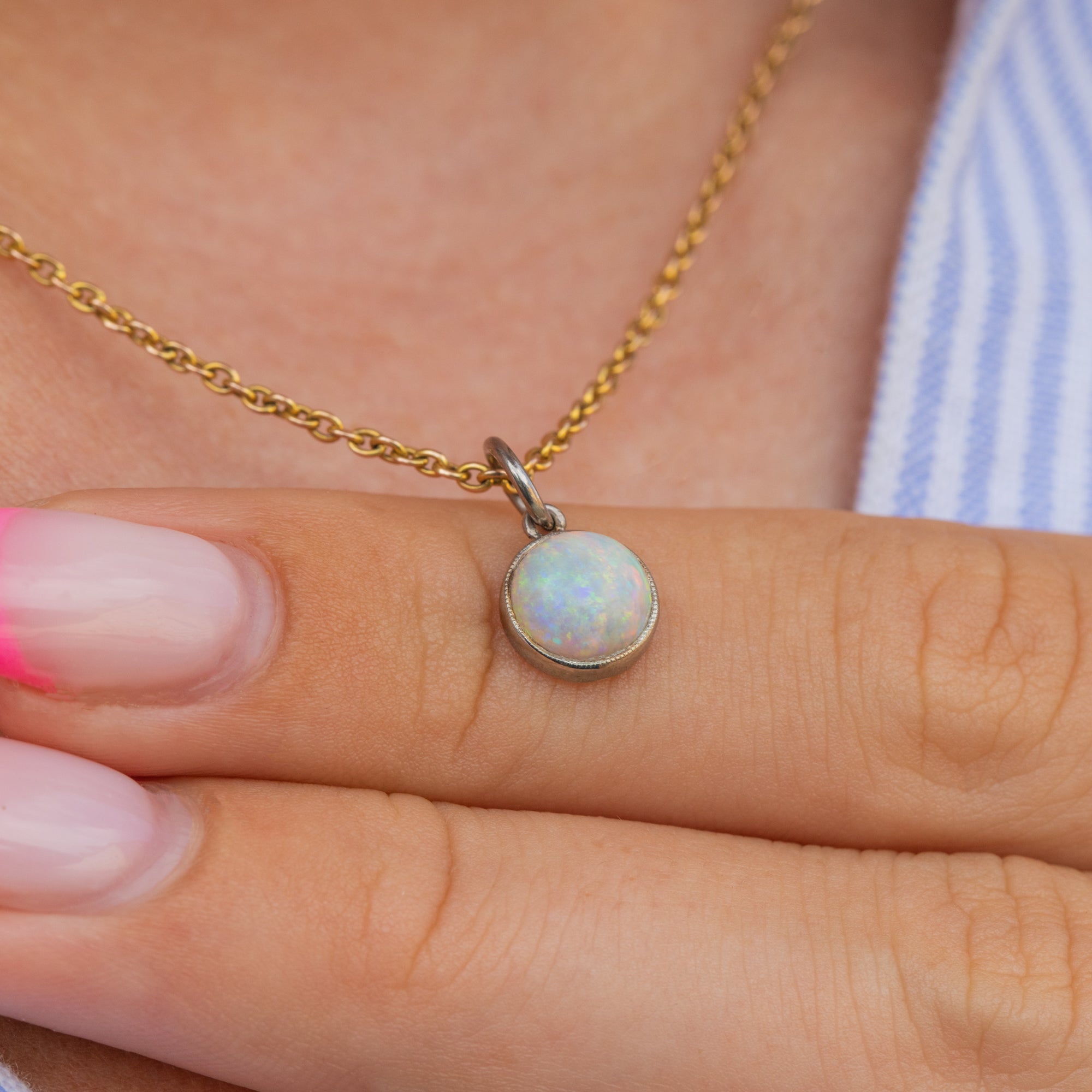 Dainty and elegant, this Art Deco charm is crafted from lustrous 14ct white Gold, its bezel setting hugging the Opal snugly and glimmering with a stunning array of colour as it catches the light. Simply pair this magical Opal pendant with a dainty Gold chain of your preferred length for a timeless look.