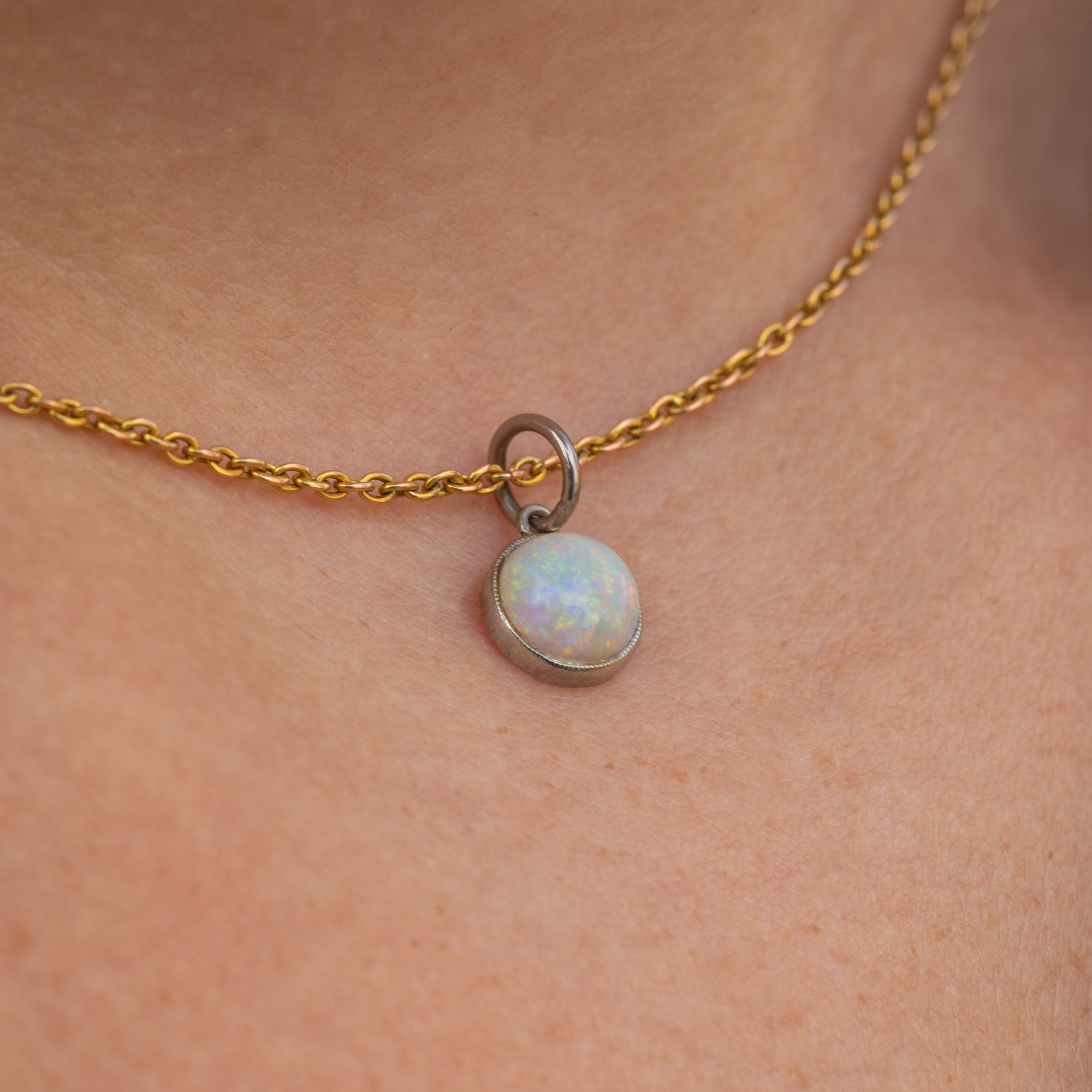 EXCELLENT. This Art Deco 14ct white Gold Opal charm is in excellent condition! The Opal sits securely, with a fiery play of colour and no damage to note. There is some subtle wear on the back of the charm due to a previous conversion but this does not affect her structural integrity. A perfect pick for lovers of a rainbow colour palette!