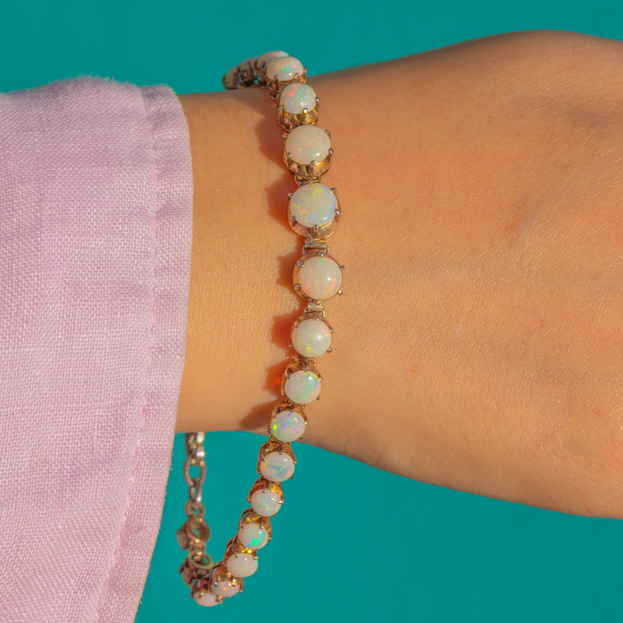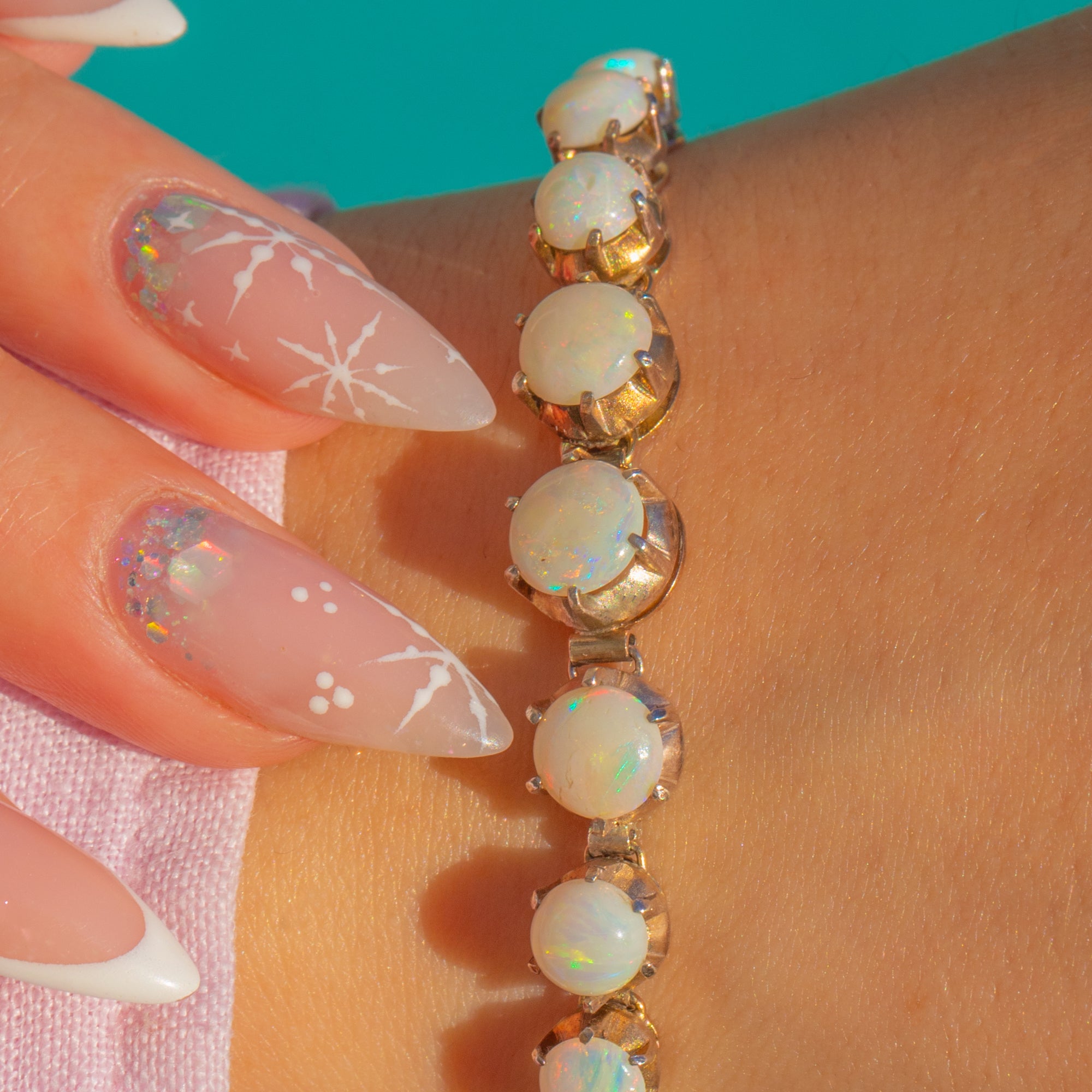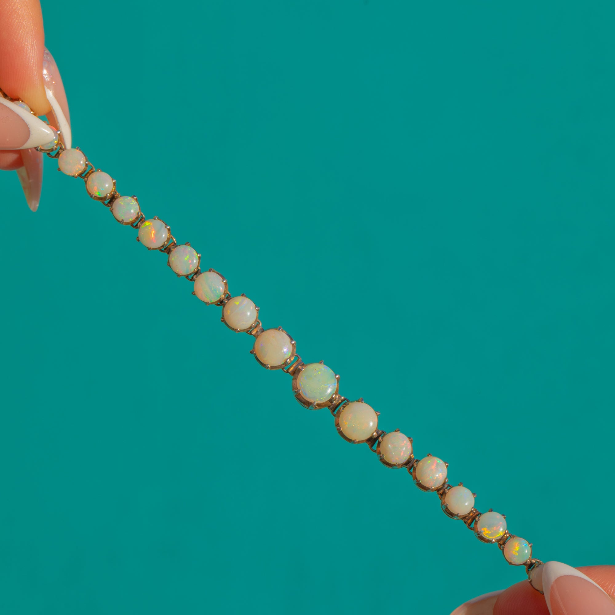 The stones graduate gently from 4mm to 7mm, creating a balanced and elegant rhythm across the wrist. Each Opal shows soft, luminous flashes of colour typical of vintage Opals from this period.