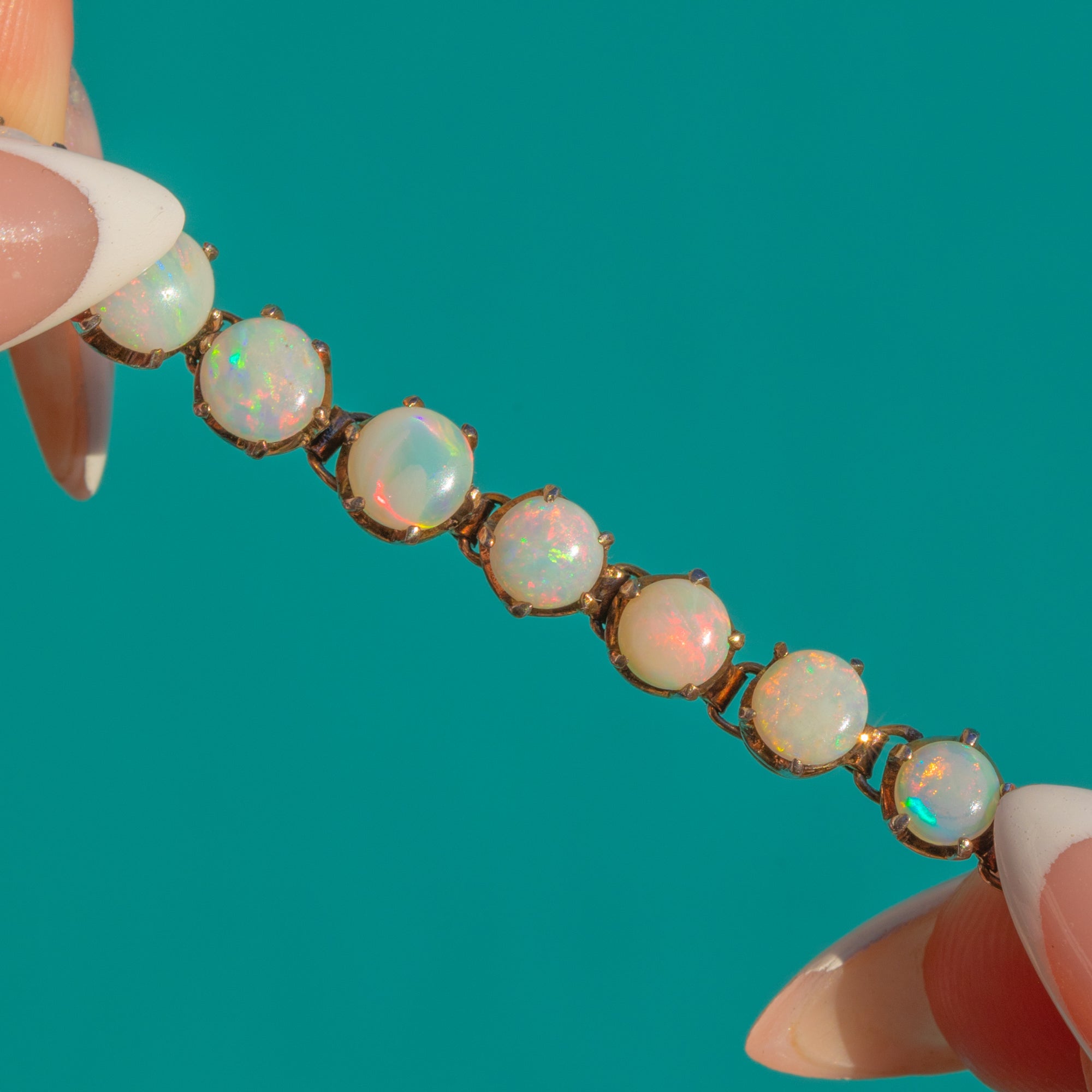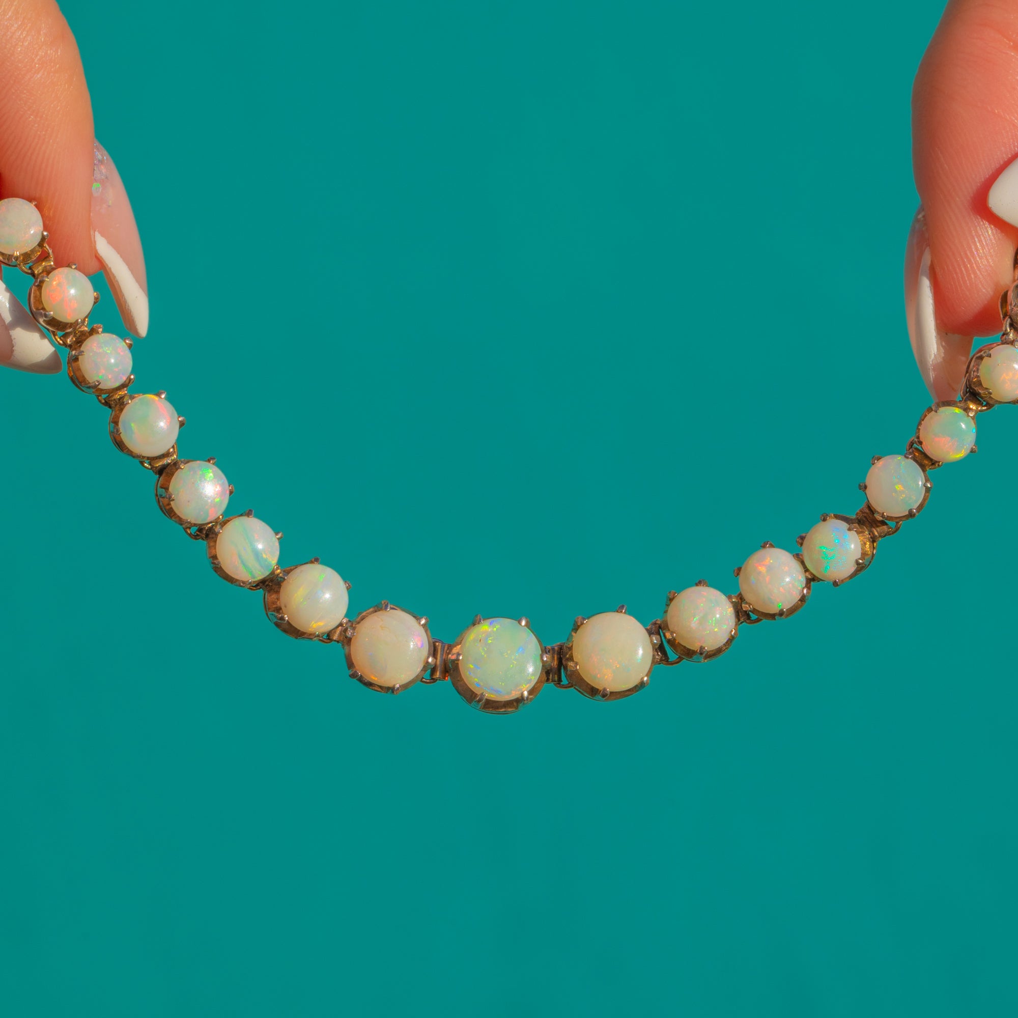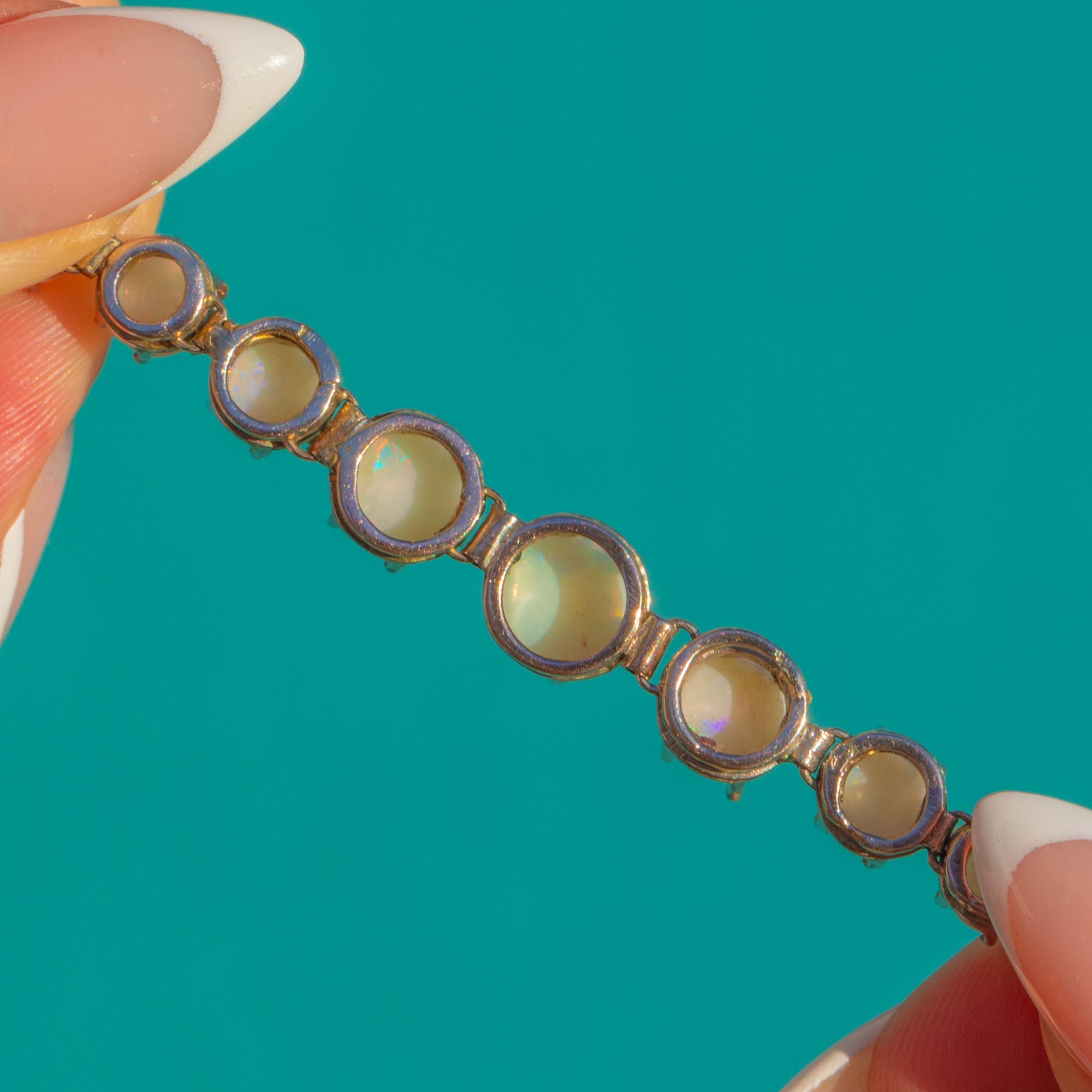 The stones graduate gently from 4mm to 7mm, creating a balanced and elegant rhythm across the wrist. Each Opal shows soft, luminous flashes of colour typical of vintage Opals from this period.