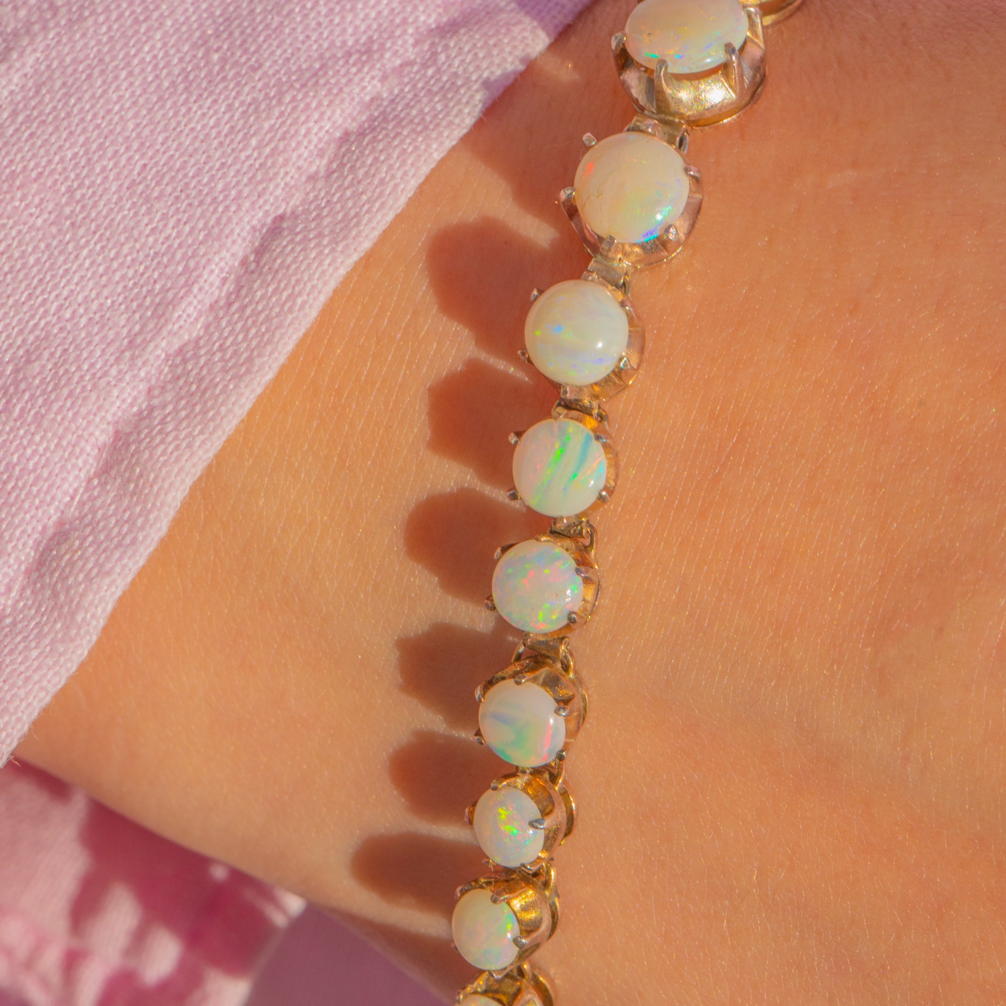 This late Art Deco Opal line bracelet is an exceptionally beautiful piece, set with approximately 15.00 carats of natural solid Opals.