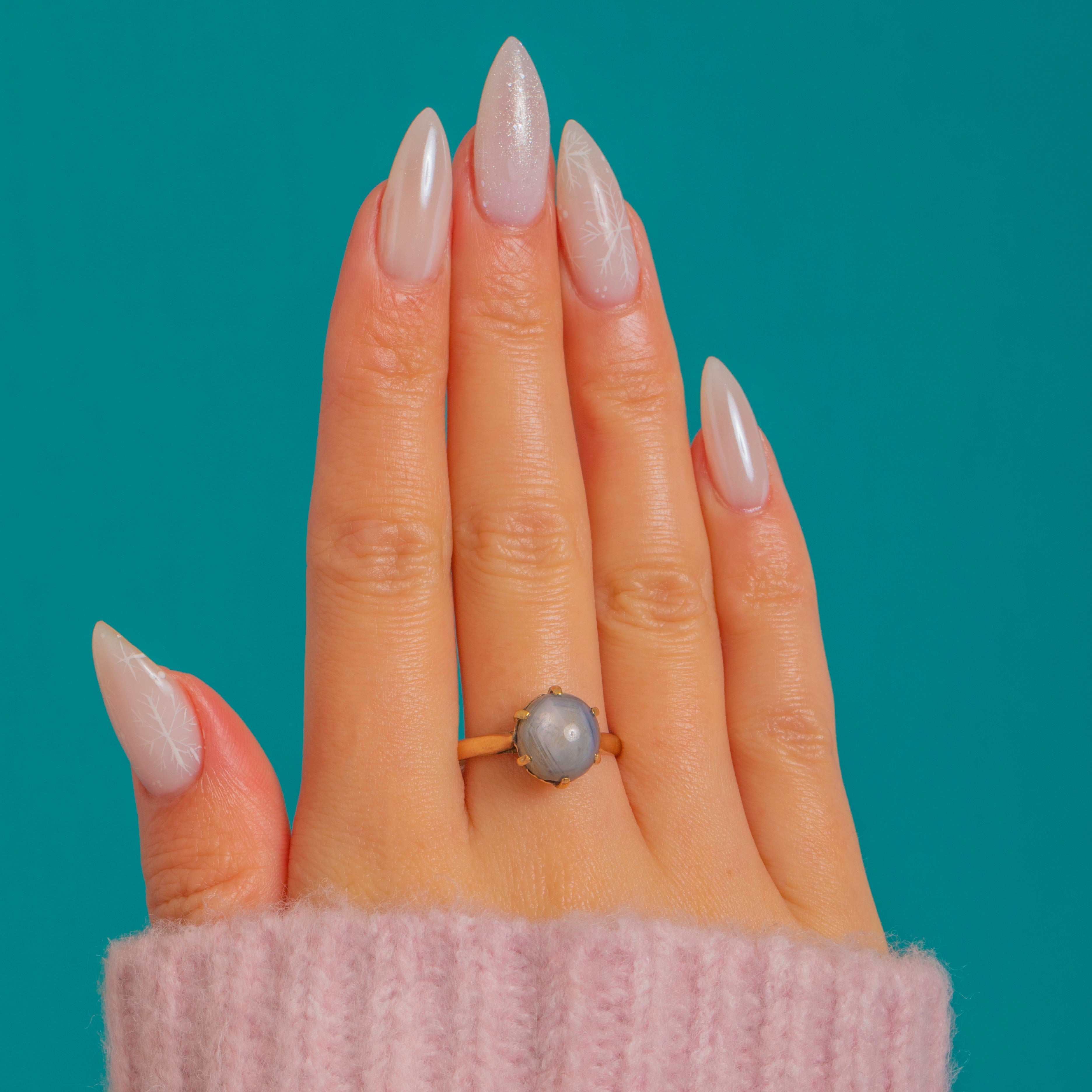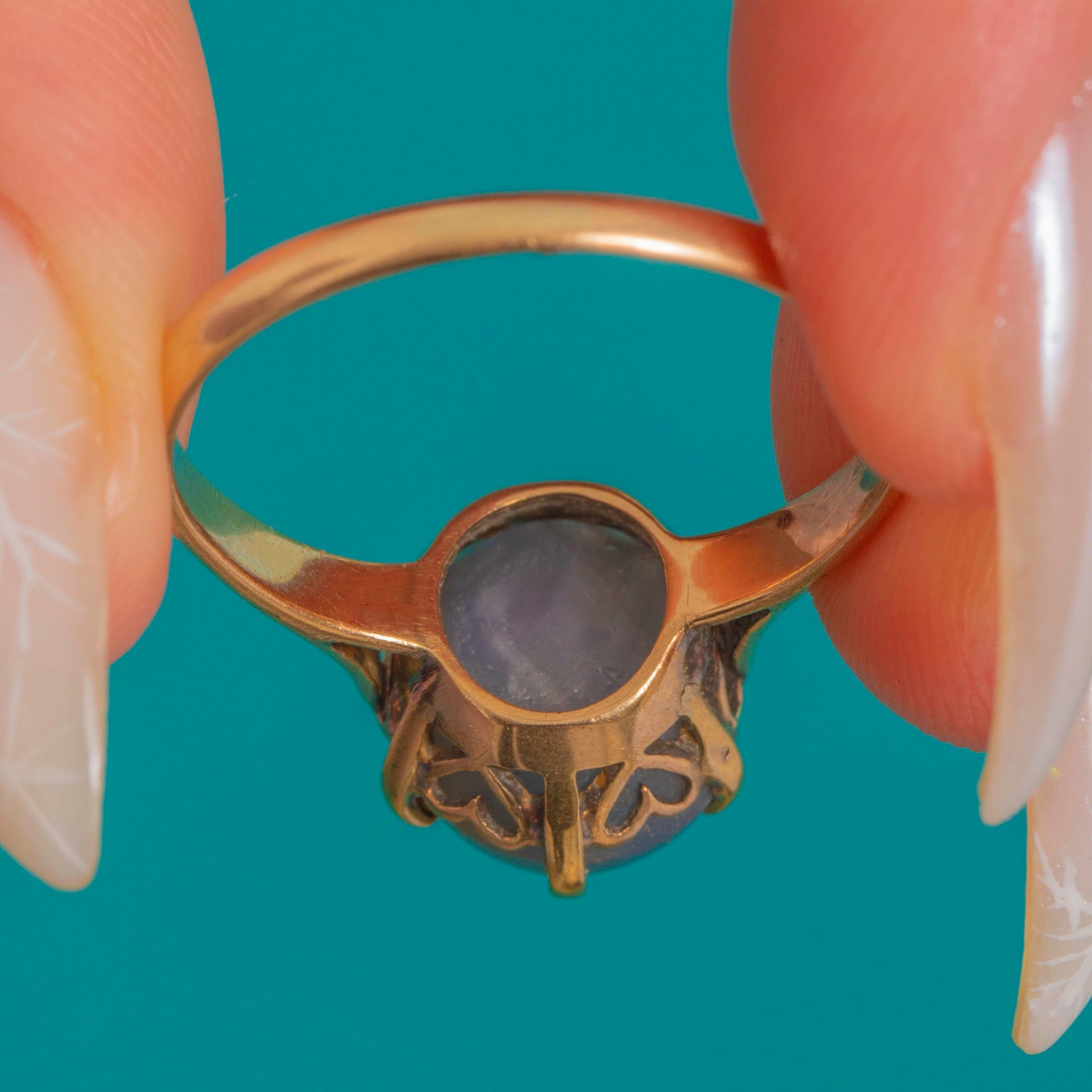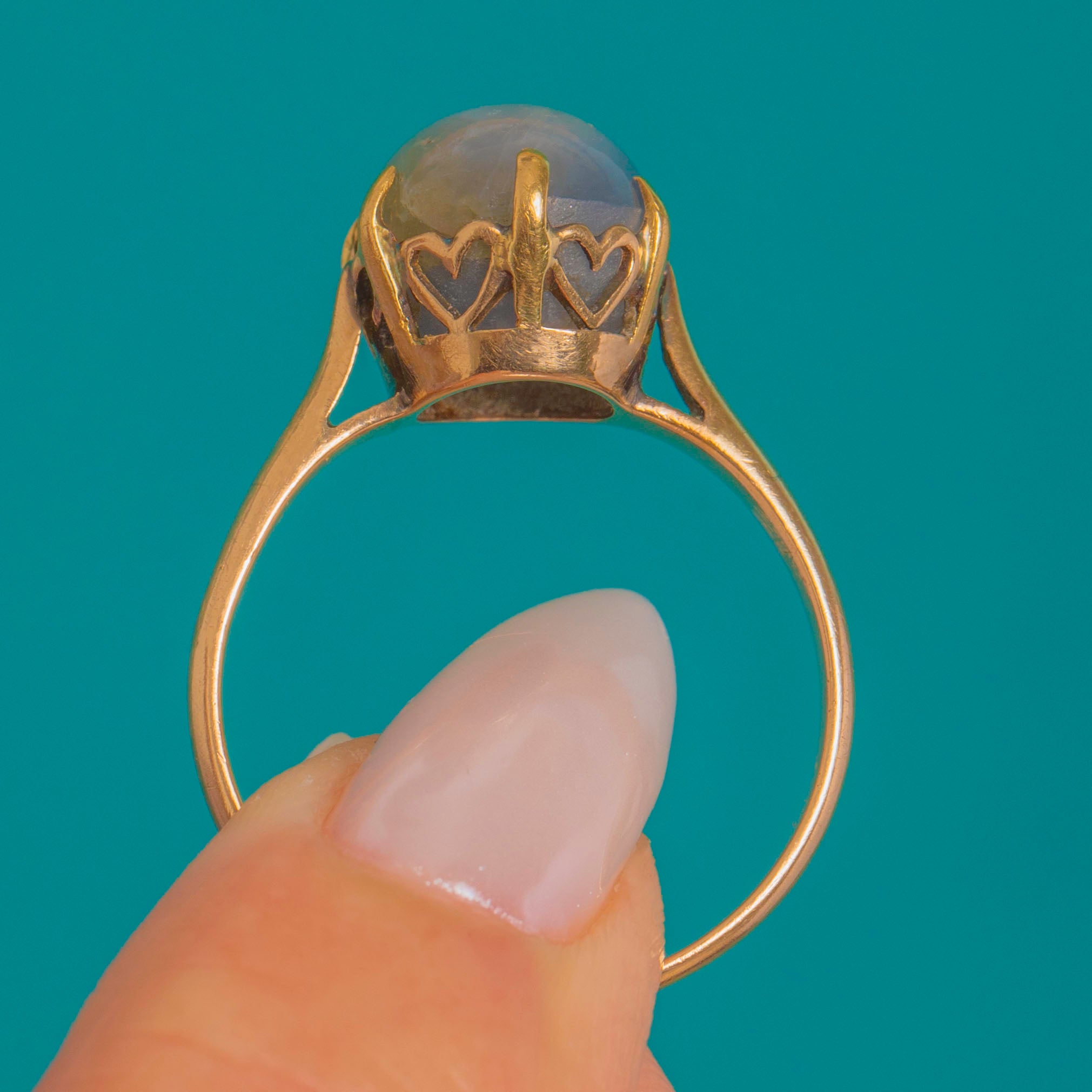 This romantic Art Deco solitaire centres a Natural Star Blue Sapphire, its high-domed cabochon glowing in soft blue with a gentle star-like sheen under the light. The gemstone is cradled in a tall coronet head with a pierced gallery featuring sweet heart/trefoil motifs, all crafted in rich 15ct Gold.