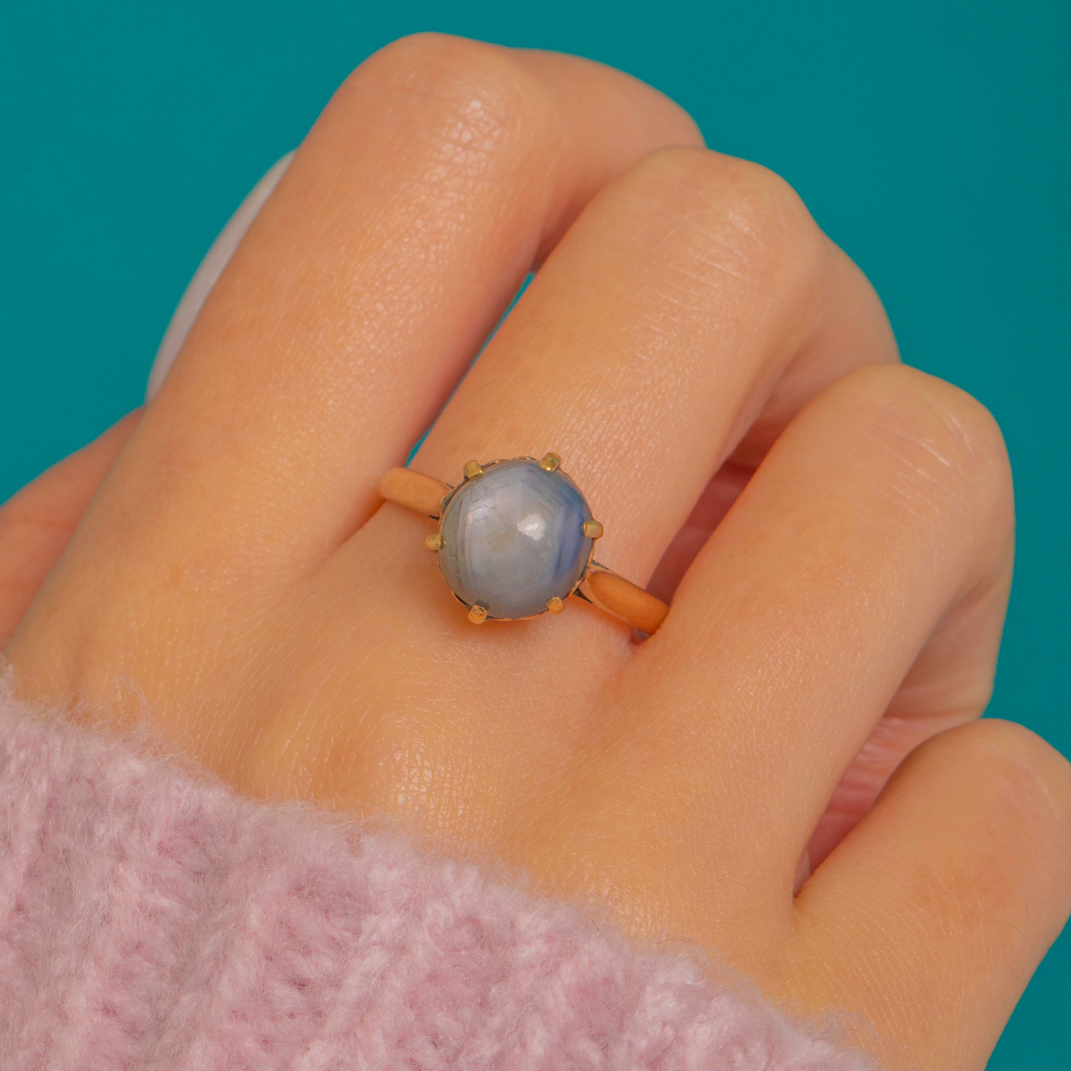 EXCELLENT: The Natural Star Blue Sapphire displays only light surface abrasions consistent with gentle wear, with no chips or cracks observed. The 15ct Gold coronet setting, claws and slim shank are in lovely condition with minor surface marks and a soft, even patina; the stone sits securely. No visible repairs or resizing marks.