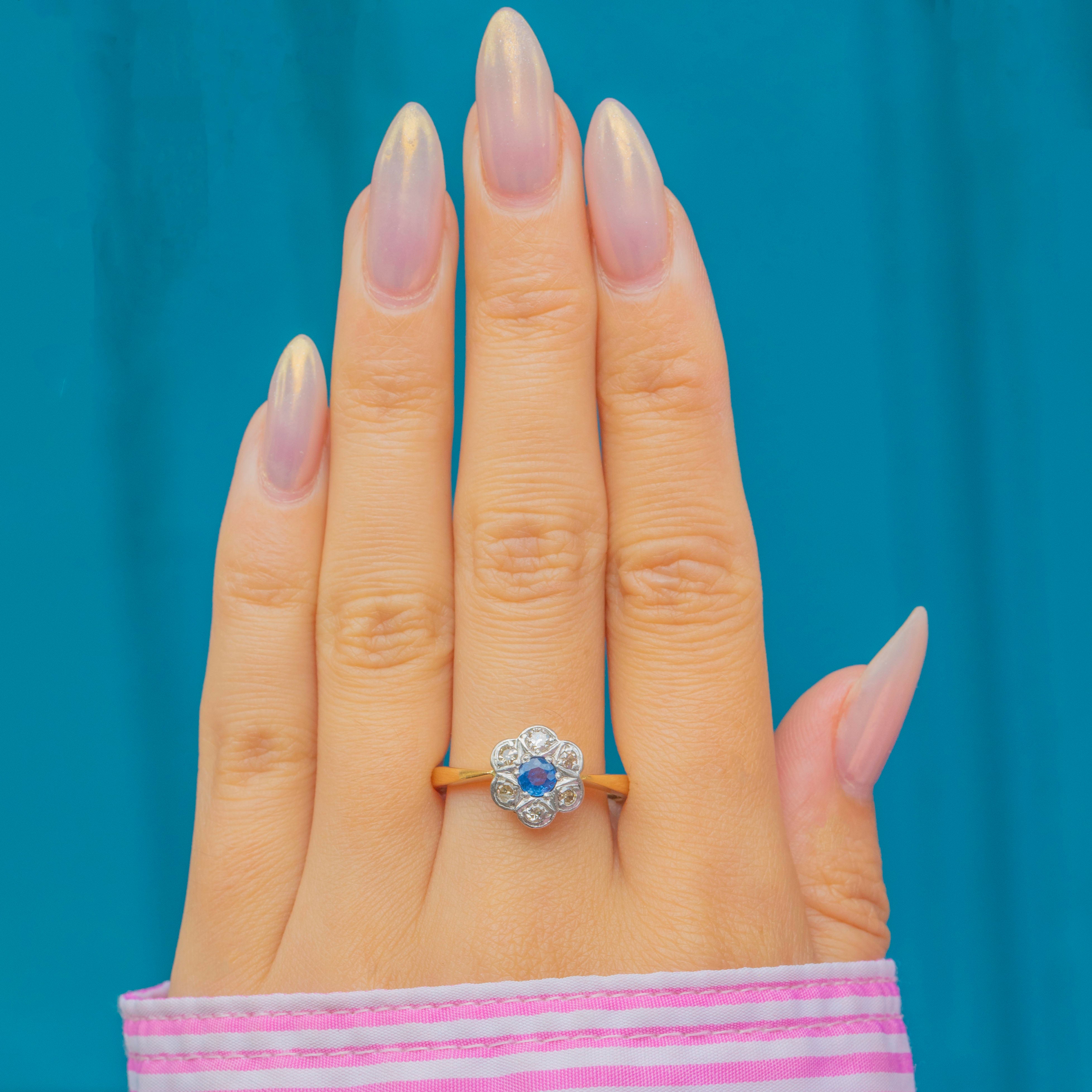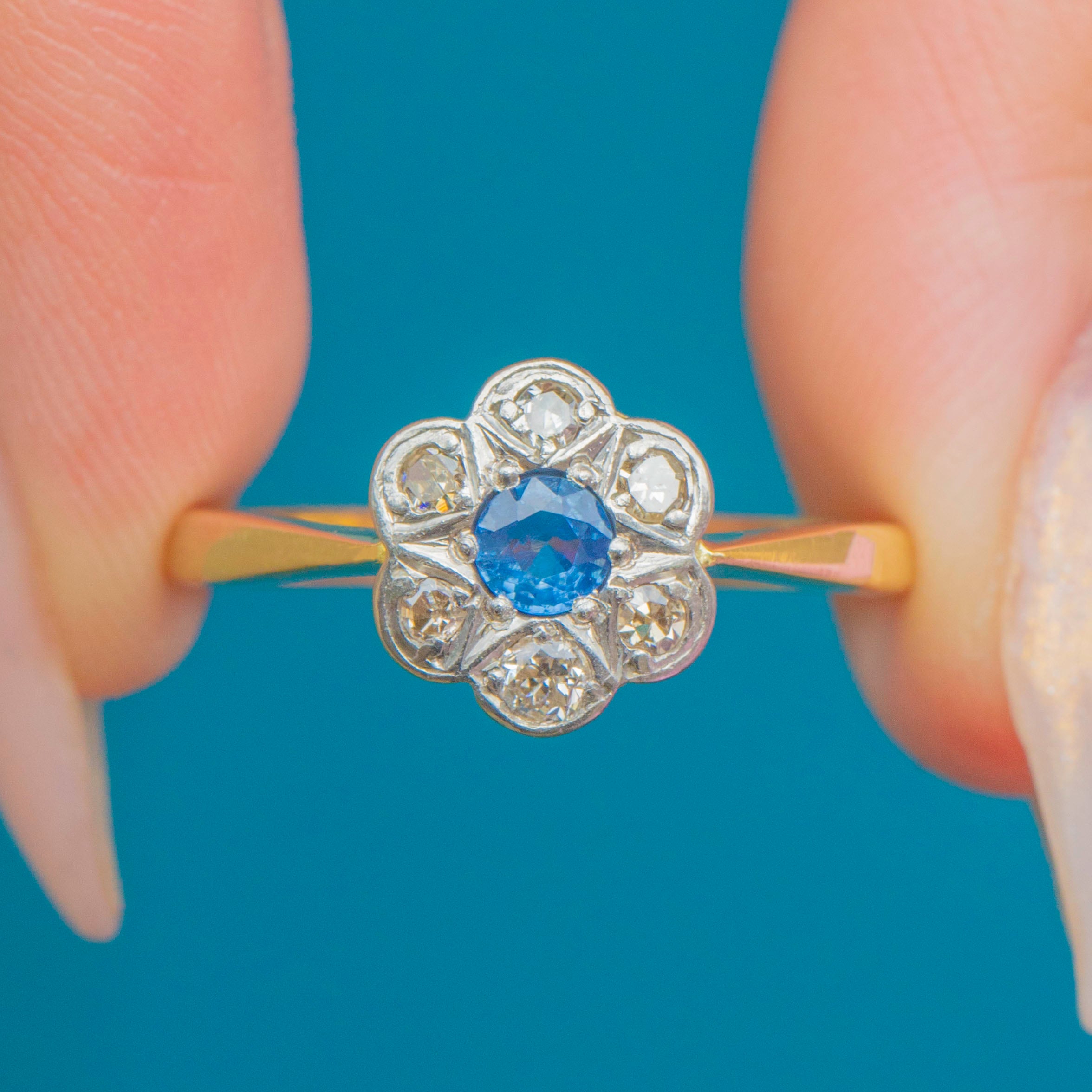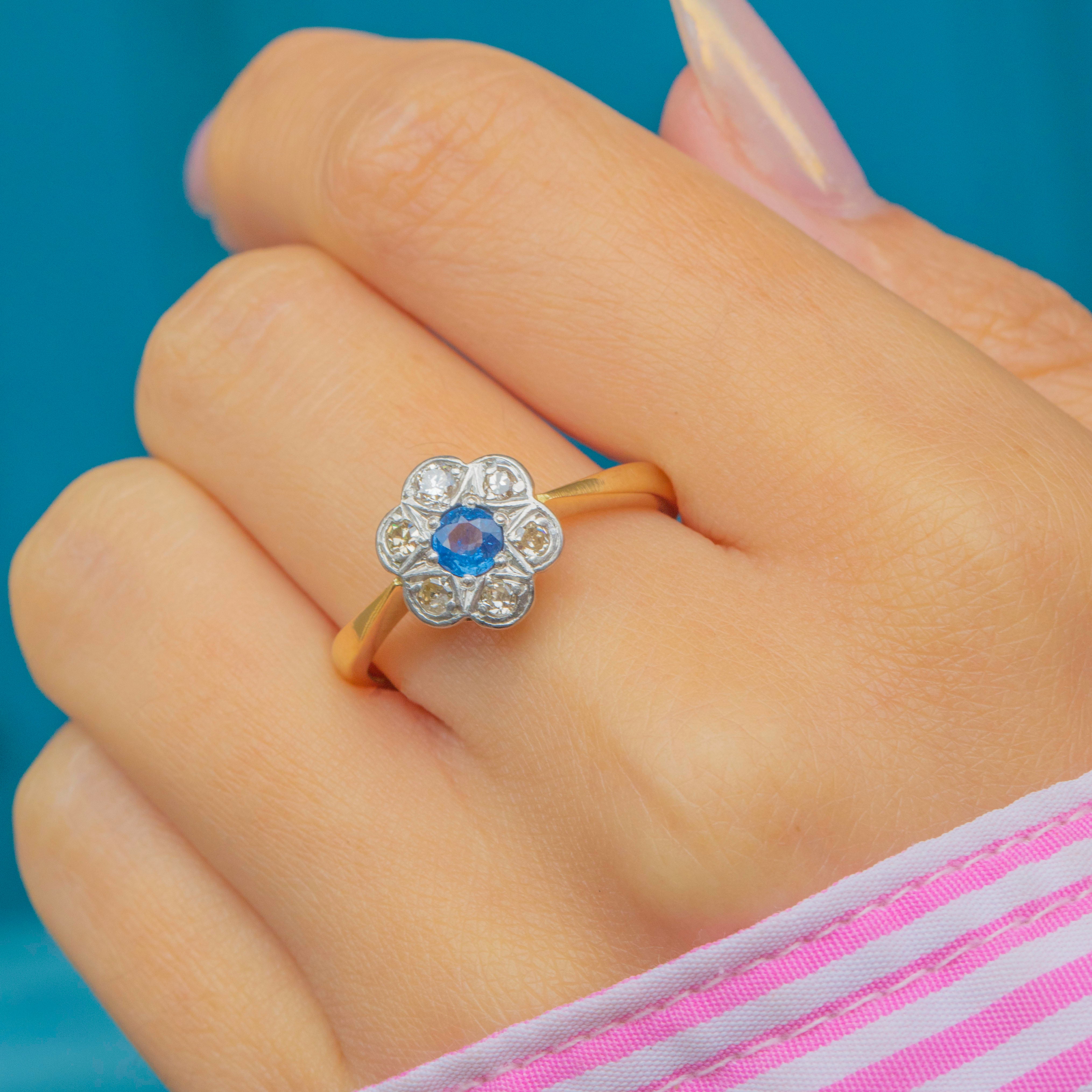 This charming Art Deco ring from the 1920s brings together the timeless daisy cluster form with elegant Deco simplicity. At its centre glows a natural blue Sapphire, unheated and full of character, framed by six sparkling old cut Diamonds. The Platinum-topped settings lend crisp white brilliance, while the 18ct Yellow Gold band gives warmth and contrast.