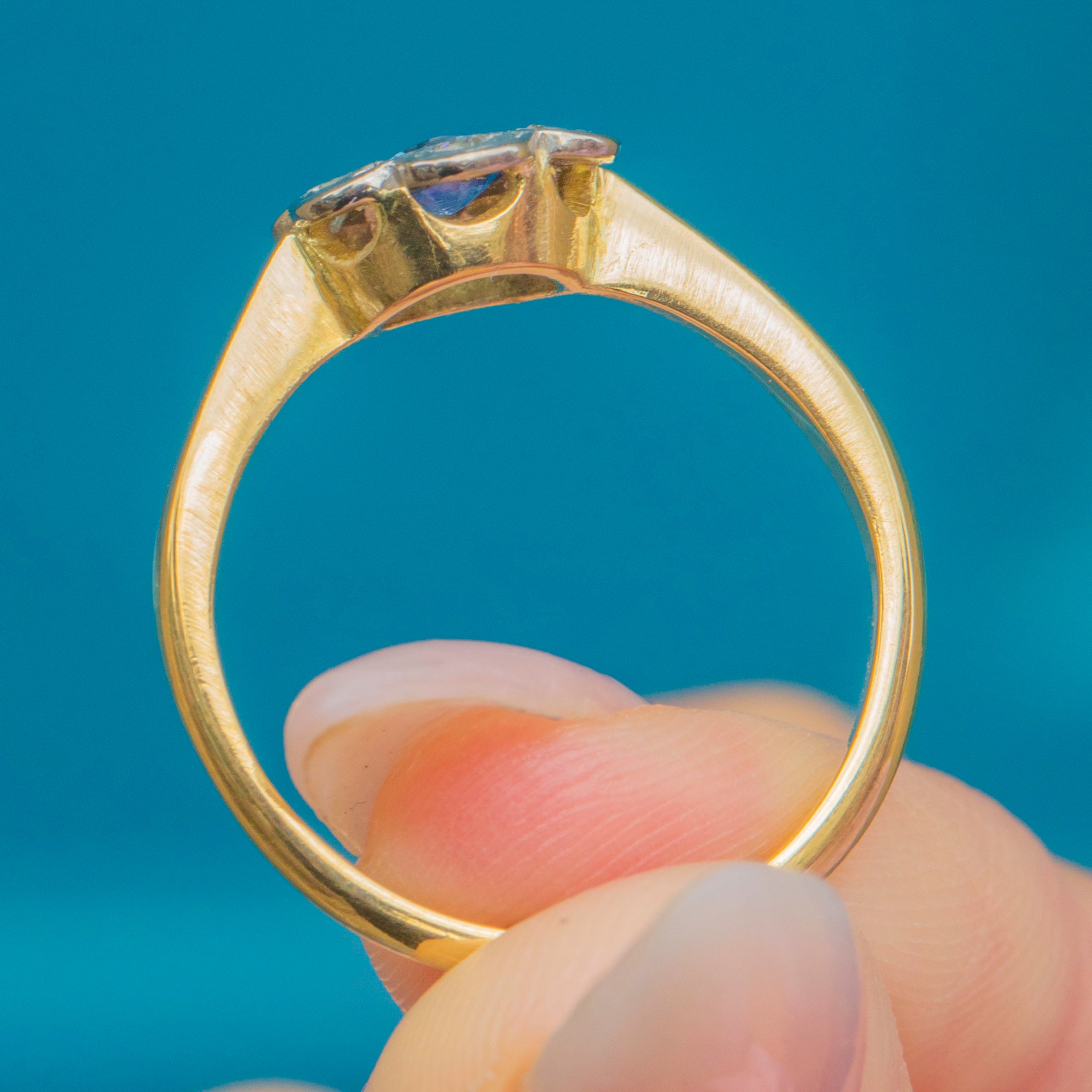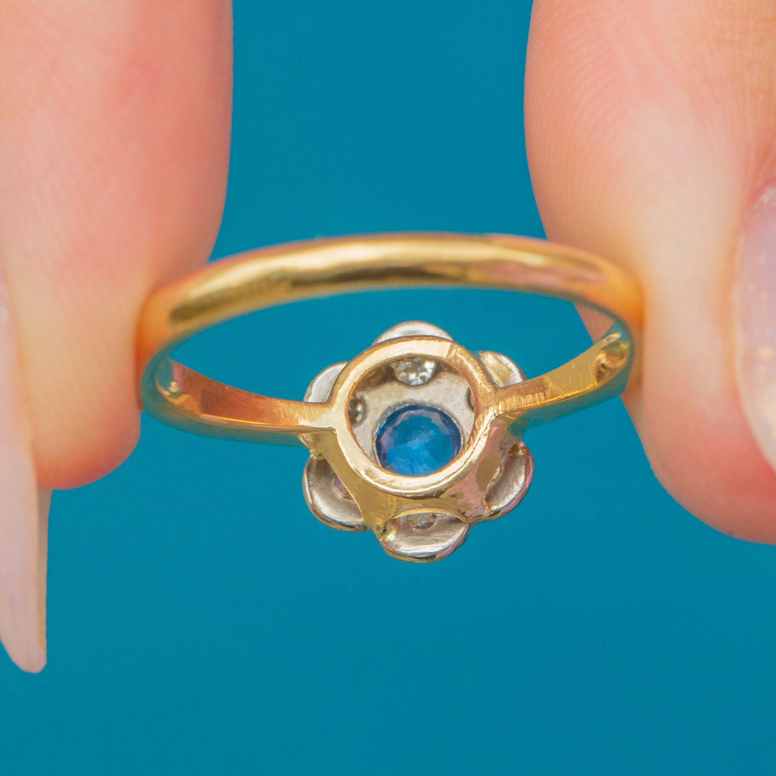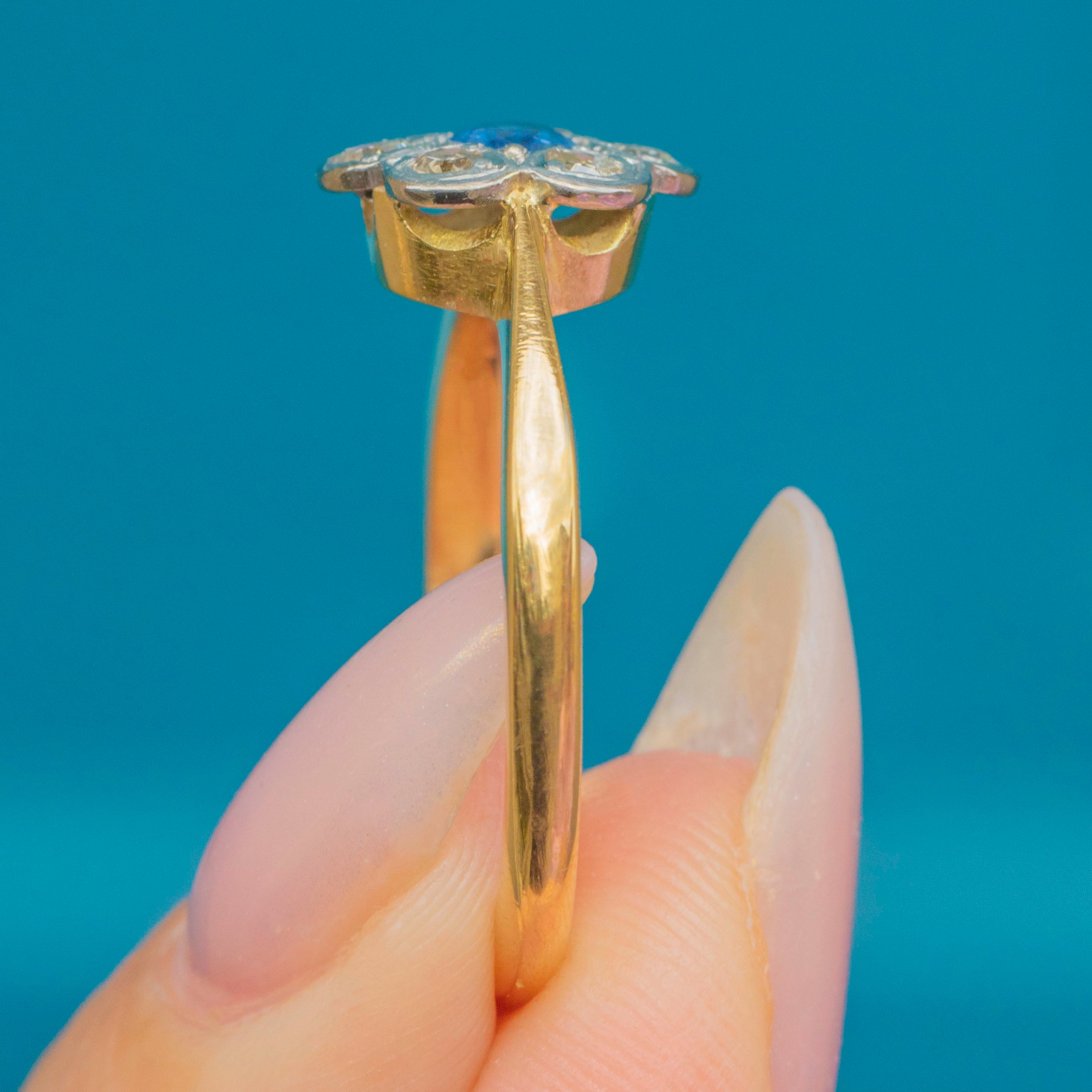 This charming Art Deco ring from the 1920s brings together the timeless daisy cluster form with elegant Deco simplicity. At its centre glows a natural blue Sapphire, unheated and full of character, framed by six sparkling old cut Diamonds. The Platinum-topped settings lend crisp white brilliance, while the 18ct Yellow Gold band gives warmth and contrast.